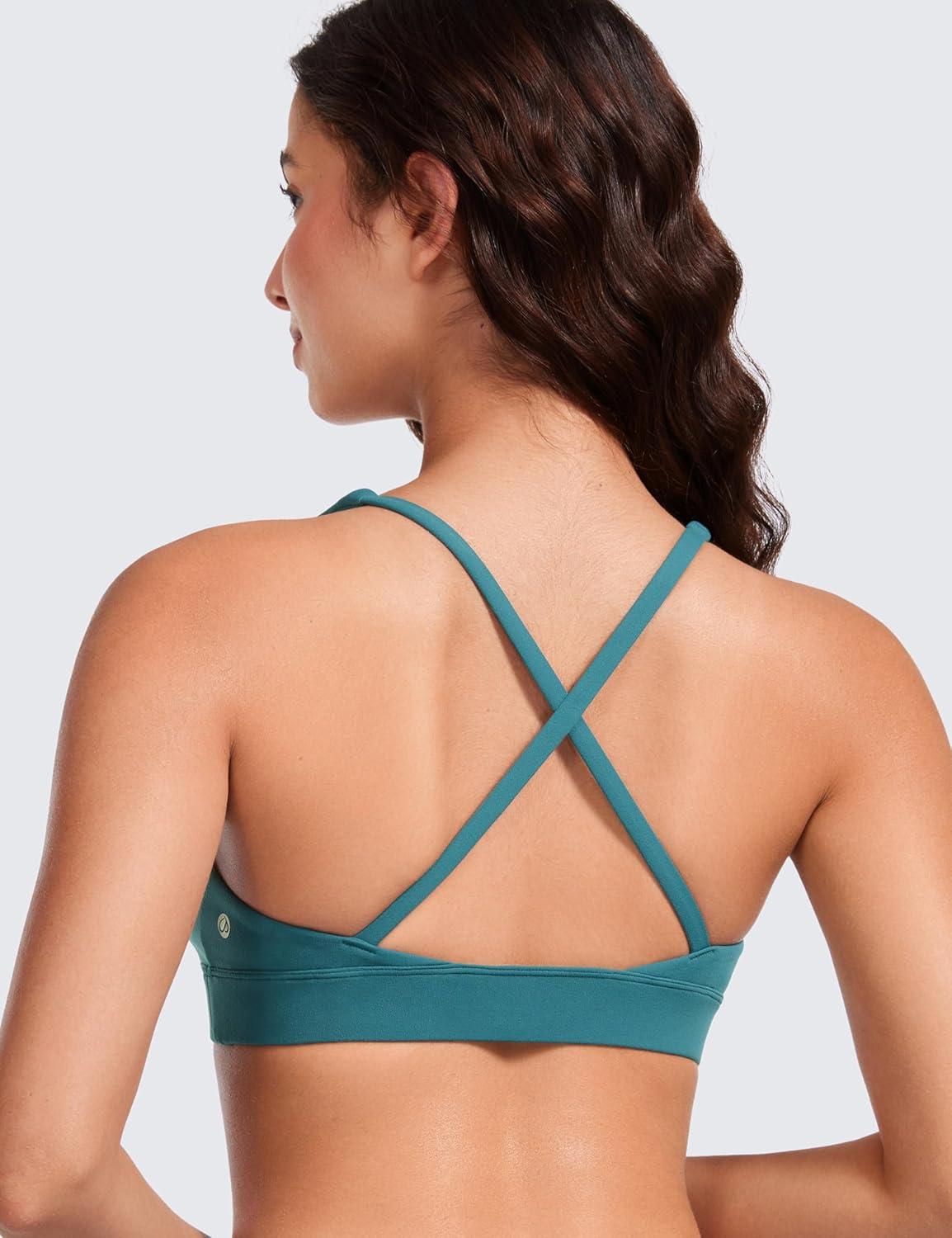 CRZ YOGA Butterluxe Deep V-Neck Sports Bras for Women – Spaghetti Strap Criss Cross Padded Top Low Coverage Wireless Yoga(Green Jade)