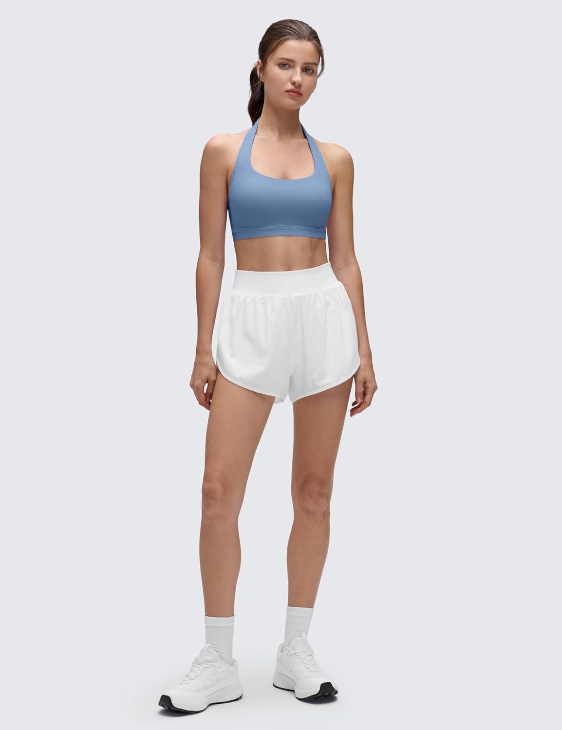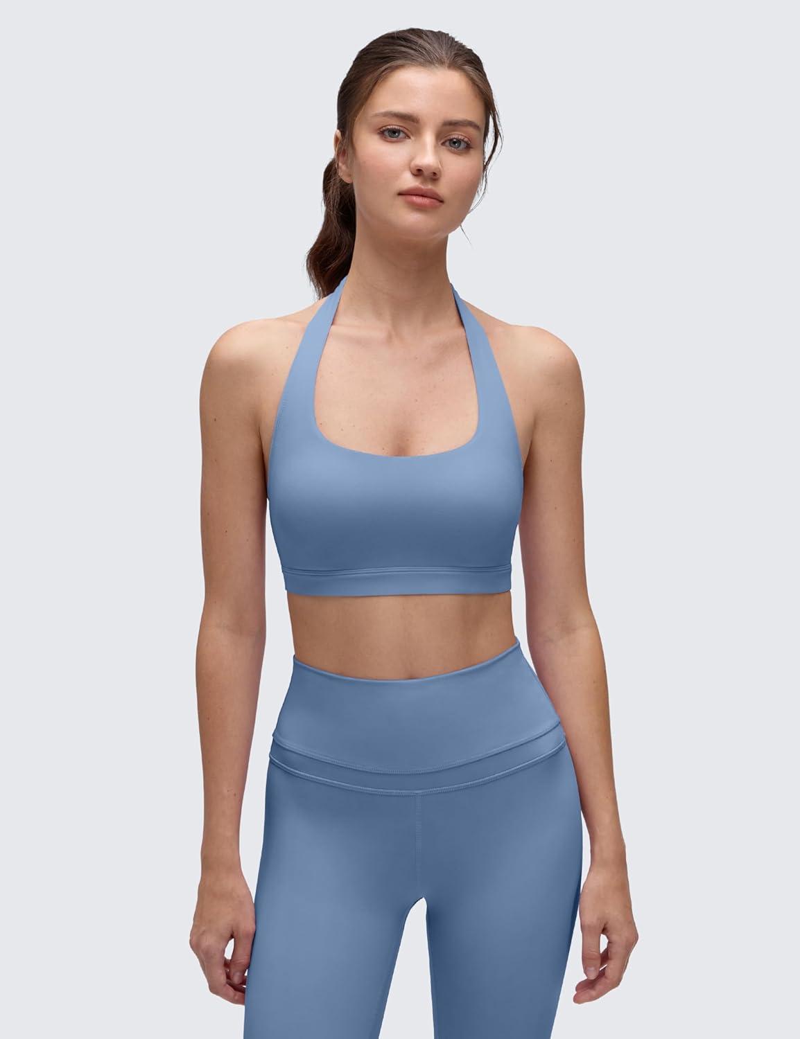 CRZ YOGA Butterluxe Halter Sports Bras for Women – Scoop Neck Padded Open Back Yoga Crop Gym Tops Low Impact(Oasis Blue)
