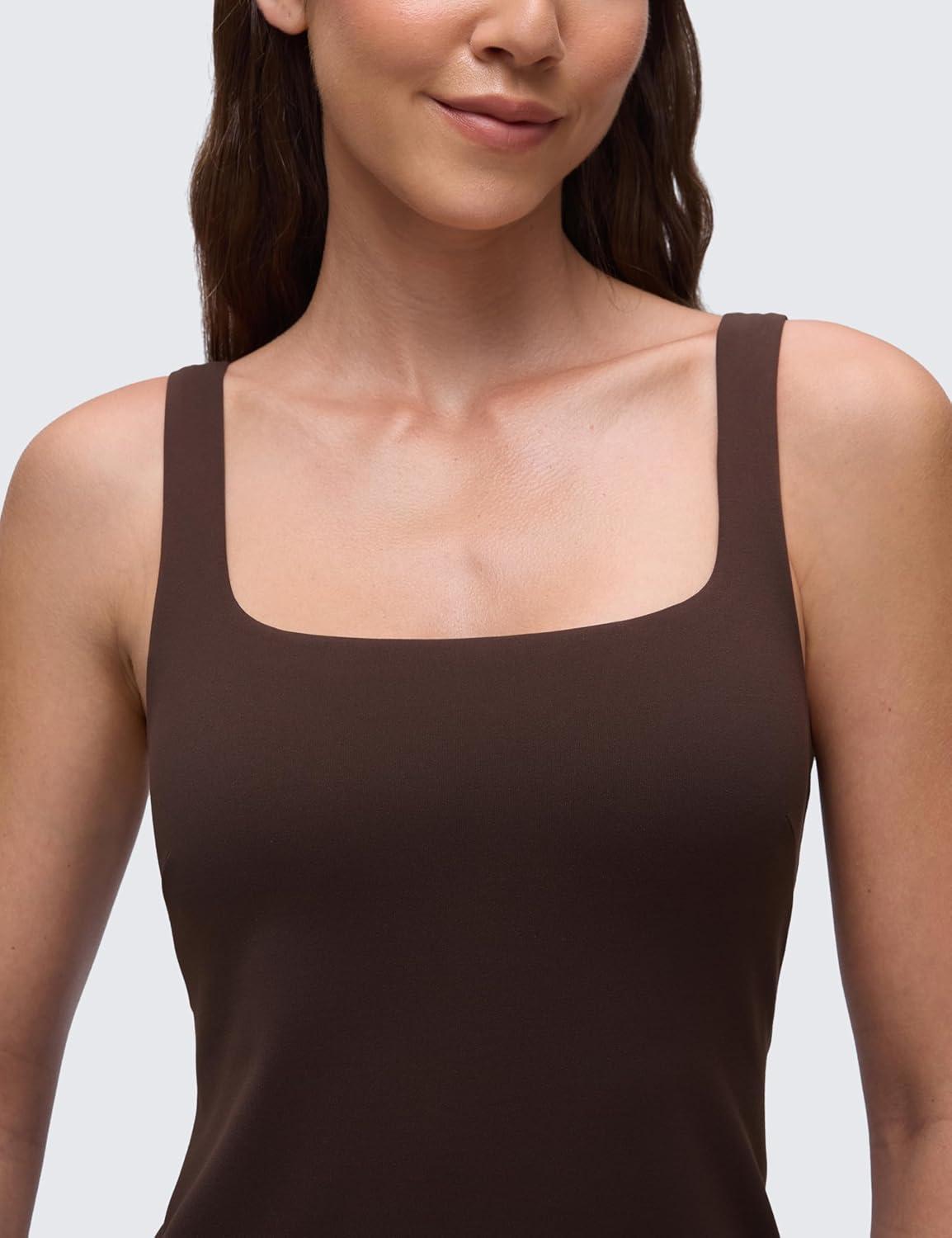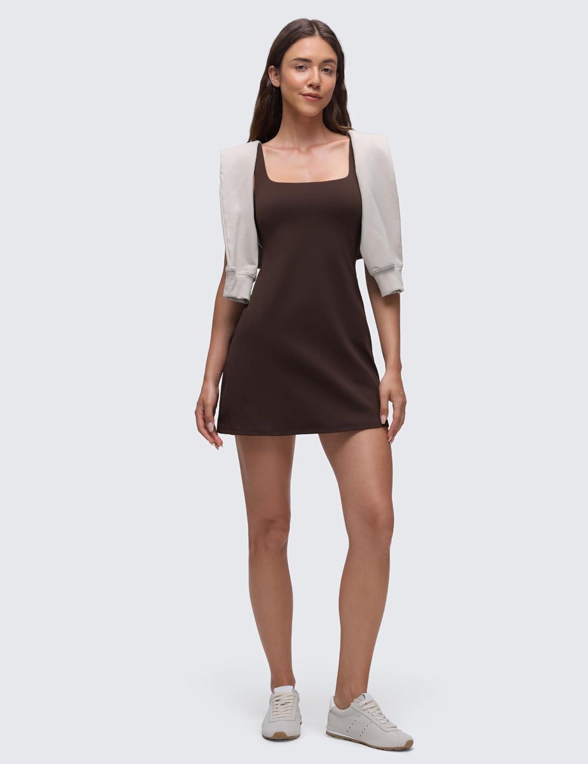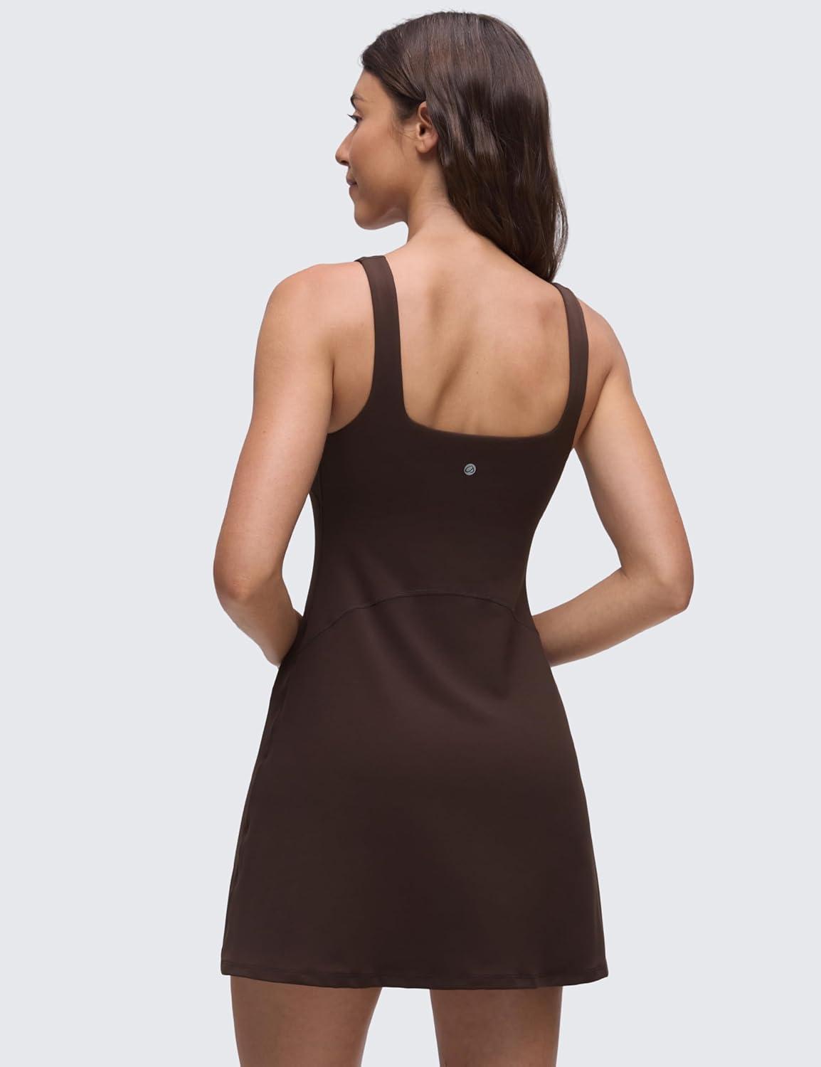 CRZ YOGA Butterluxe Linerless Square Neck Tennis Dress for Women – A Line Casual Outfits with Shelf Bra No Built-in Shorts(Hot Fudge Brown)