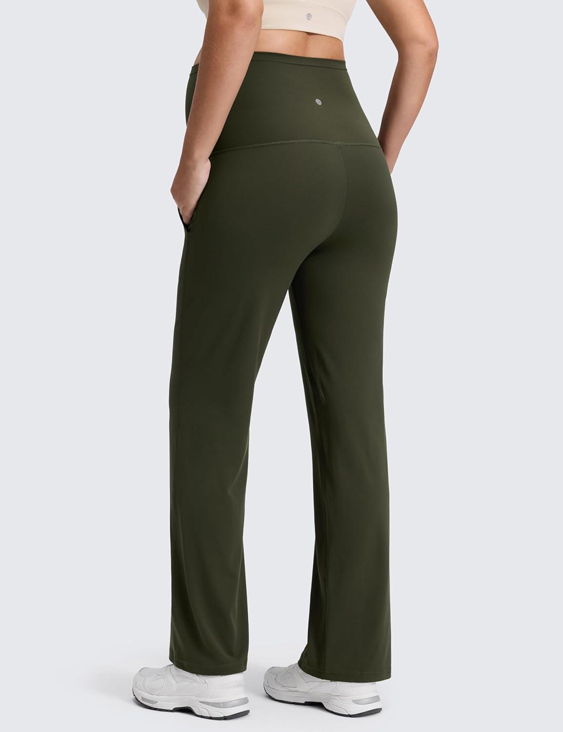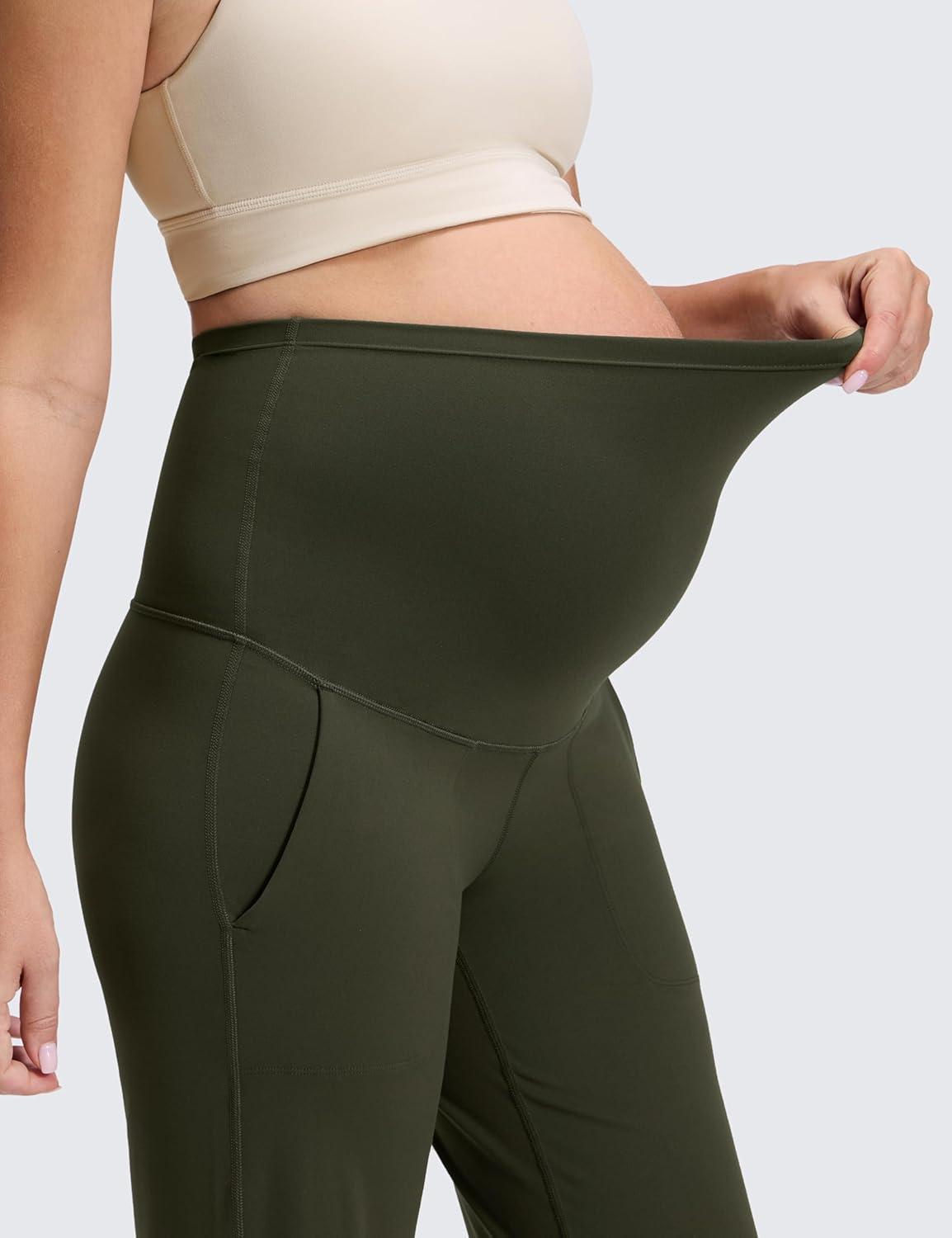 CRZ YOGA Butterluxe Maternity Wide Leg Pants Pockets 31.5″ – Over The Belly Workout Yoga Lounge Womens Pregnancy(Olive Green)