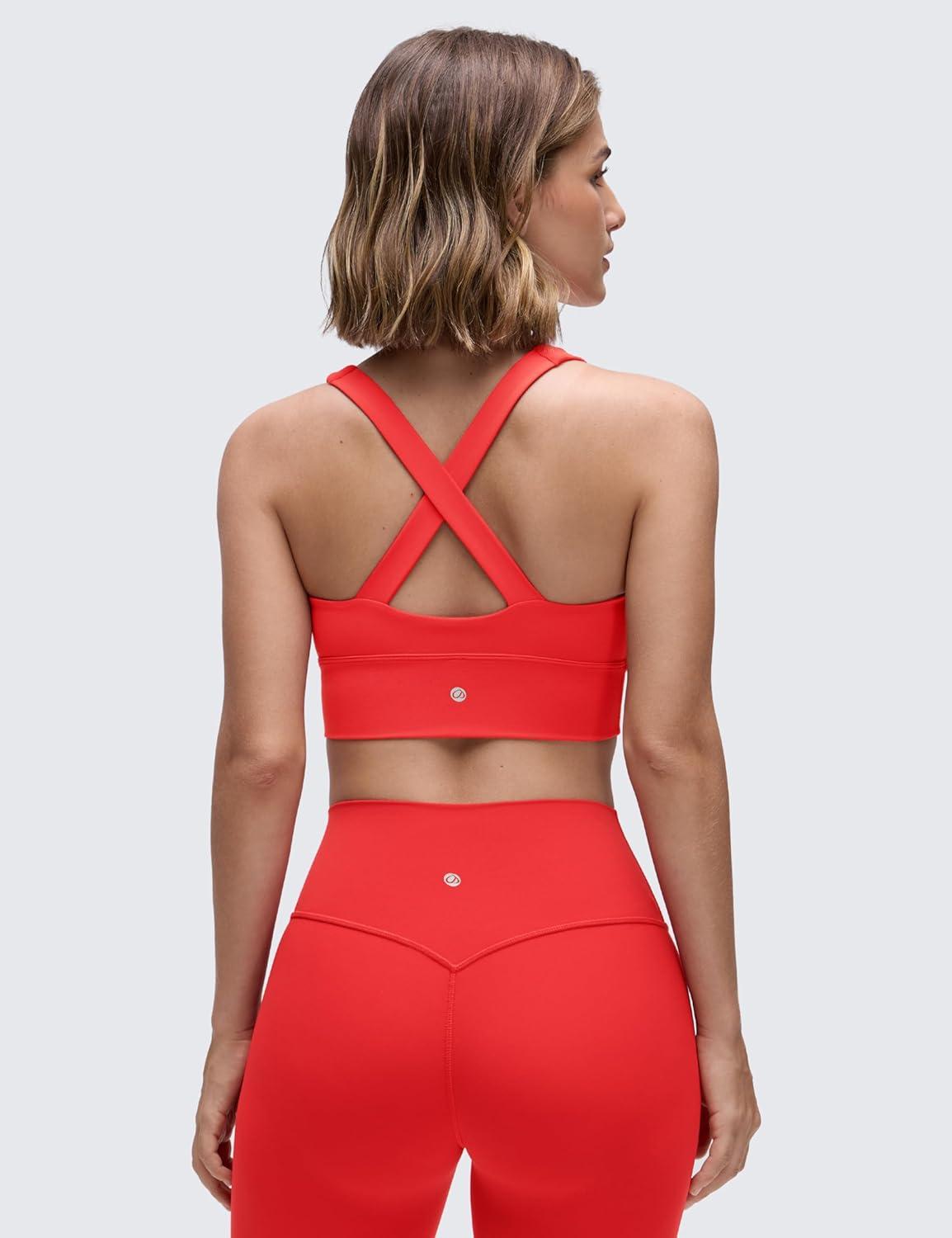 CRZ YOGA Butterluxe Ruched Longline Sports Bras for Women – V Neck Padded Yoga Tank Wide Straps Cross Back Crop Tops(Deep Red)