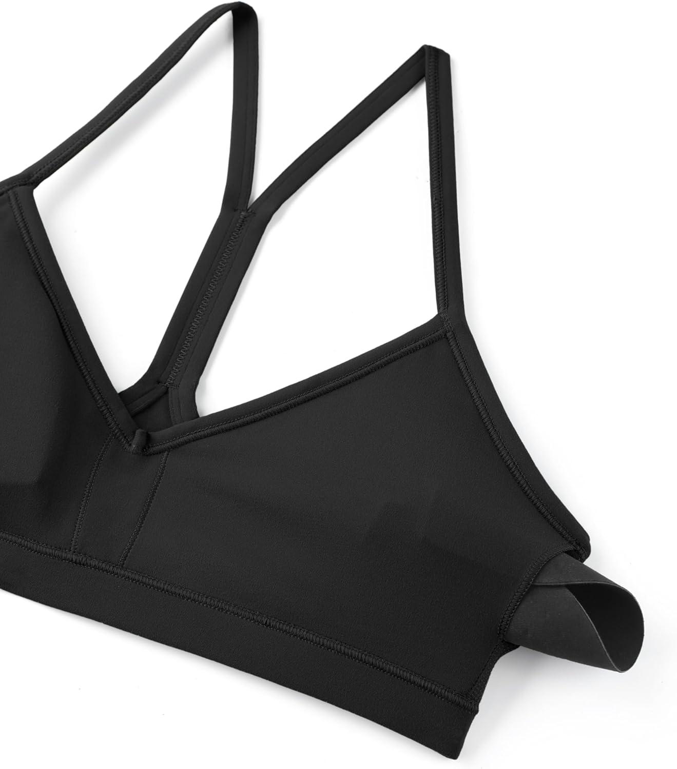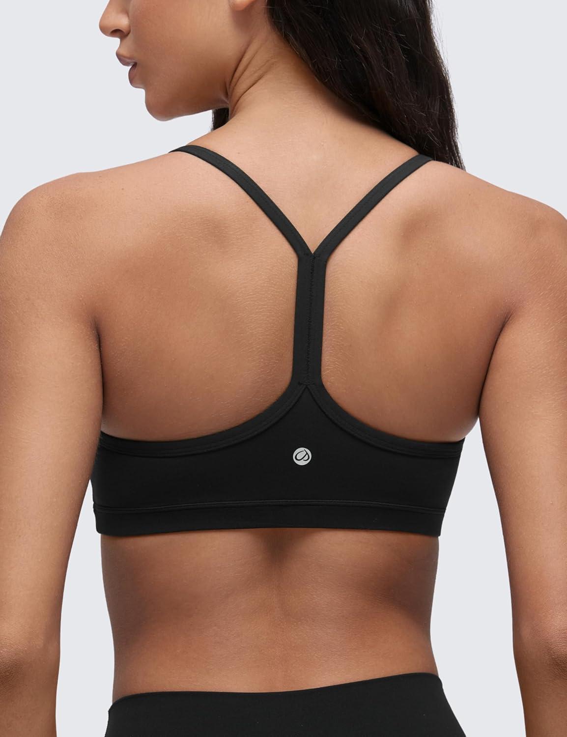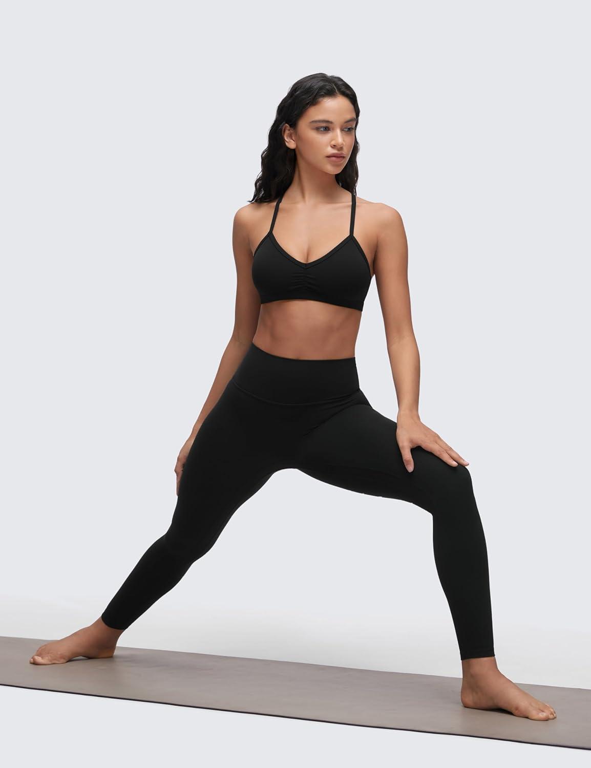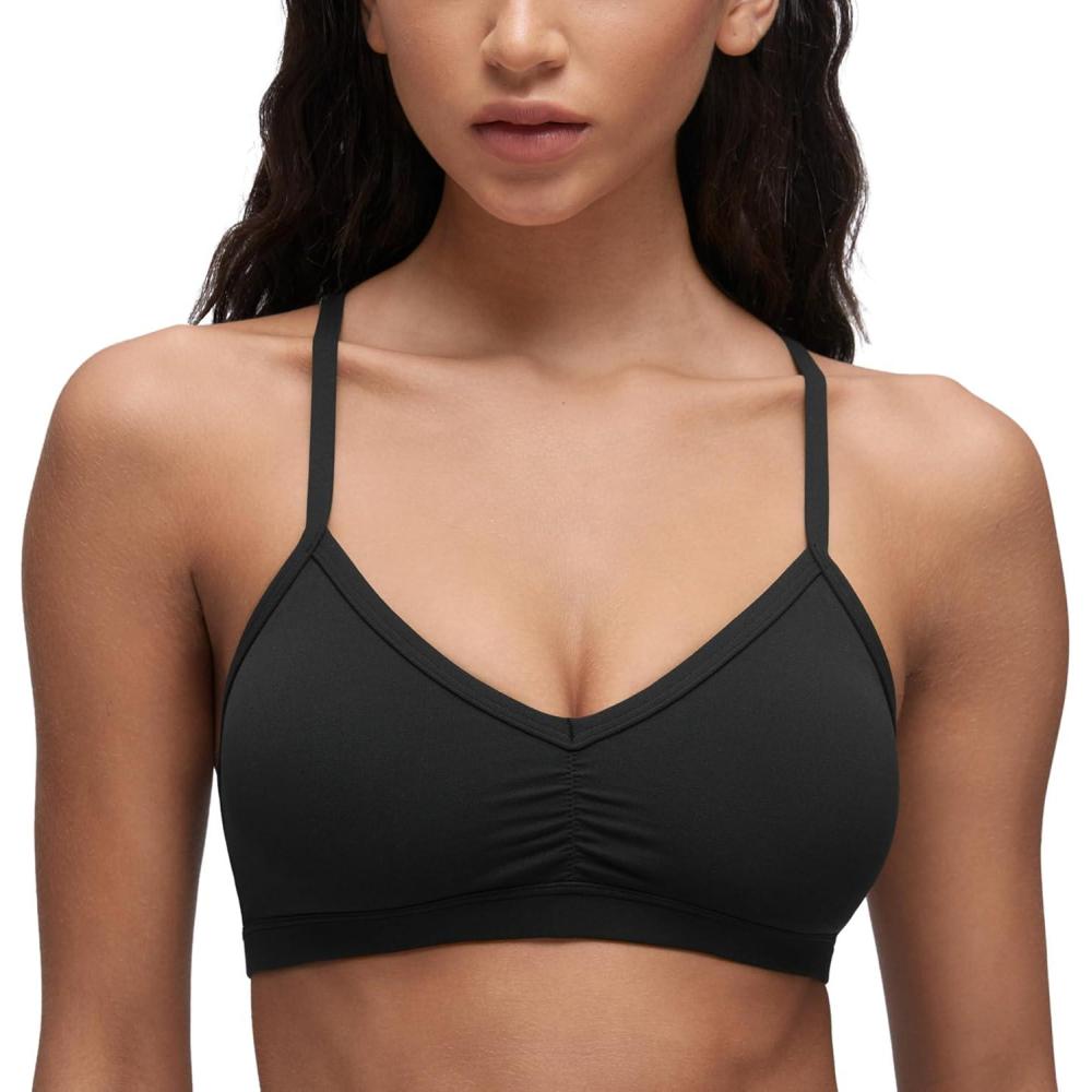 CRZ YOGA Butterluxe Ruched Sports Bras for Women – V Neck Spaghetti Thin Strap Y Back Wireless Padded Yoga Crop Top(Black)