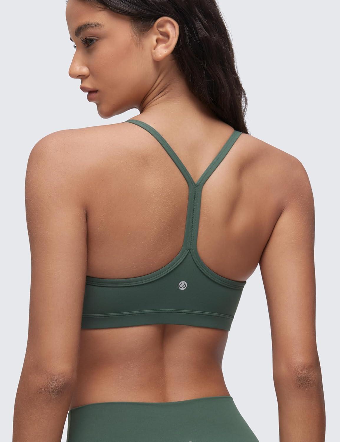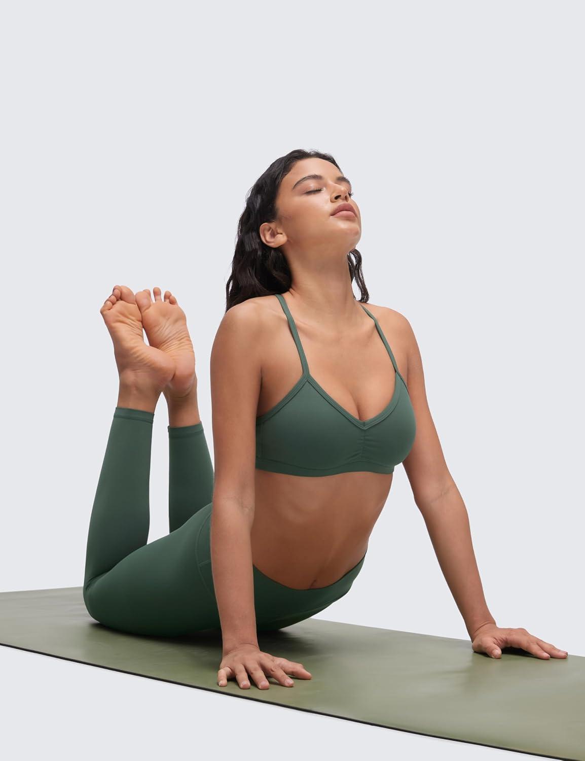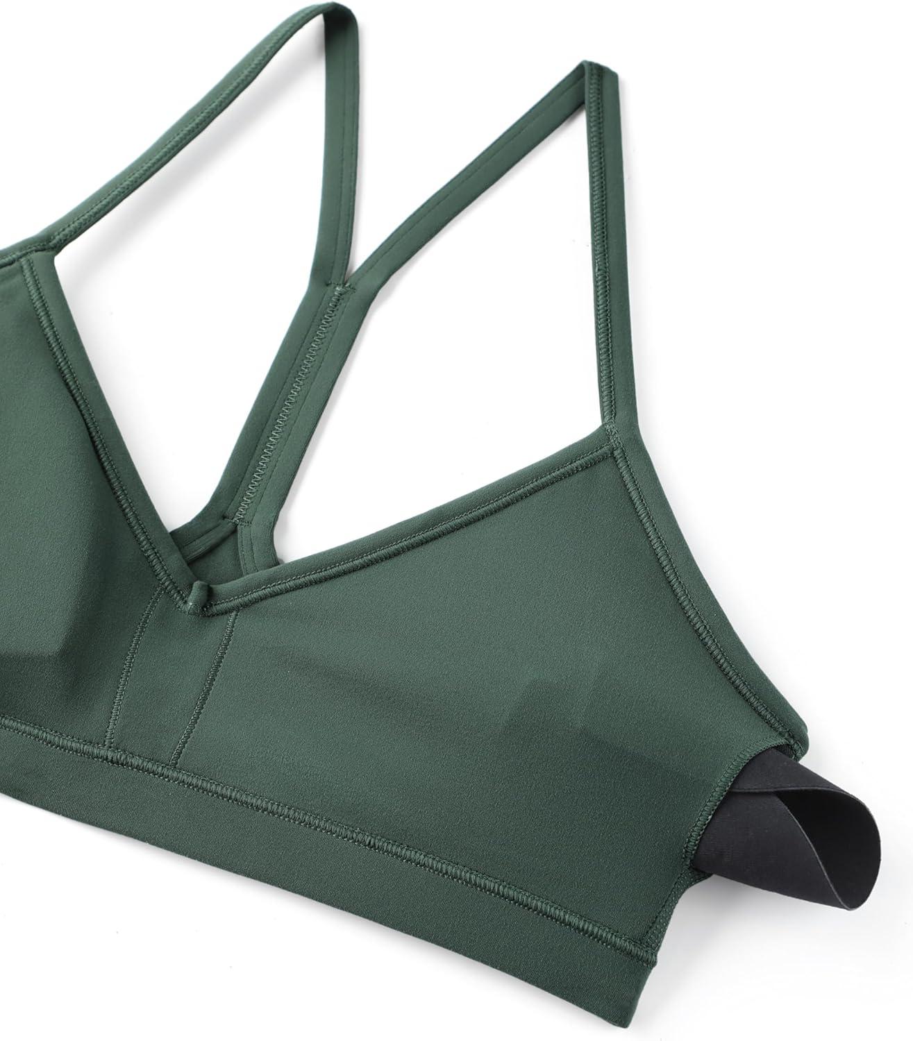 CRZ YOGA Butterluxe Ruched Sports Bras for Women – V Neck Spaghetti Thin Strap Y Back Wireless Padded Yoga Crop Top(Dark Forest Green)