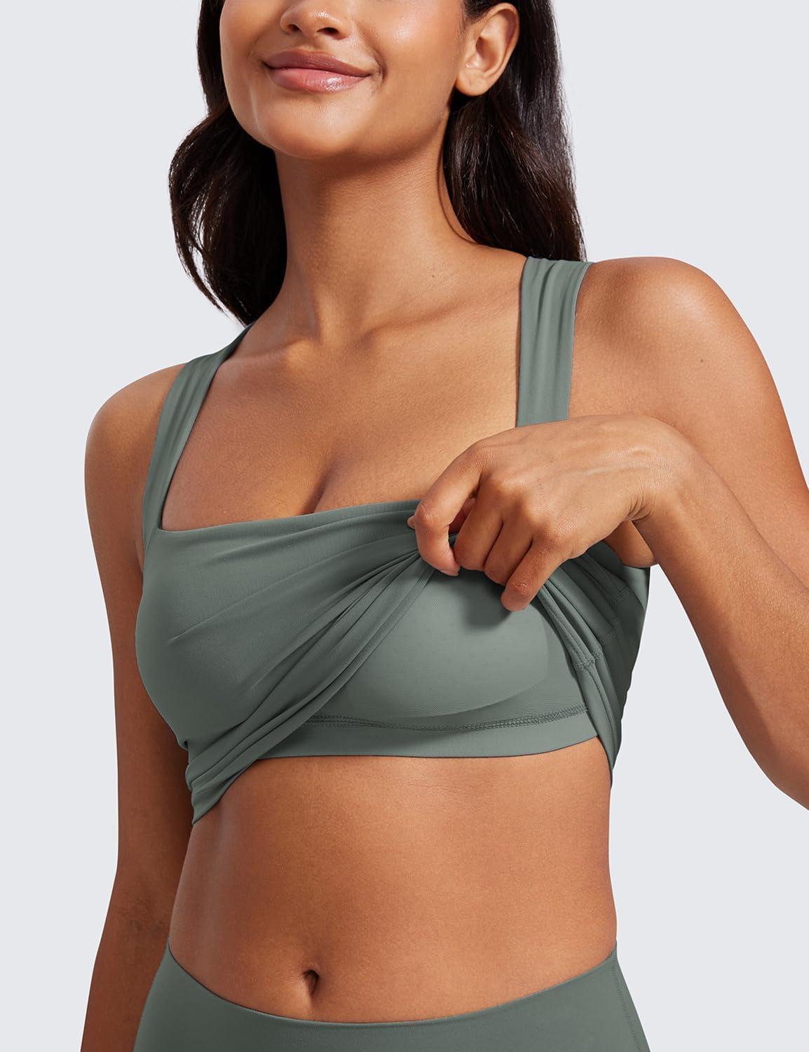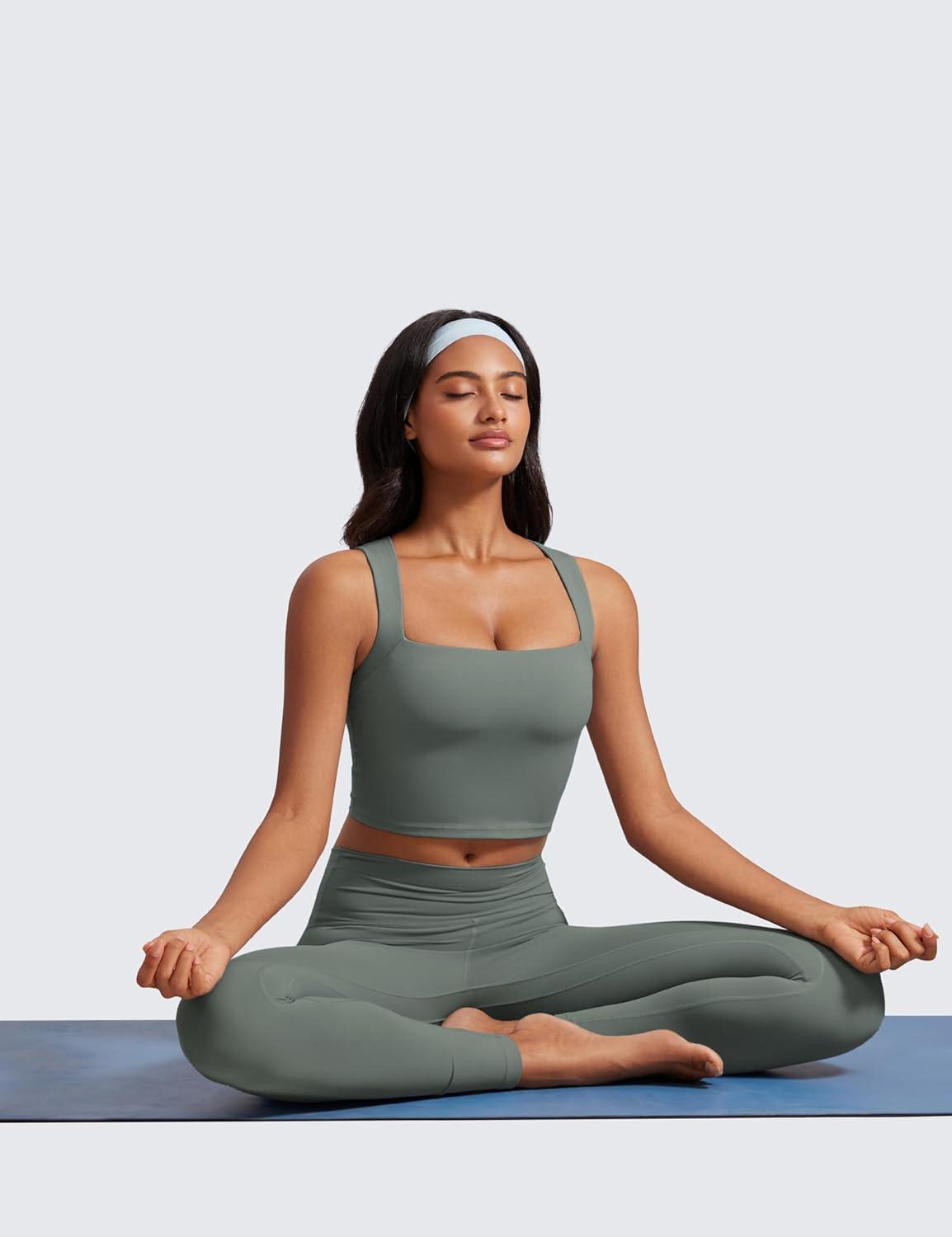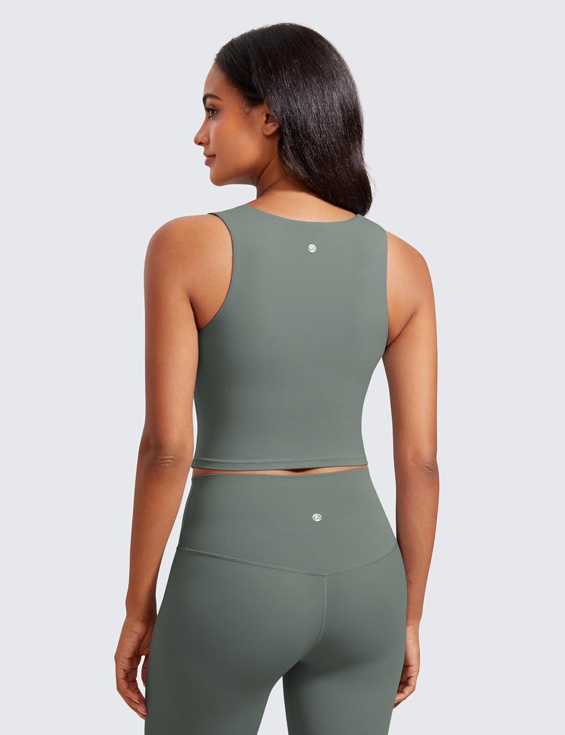 CRZ YOGA Butterluxe Womens Longline Square Neck Sports Bras – Basic Crop Tank Yoga Workout Tops with Built in Pads(Grey Sage)