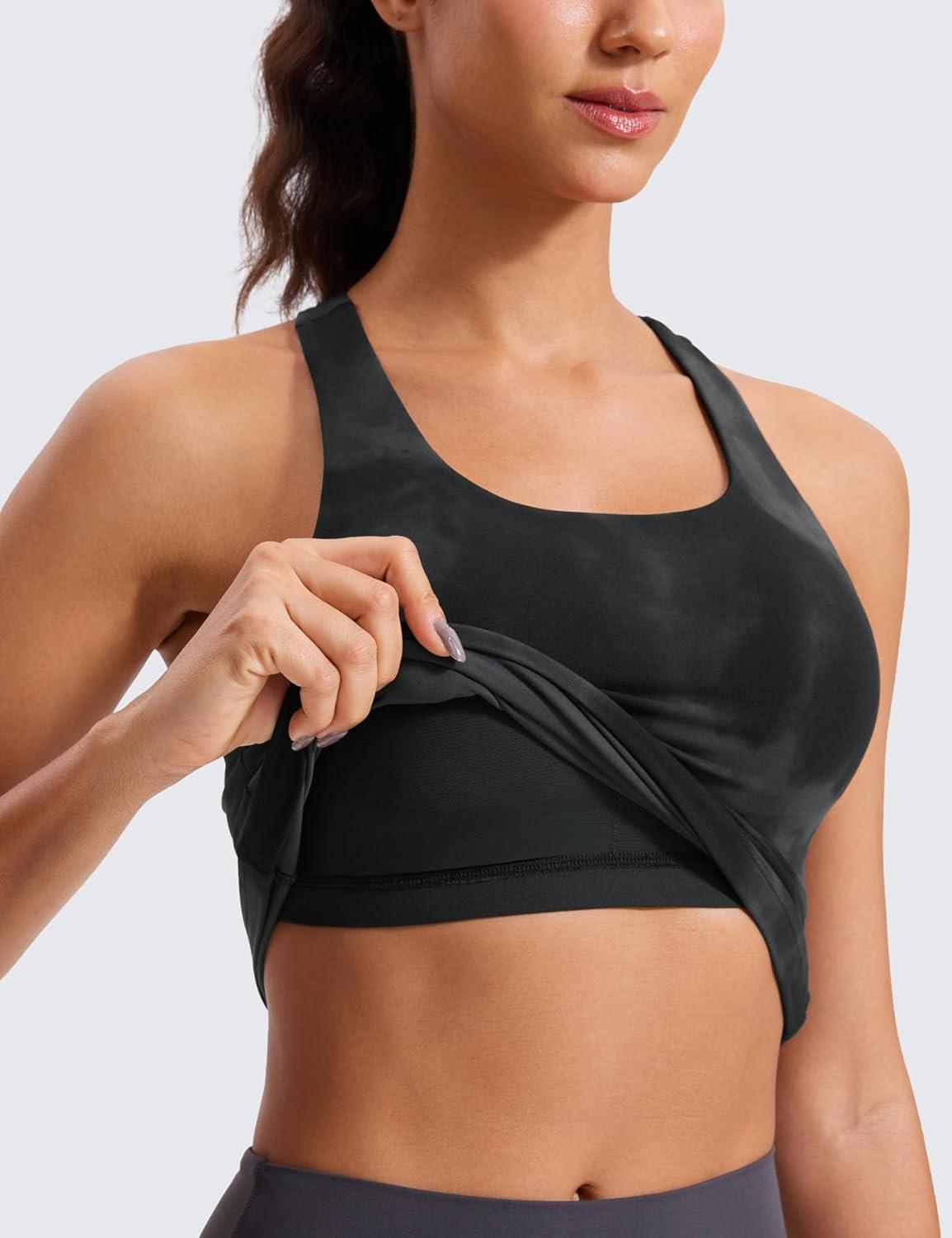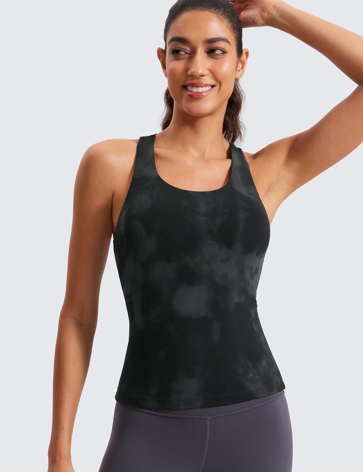 CRZ YOGA Butterluxe Workout Racerback Tank Tops for Women – Padded Athletic Spandex Yoga Shirts with Built in Bra(Black Tie Dye Flowers)