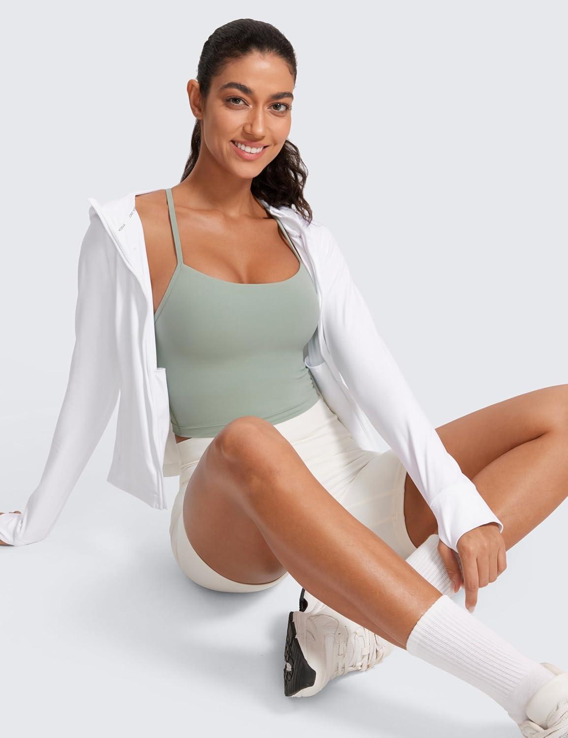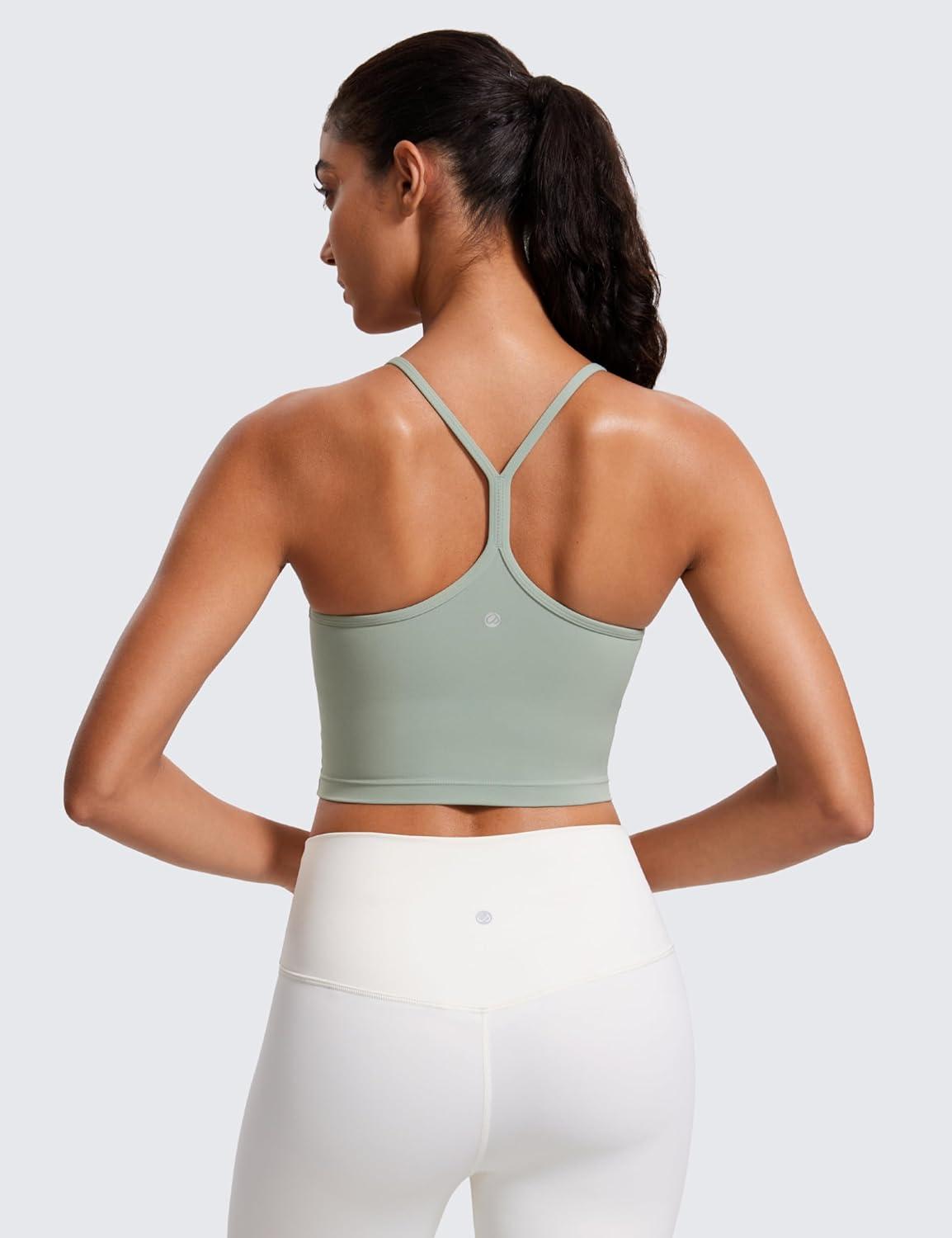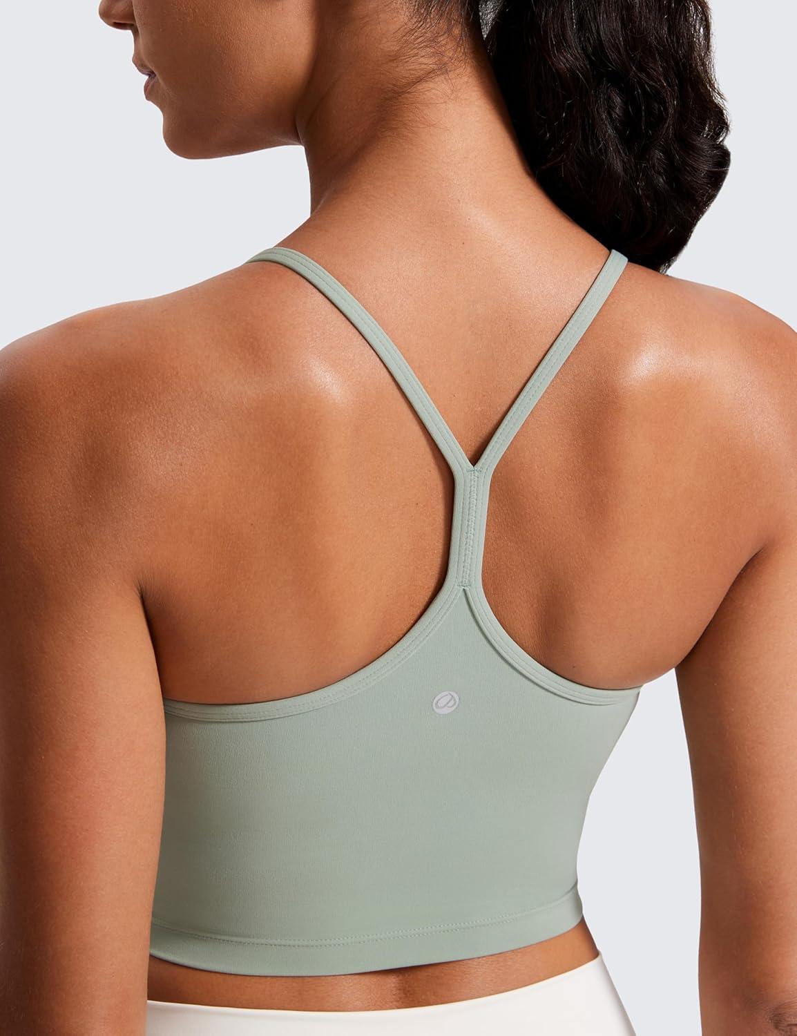 CRZ YOGA Butterluxe Y Back Crop Tank Tops for Women – Spaghetti Straps Racerback Padded Yoga Workout Longline Sports Bras(Green Palm Court)