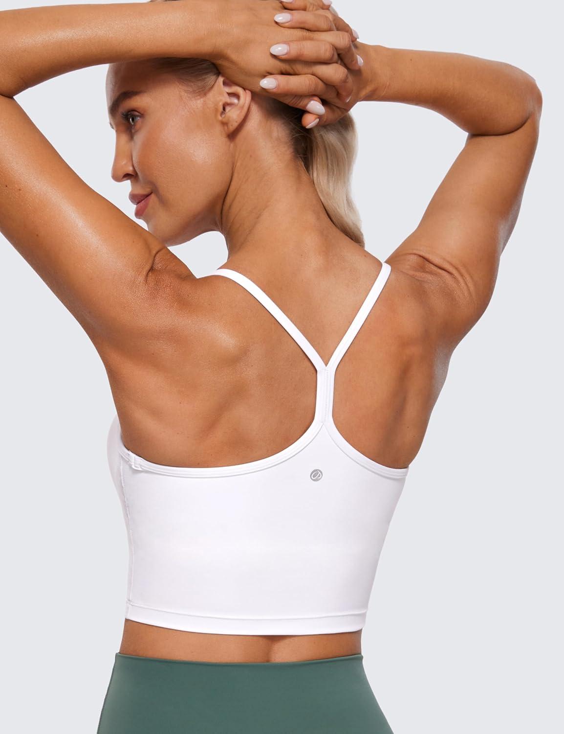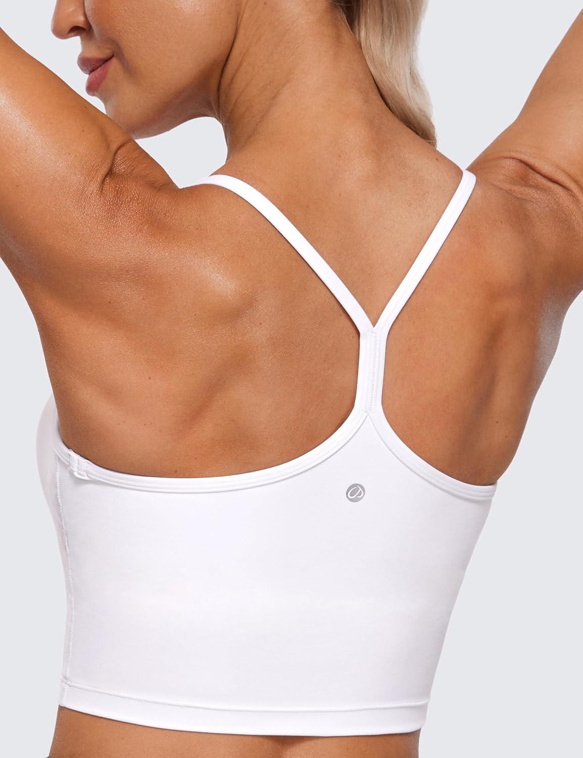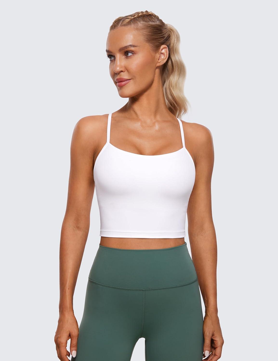 CRZ YOGA Butterluxe Y Back Crop Tank Tops for Women – Spaghetti Straps Racerback Padded Yoga Workout Longline Sports Bras(White)