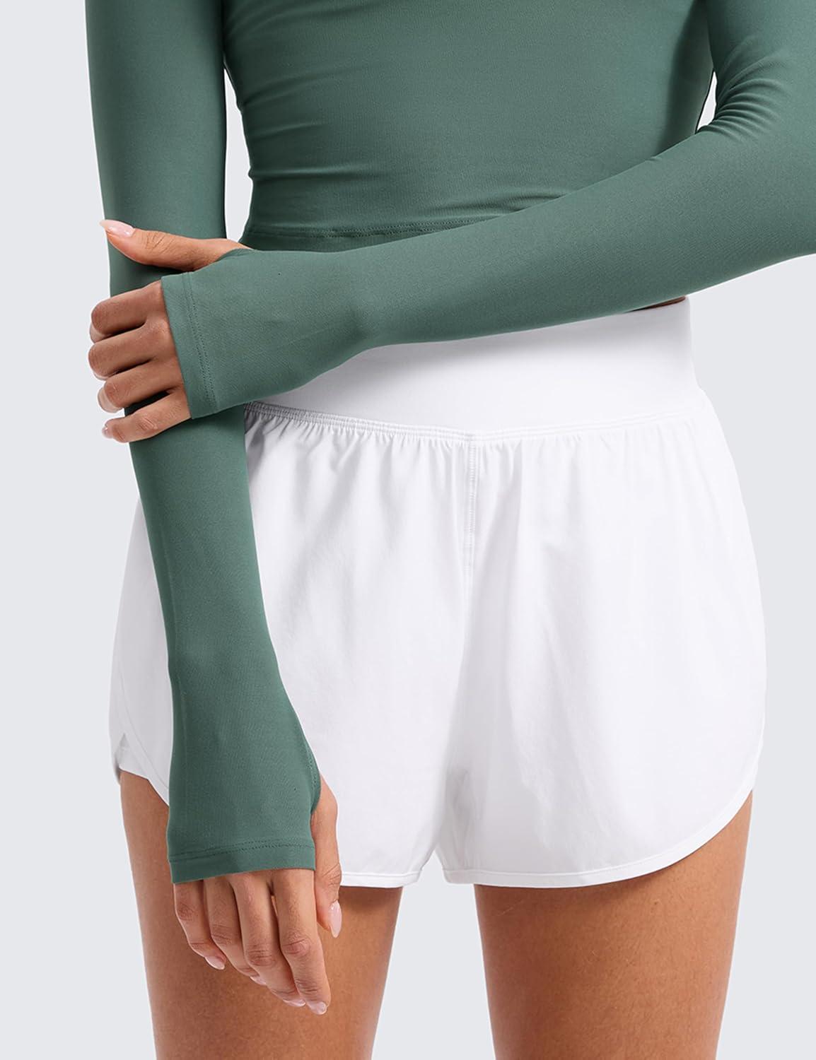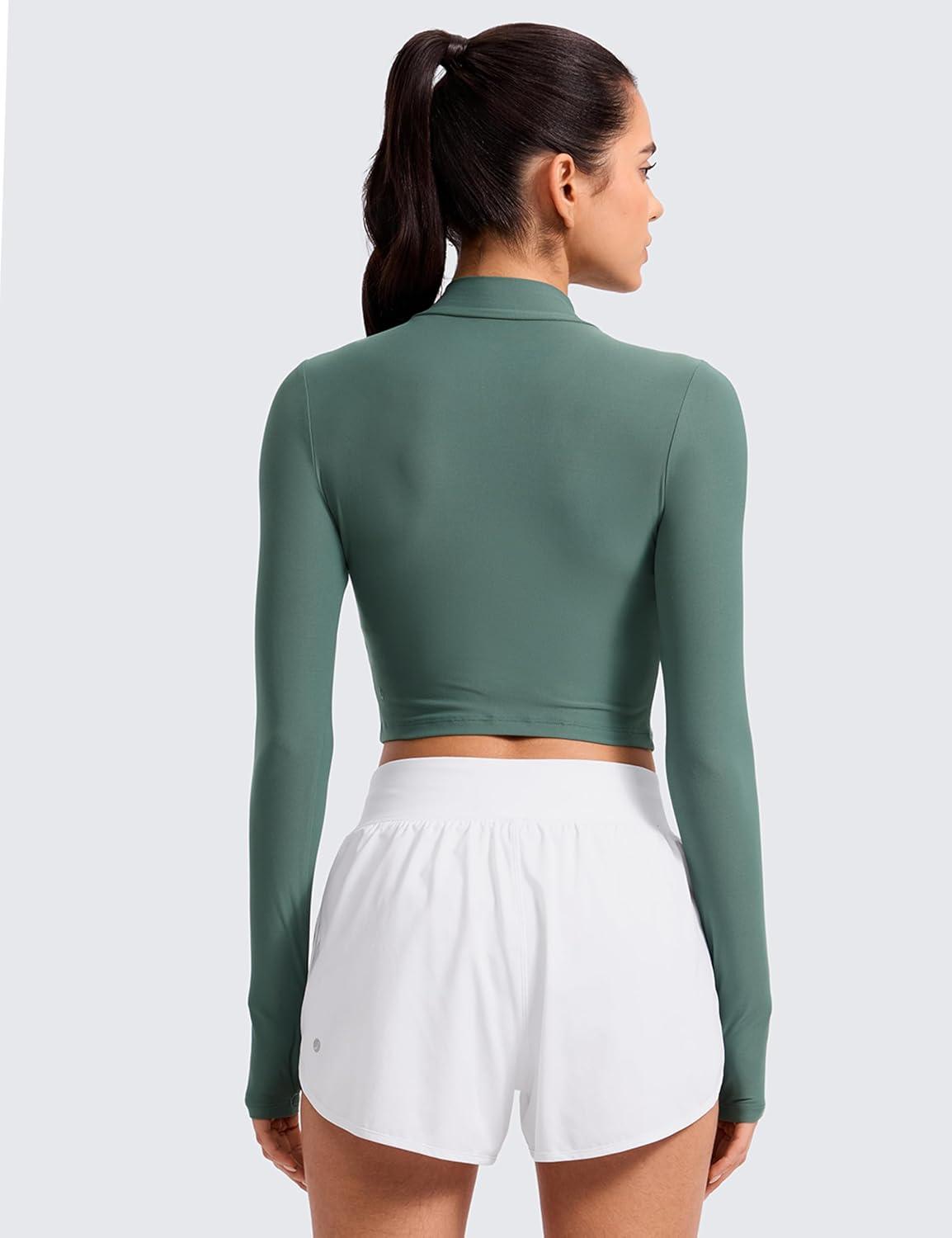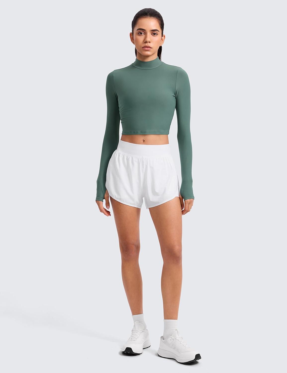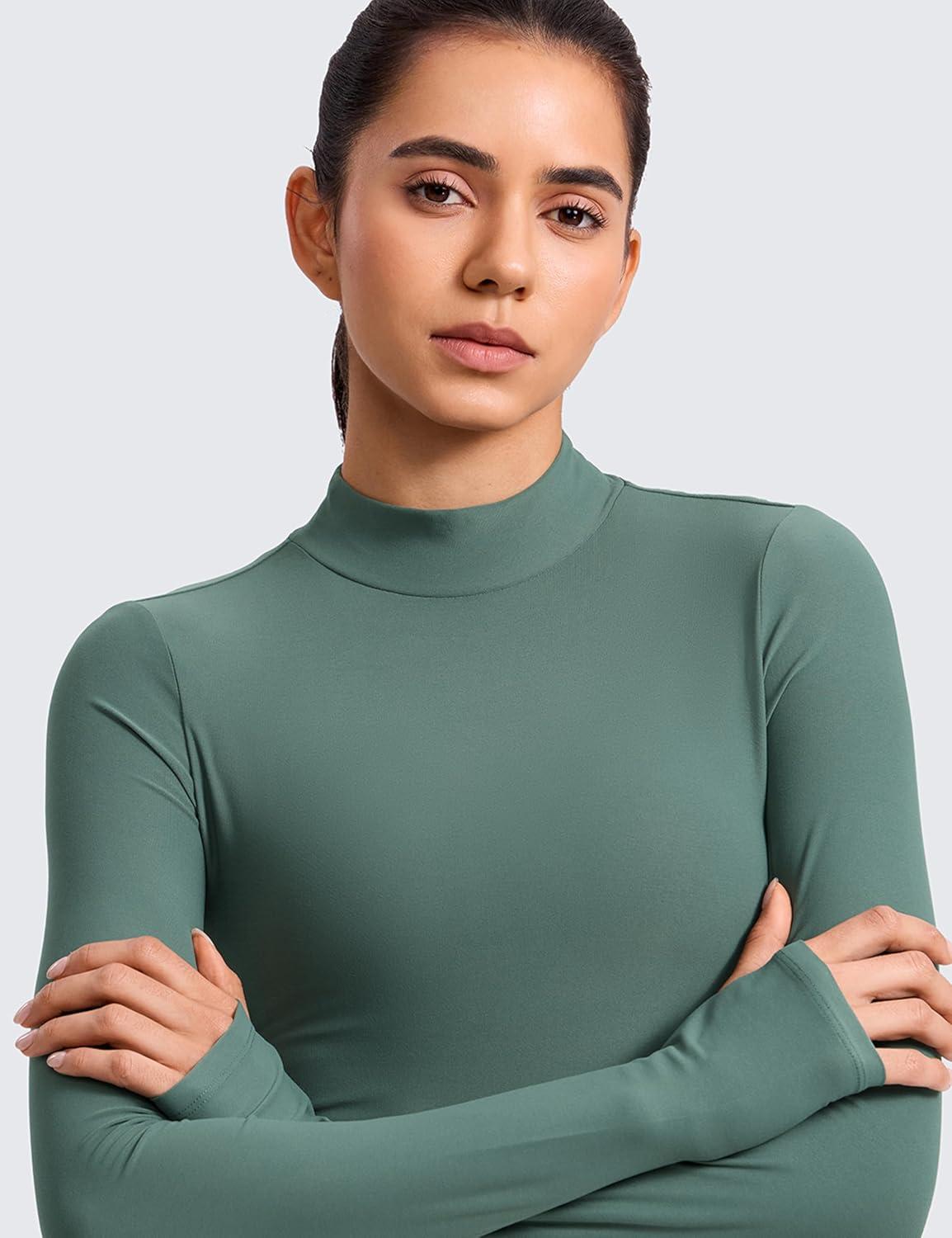 CRZ YOGA Cloudweight Crop Mock Neck Shirts for Women – Workout Athletic Gym Long Sleeve Tops Soft T-Shirt with Thumb Hole(Graphite Green)