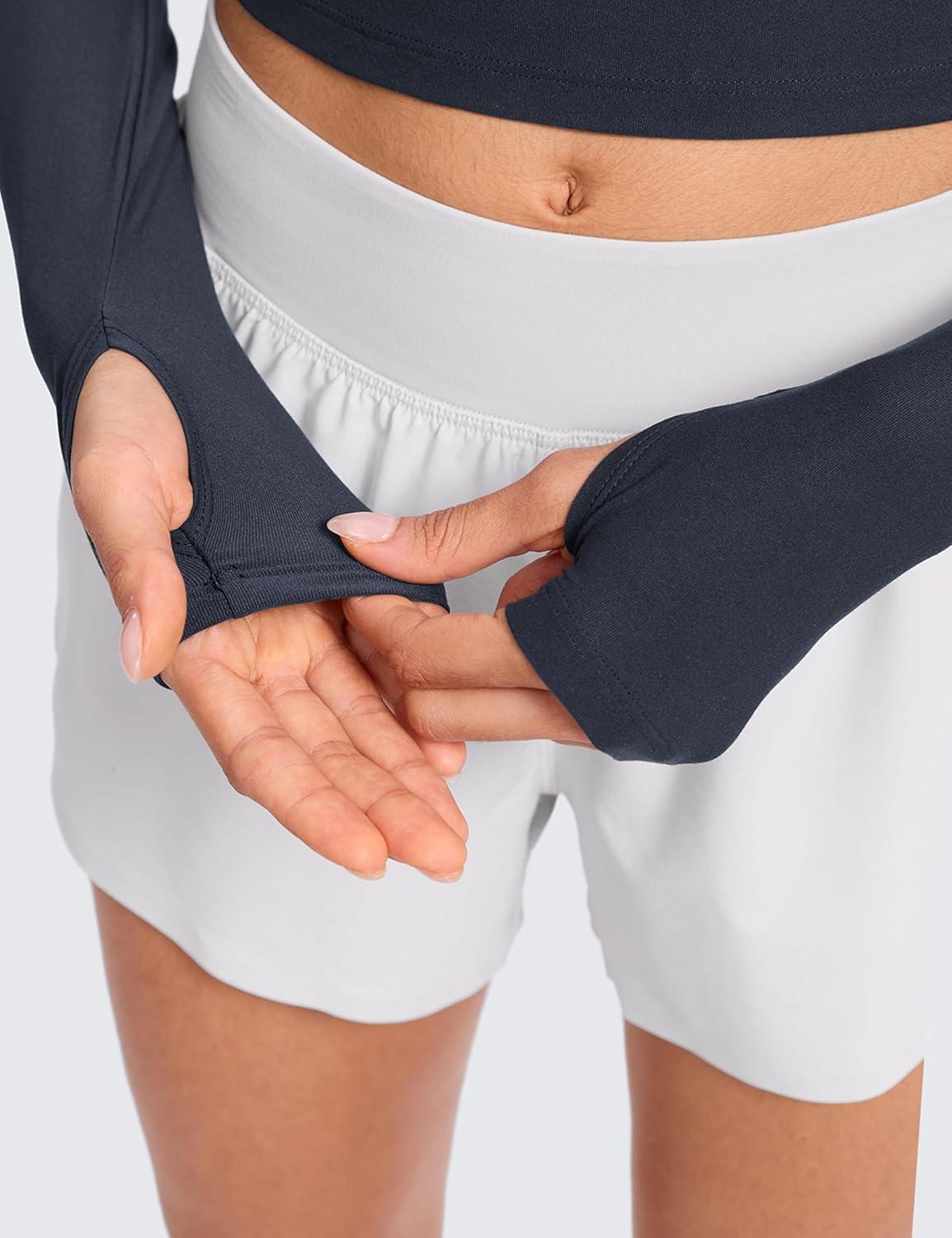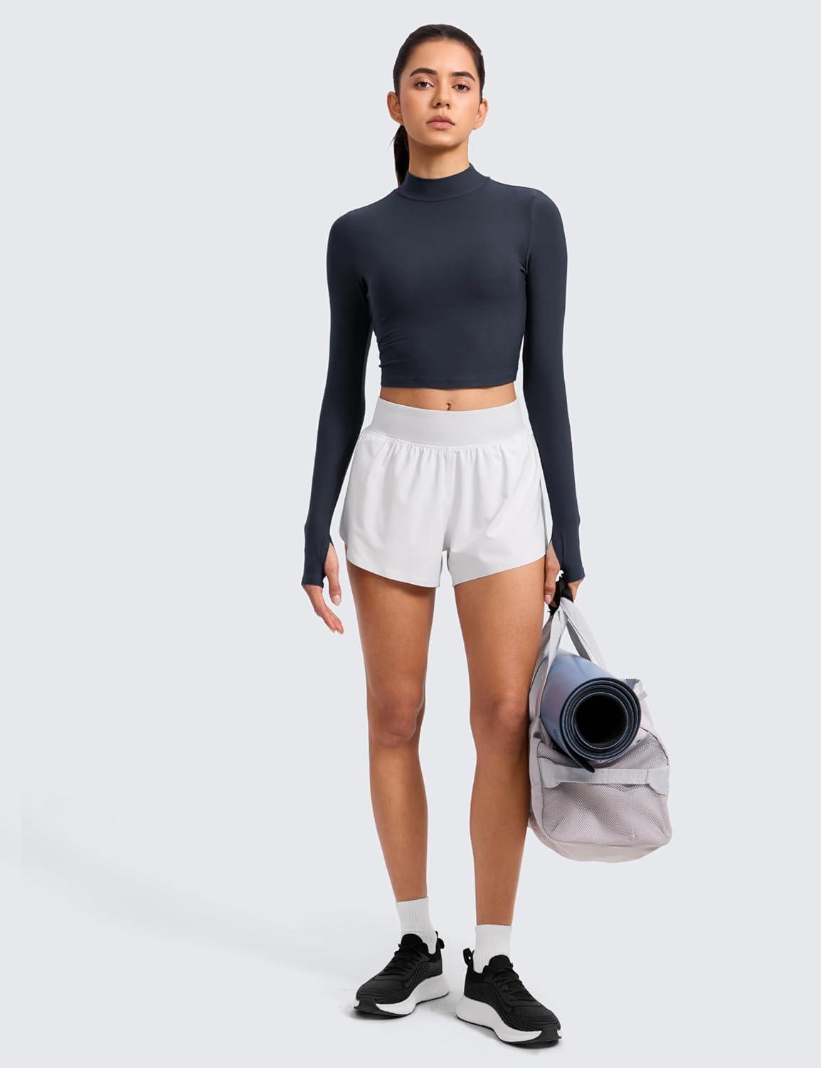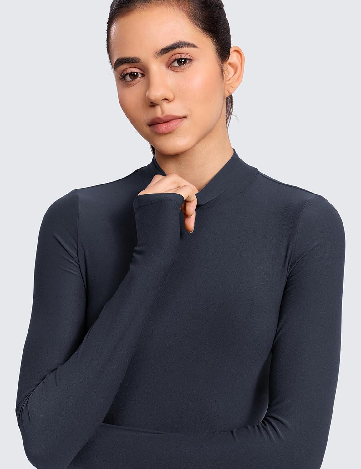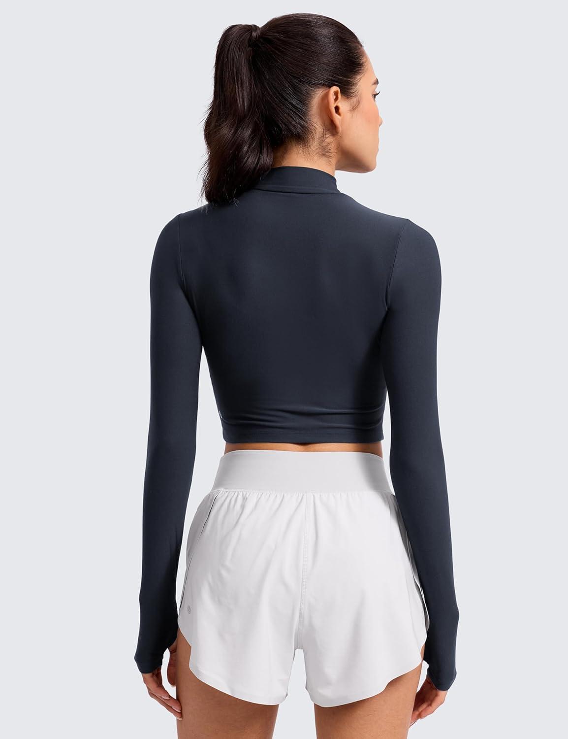 CRZ YOGA Cloudweight Crop Mock Neck Shirts for Women – Workout Athletic Gym Long Sleeve Tops Soft T-Shirt with Thumb Hole(True Navy)