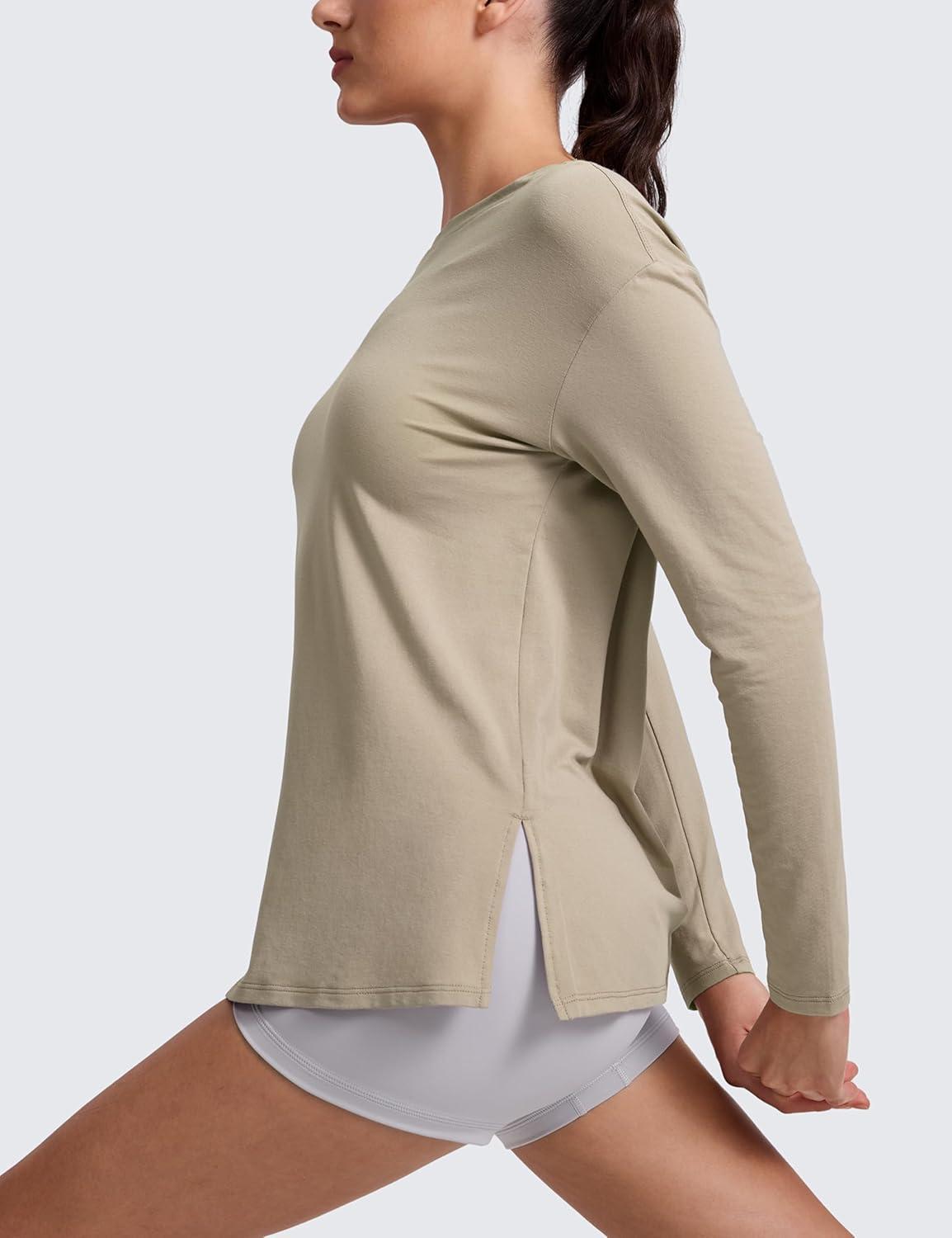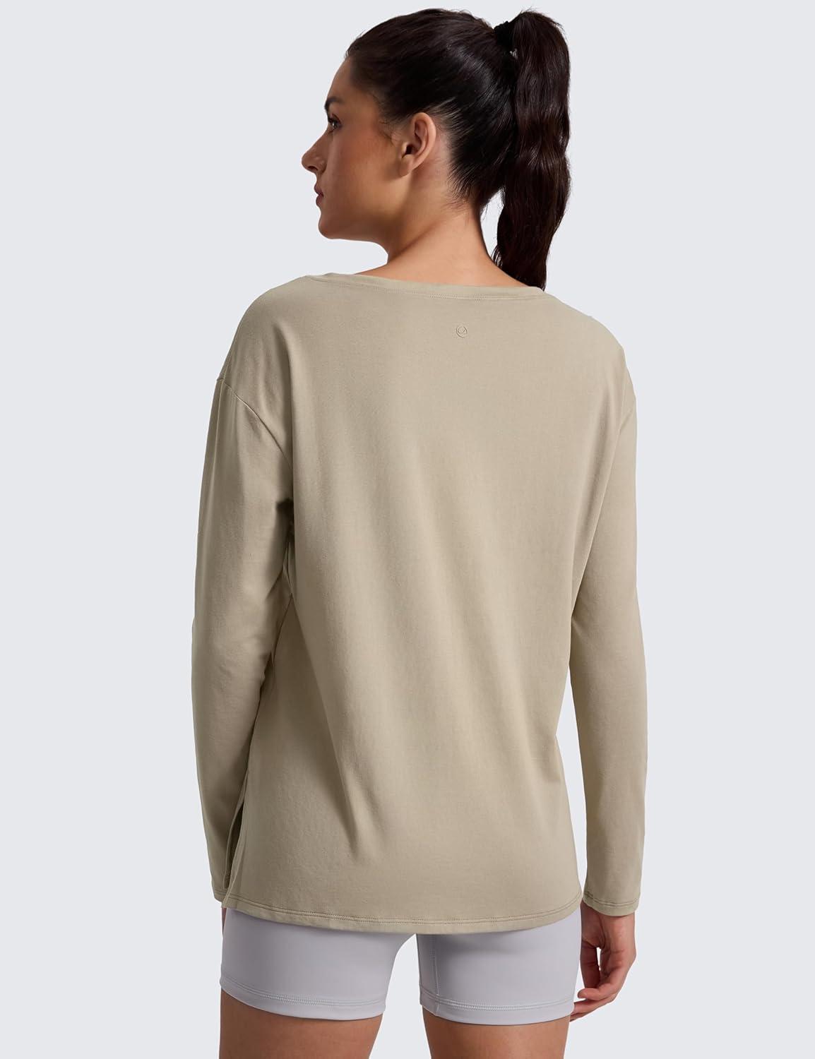 CRZ YOGA Cotton-Blend Long Sleeve Shirts for Women – Boat Neck Workout Athletic Casual Going Out Tops Soft Fall T-Shirt(Oak)