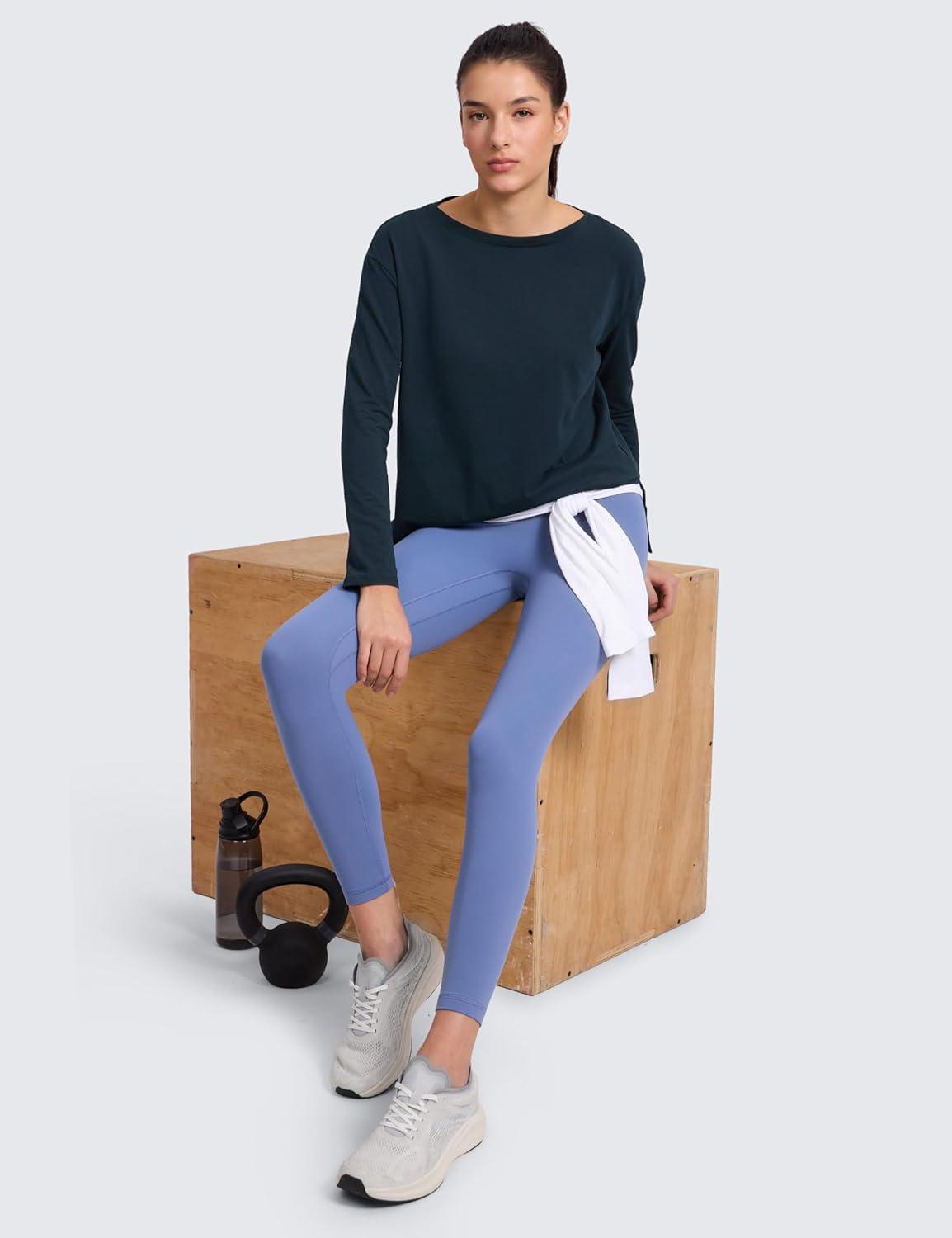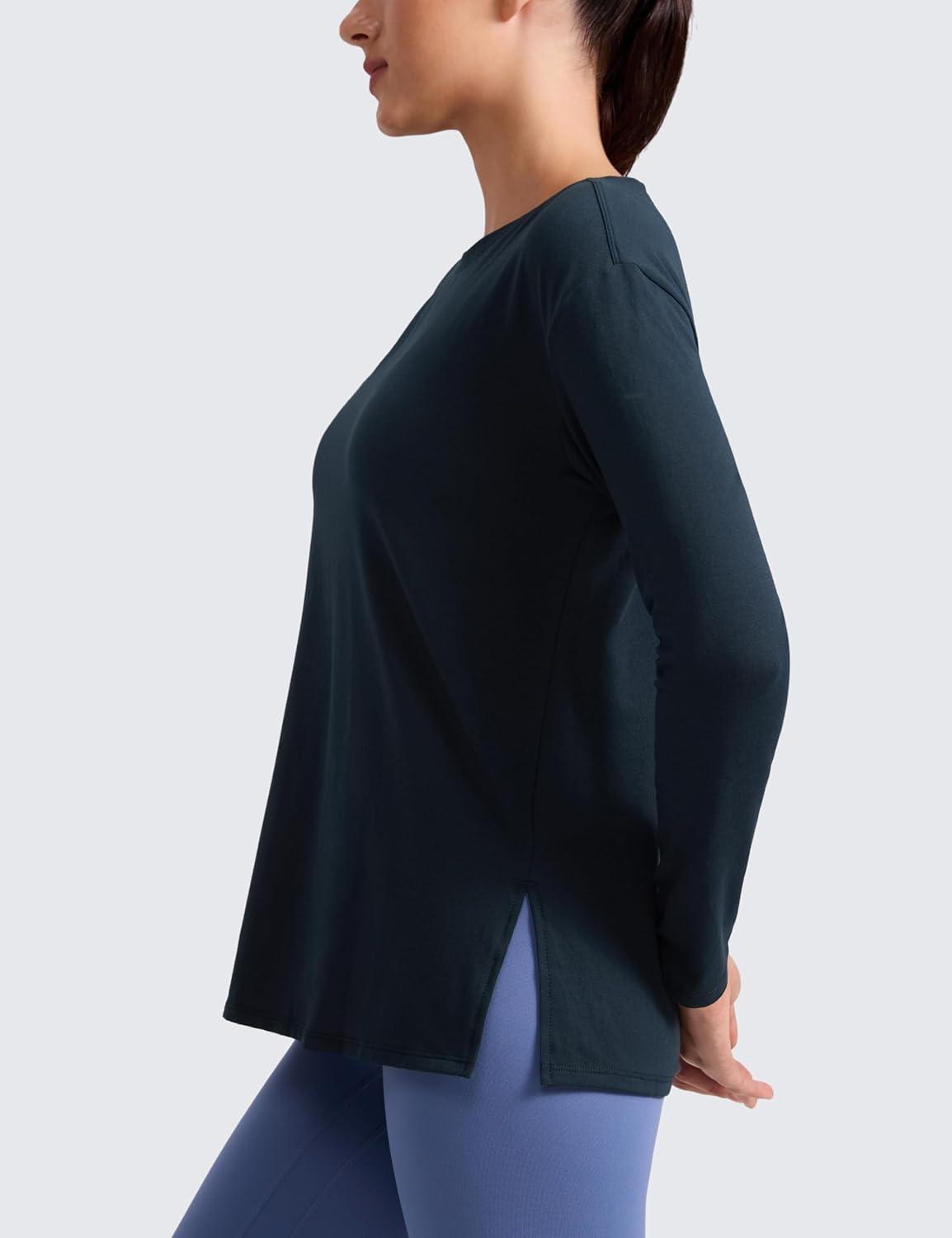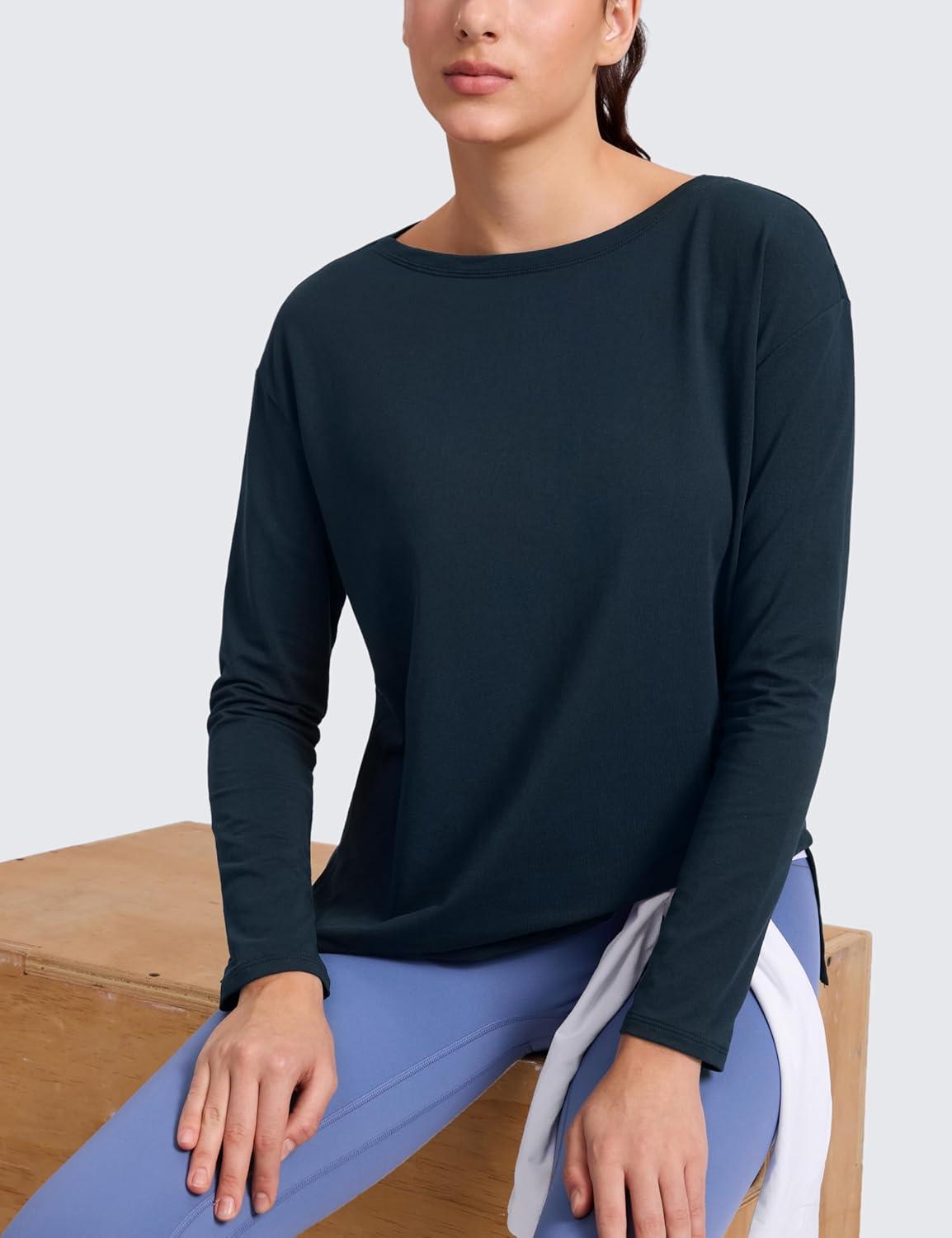 CRZ YOGA Cotton-Blend Long Sleeve Shirts for Women – Boat Neck Workout Athletic Casual Going Out Tops Soft Fall T-Shirt(True Navy)