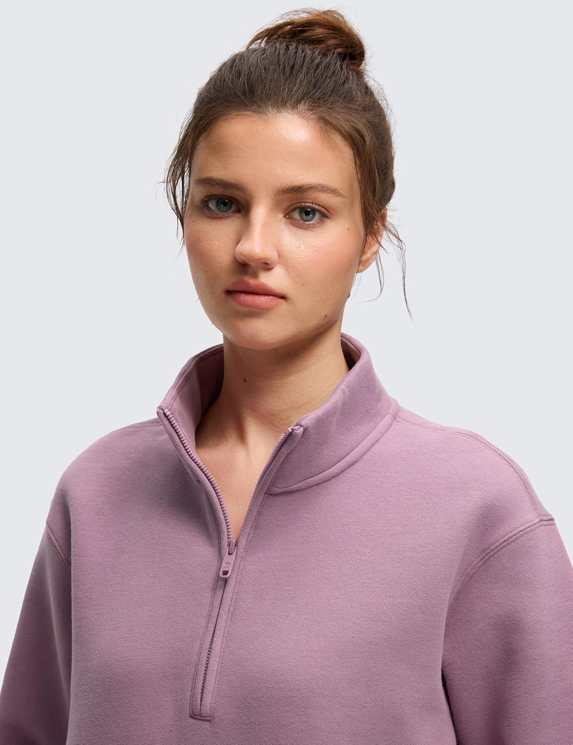 CRZ YOGA women's sweatshirts are refined with high-quality cotton blended fabrics and fleece lining, keeping you warm and comfortable in cold winter. With a cozy funnel neck design, this half zip sweatshirts provide enough warmth and a stylish look. Designed for daily outfit or lounging.