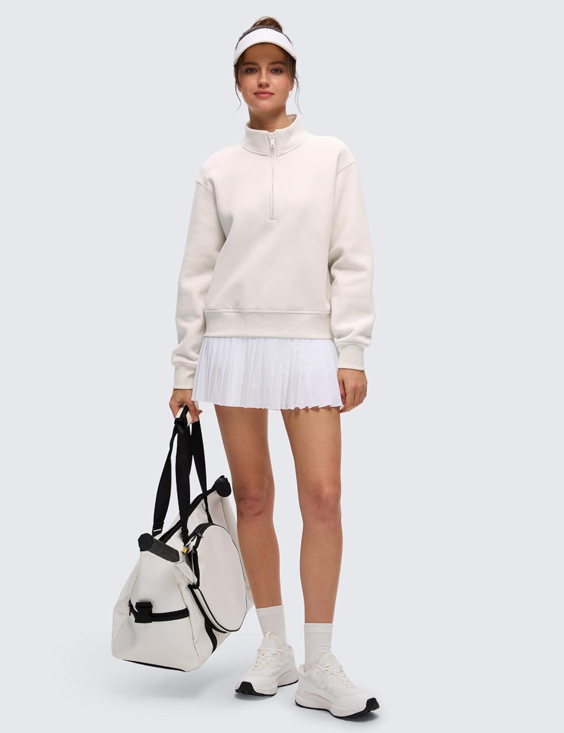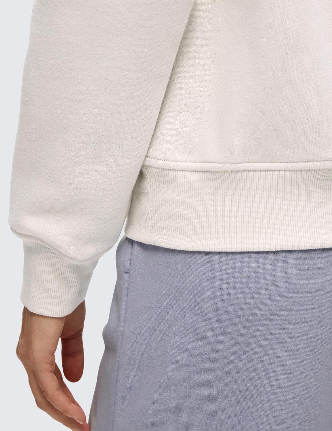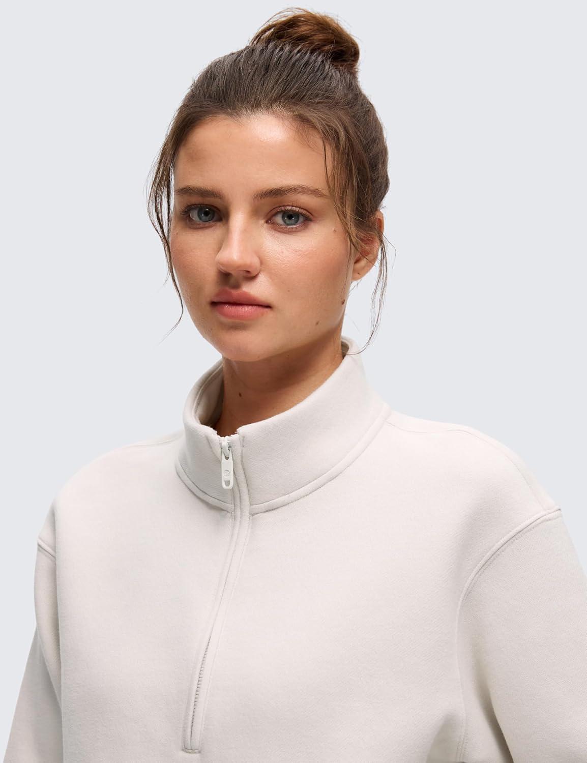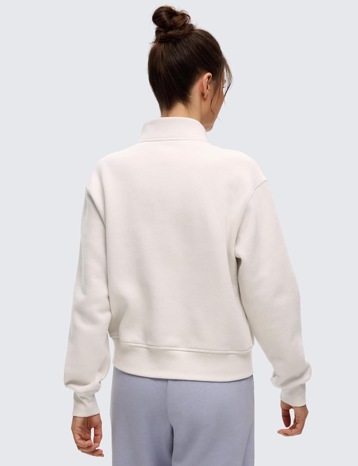 CRZ YOGA Cotton Fleece Lined Half Zip Sweatshirt for Women – Pullover Funnel Neck Workout Casual Sweat Shirts with Pocket(Milky White)