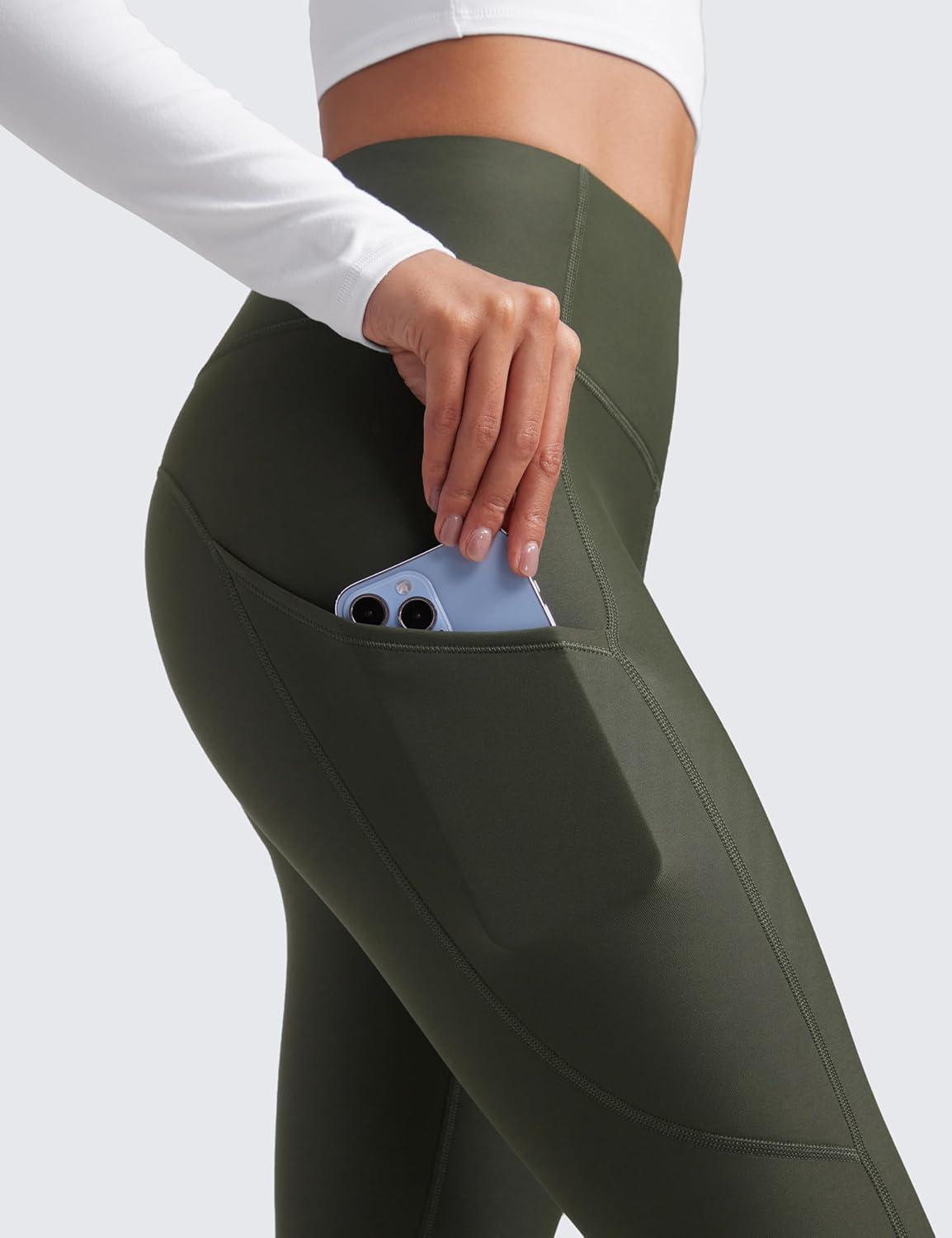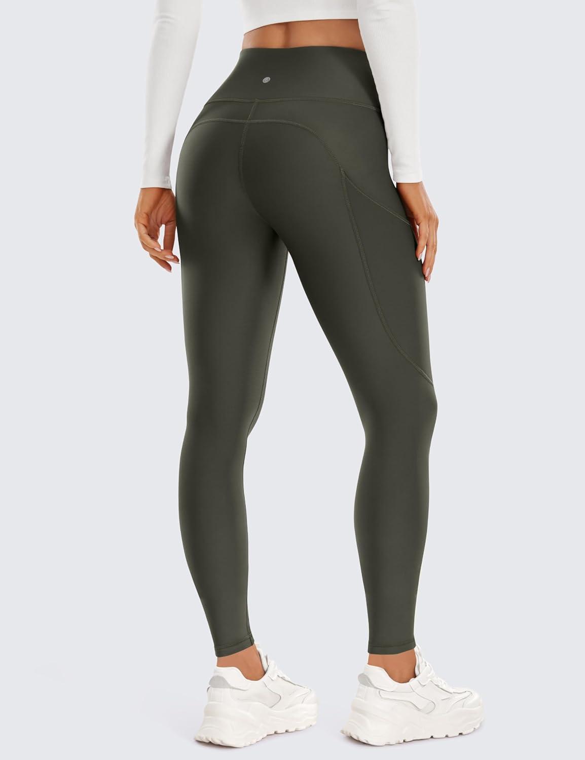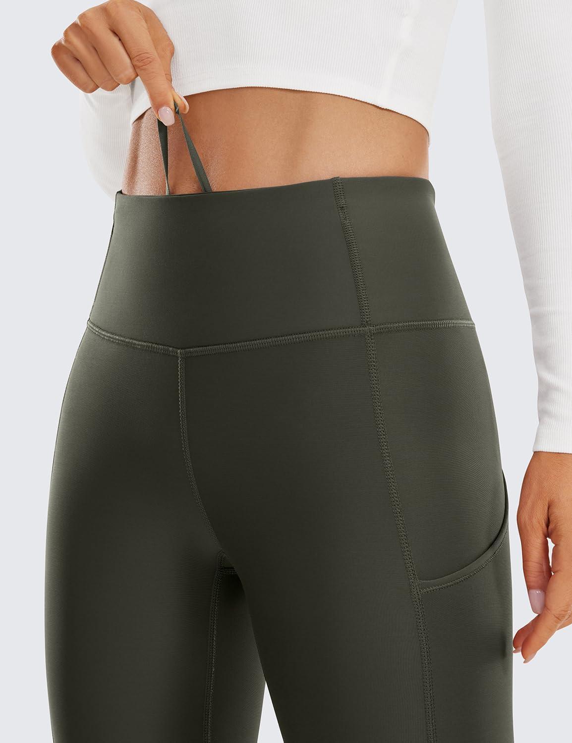 CRZ YOGA Fleece Lined Leggings Pockets 28” – Thermal Casual Lounge Workout Womens Yoga Full Length Pants Winter Warm(Olive Green)