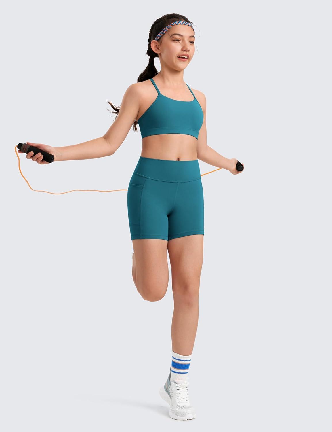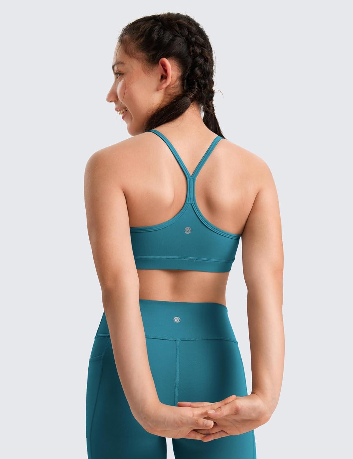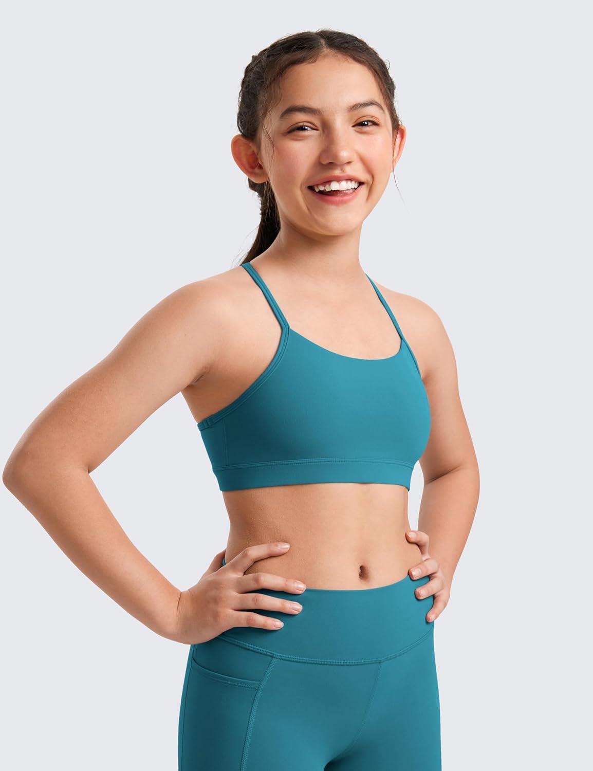 CRZ YOGA Girls Butterluxe Y Back Sports Bra – Yoga Athletic Casual Tops Scoop Neck Spaghetti Strap Padded Crop Kids Teen(Borealis Green)