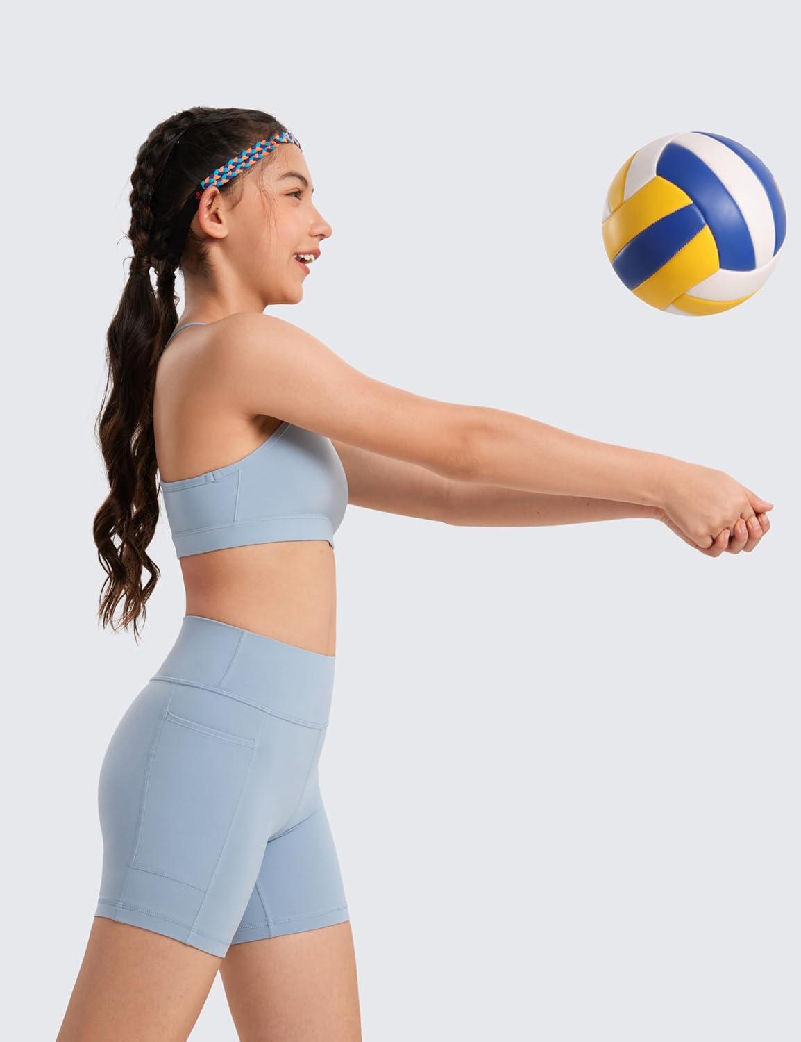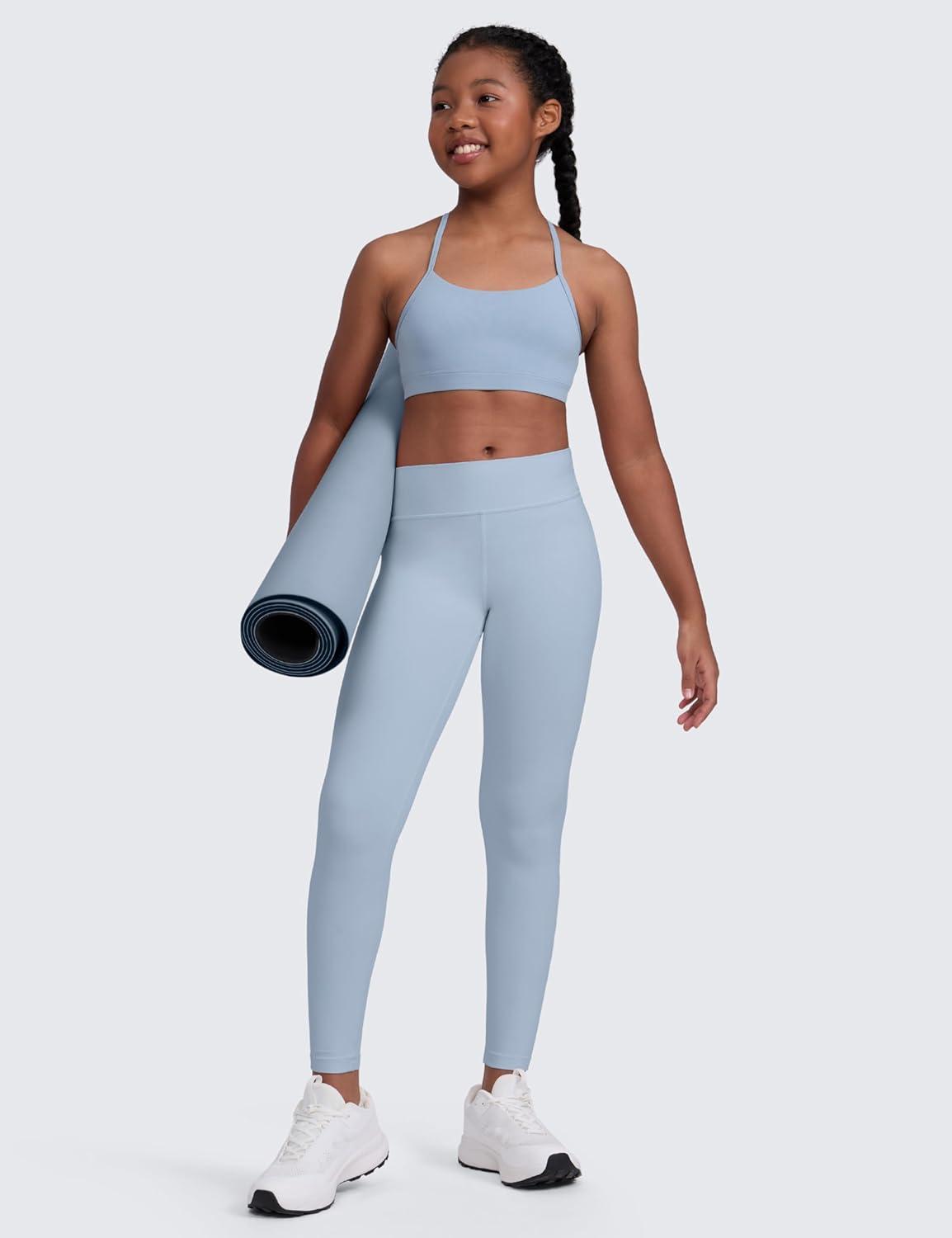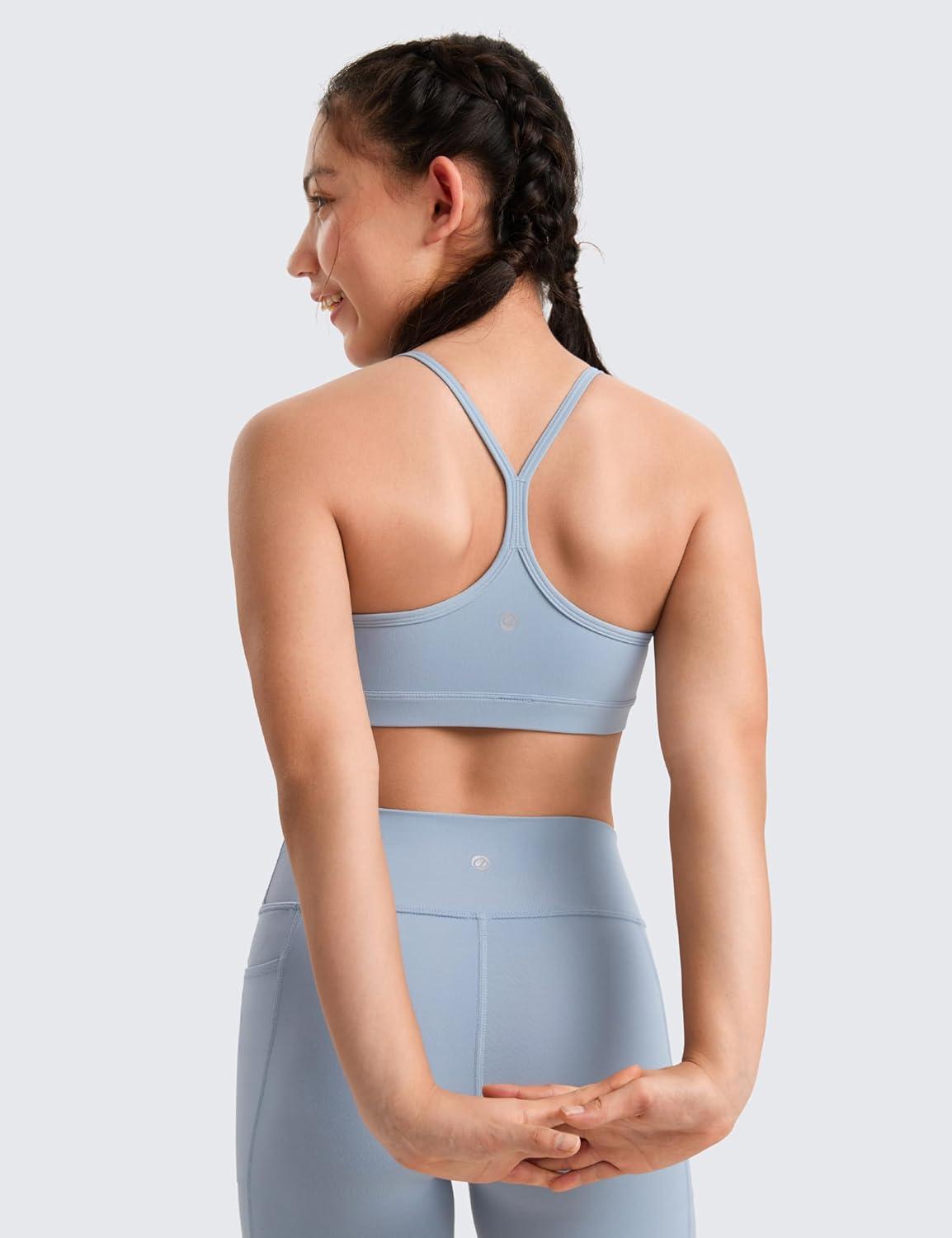 CRZ YOGA Girls Butterluxe Y Back Sports Bra – Yoga Athletic Casual Tops Scoop Neck Spaghetti Strap Padded Crop Kids Teen(Cambric Blue)