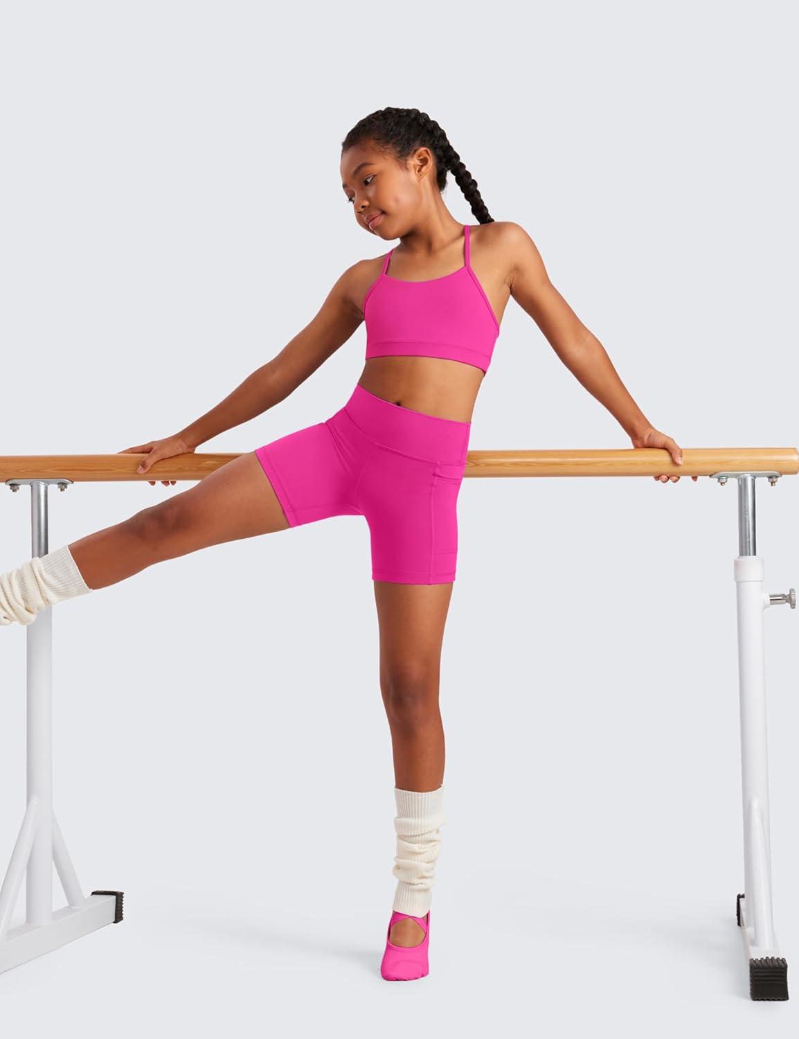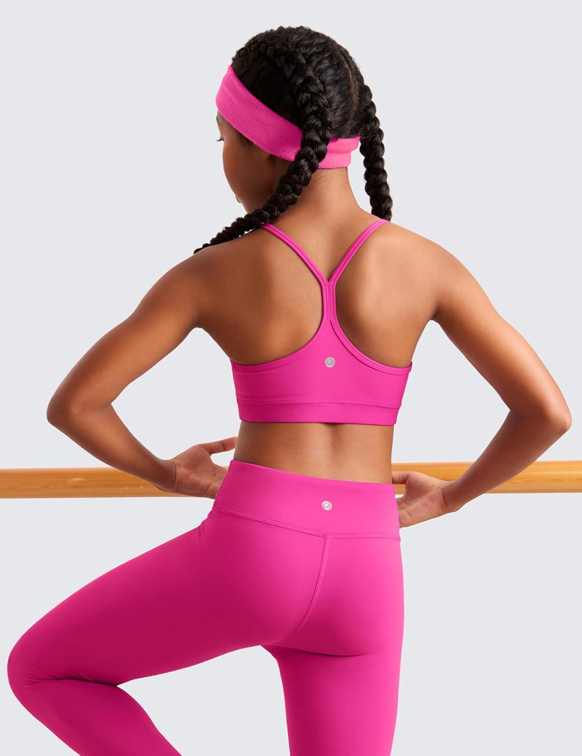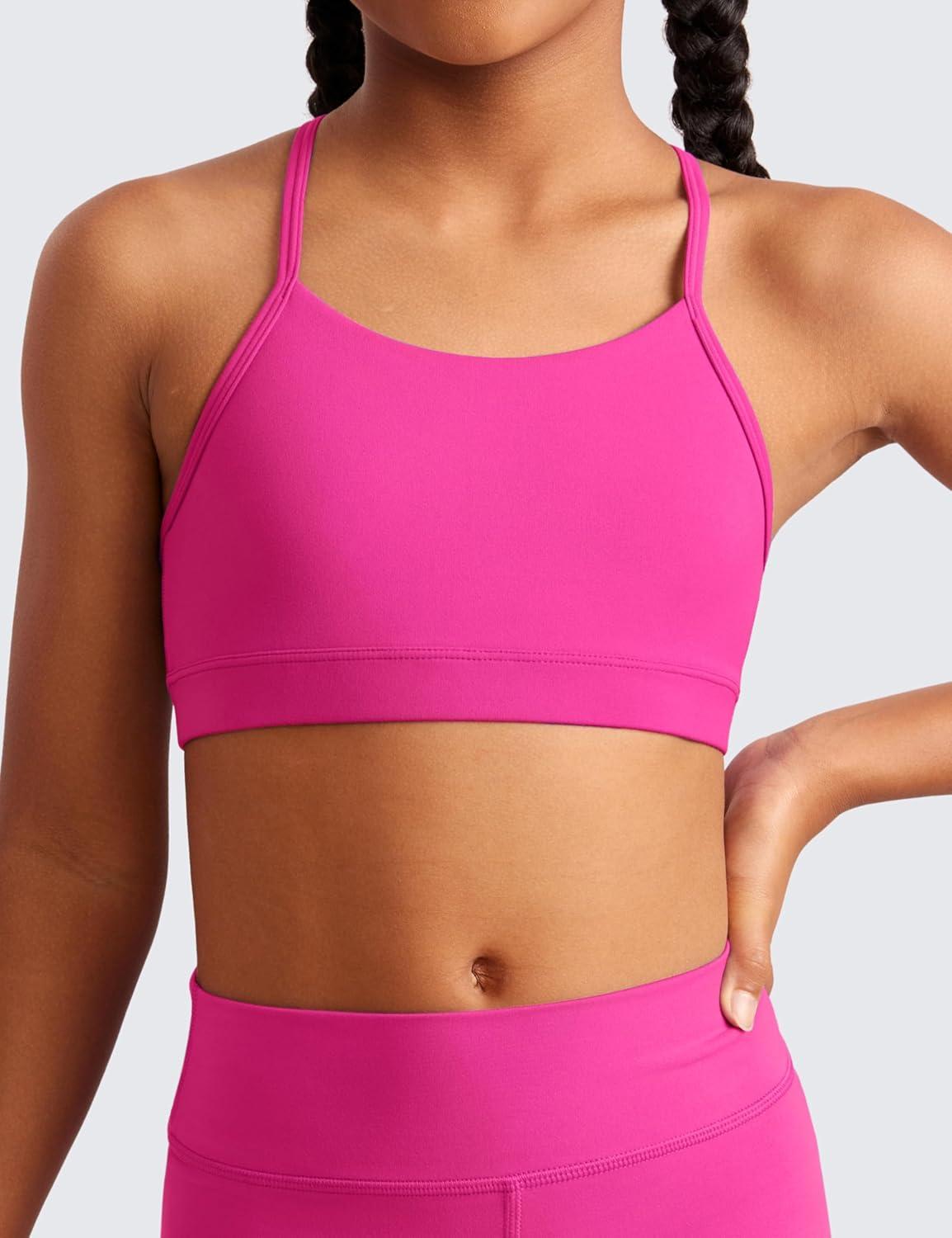 CRZ YOGA Girls Butterluxe Y Back Sports Bra – Yoga Athletic Casual Tops Scoop Neck Spaghetti Strap Padded Crop Kids Teen(Hibiscus Purple)