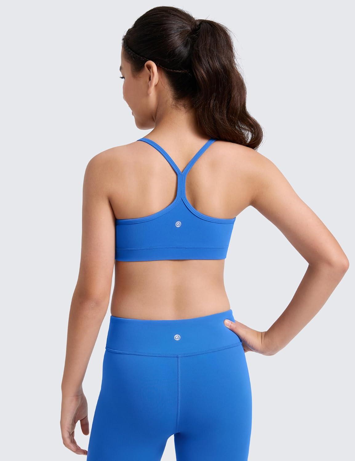 CRZ YOGA Girls Butterluxe Y Back Sports Bra – Yoga Athletic Casual Tops Scoop Neck Spaghetti Strap Padded Crop Kids Teen(Sparkle Blue)