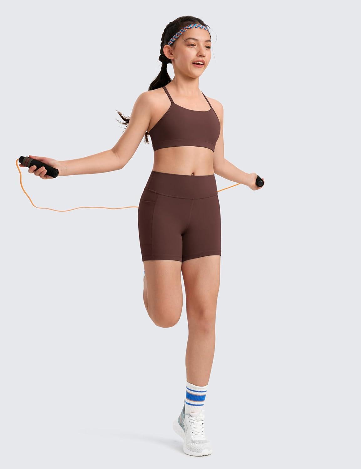 CRZ YOGA Girls Butterluxe Y Back Sports Bra – Yoga Athletic Casual Tops Scoop Neck Spaghetti Strap Padded Crop Kids Teen(Taupe)