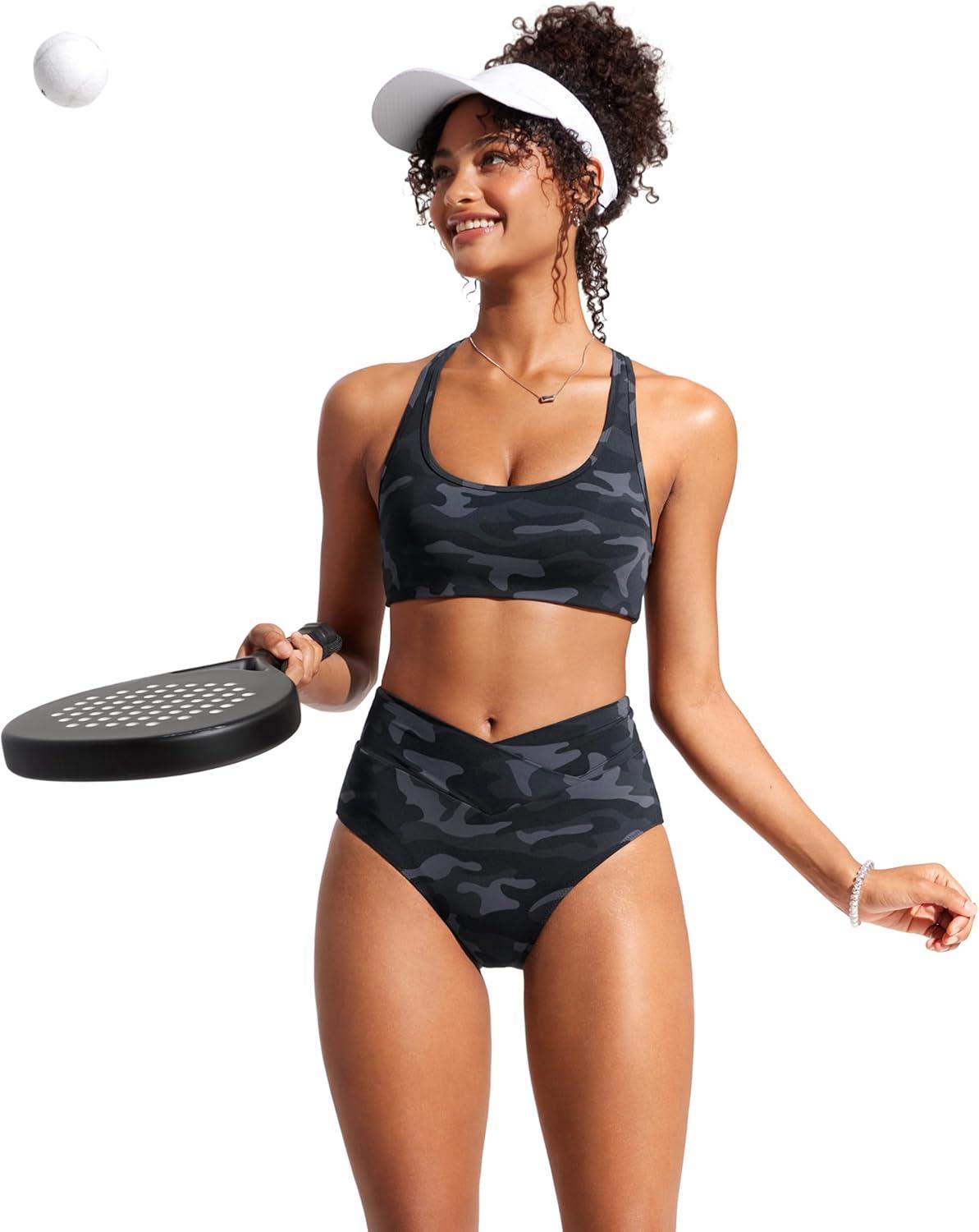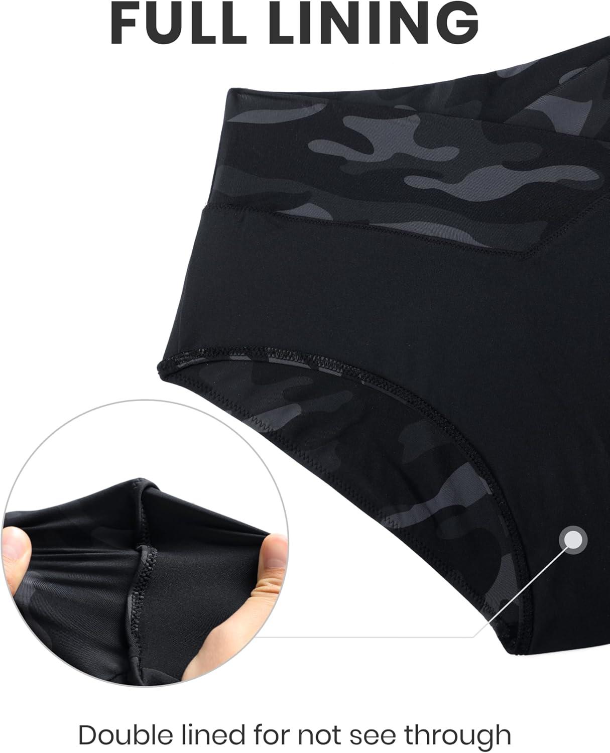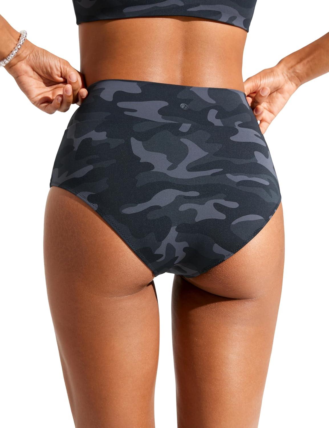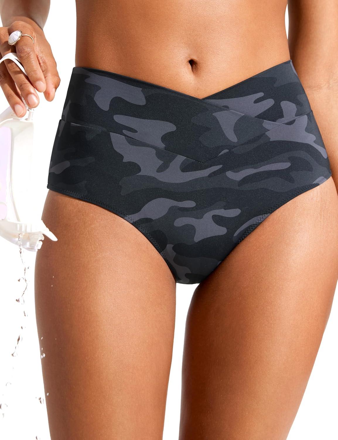 CRZ YOGA High Waisted V Cut Bikini Bottom for Women – Cross Front Bathing Swimsuit Full Coverage Swim Briefs(Jungle Camouflage Gray)