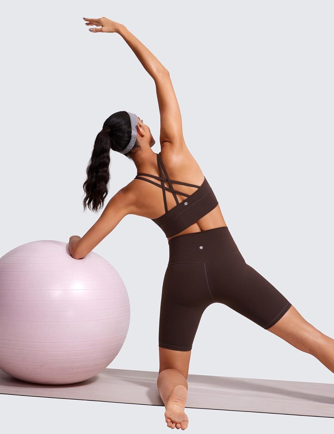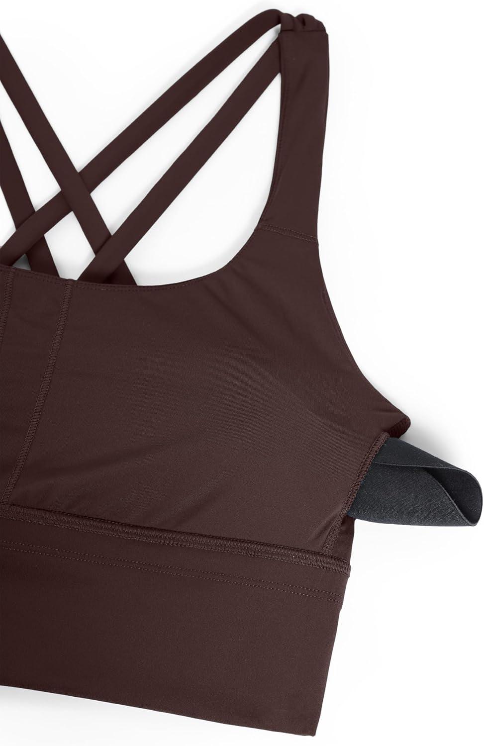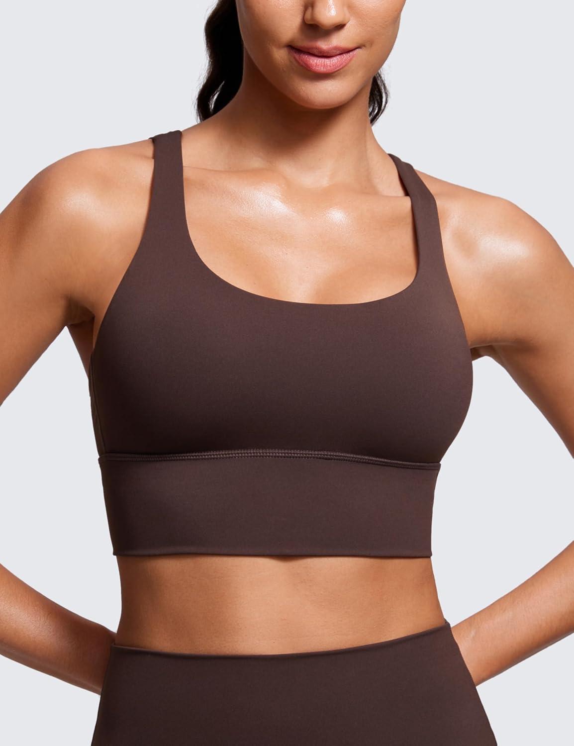 CRZ YOGA Naked Feeling Strappy Longline Sports Bras for Women – Medium Impact Criss Cross Yoga Padded Workout Crop Top(Hot Fudge Brown)