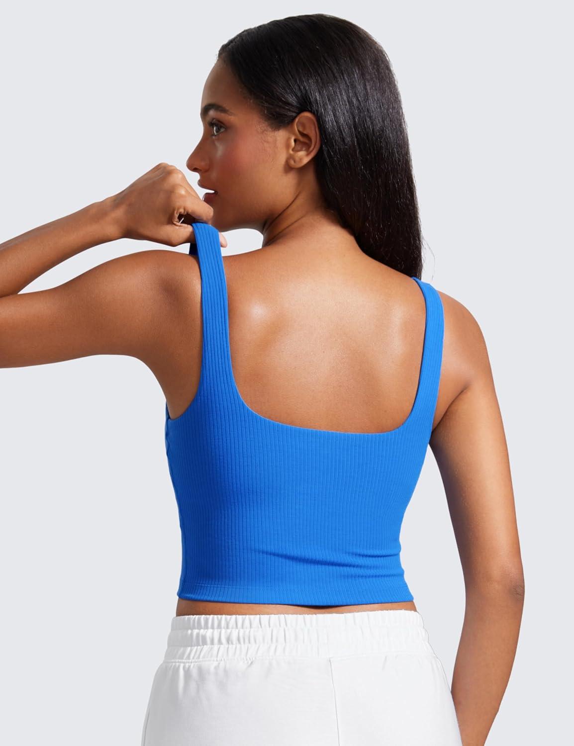 CRZ YOGA Ribbed Henley Crop Tank Tops for Women – Square Back Padded Yoga Workout Longline Sports Bras(Sparkle Blue)