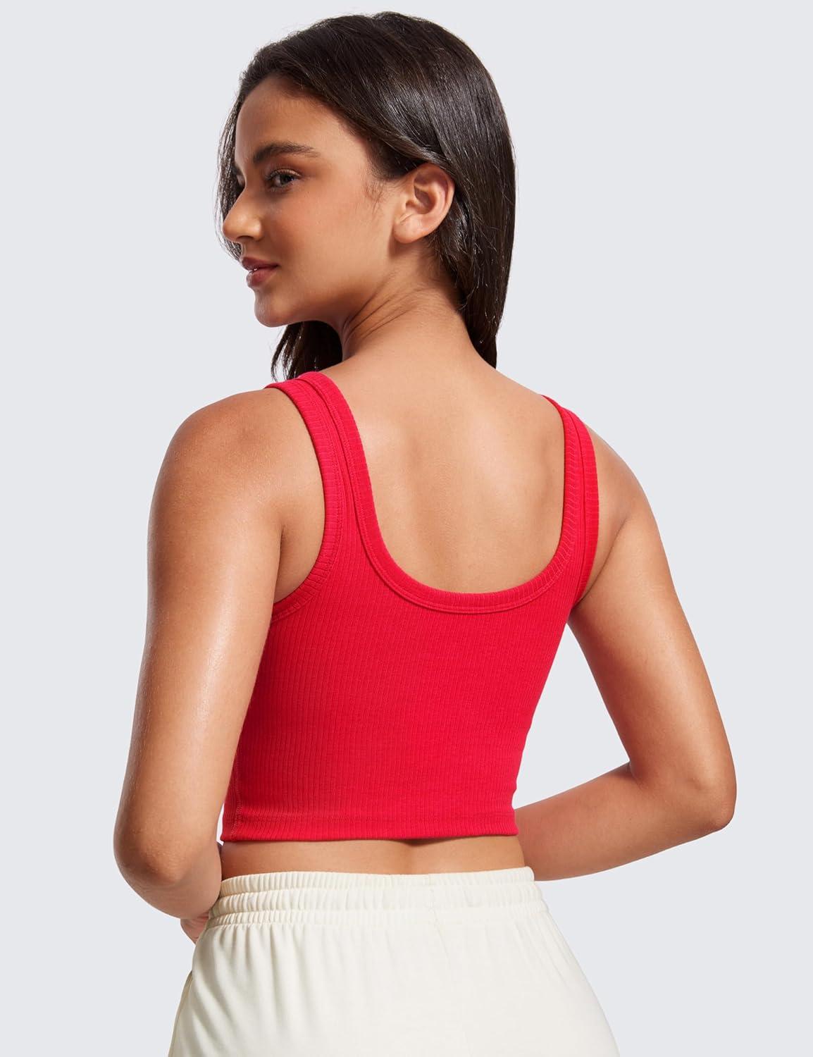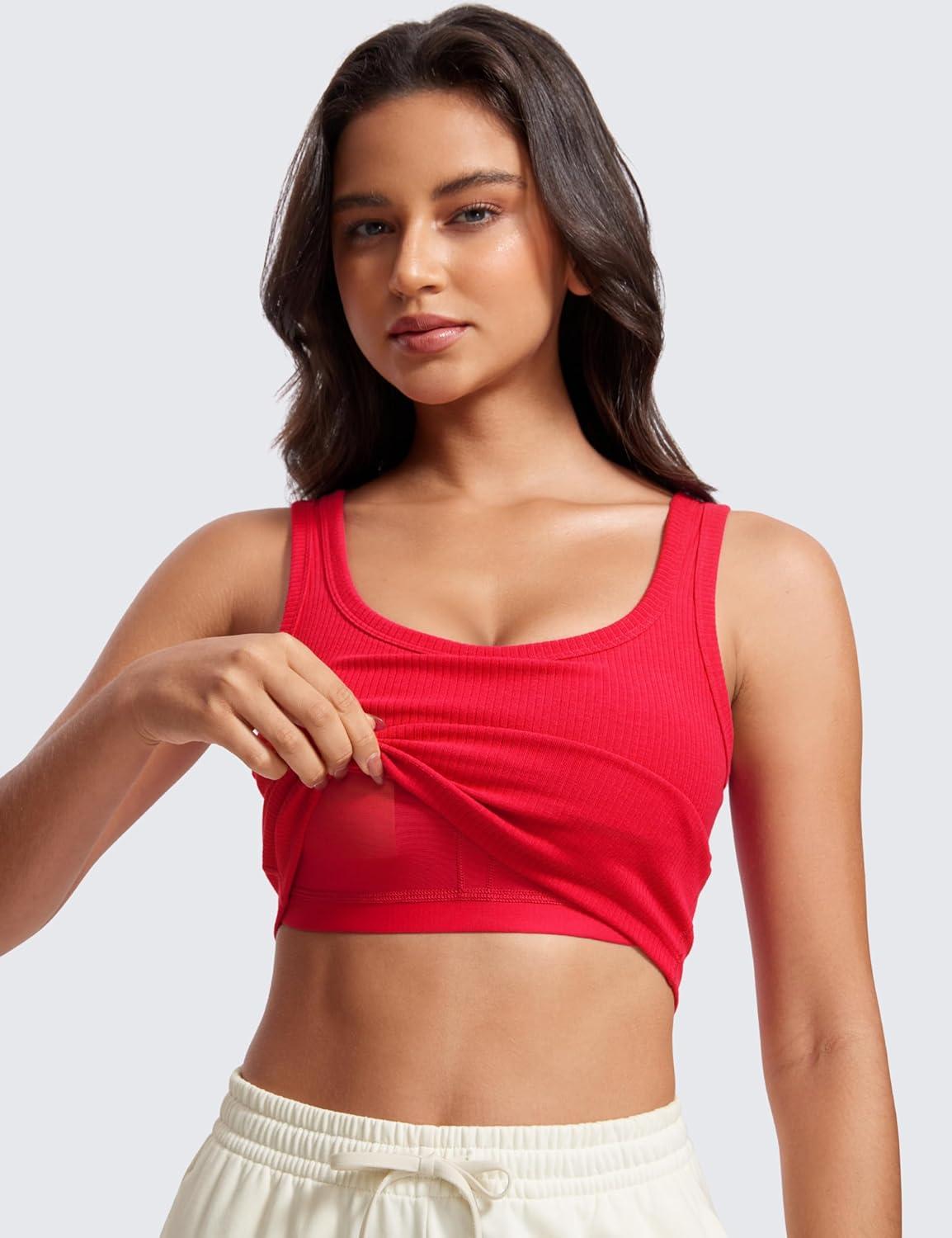 CRZ YOGA Ribbed Scoop Neck Crop Tank Tops for Women – Padded Longline Sports Bras Yoga Workout Cami(Deep Red)