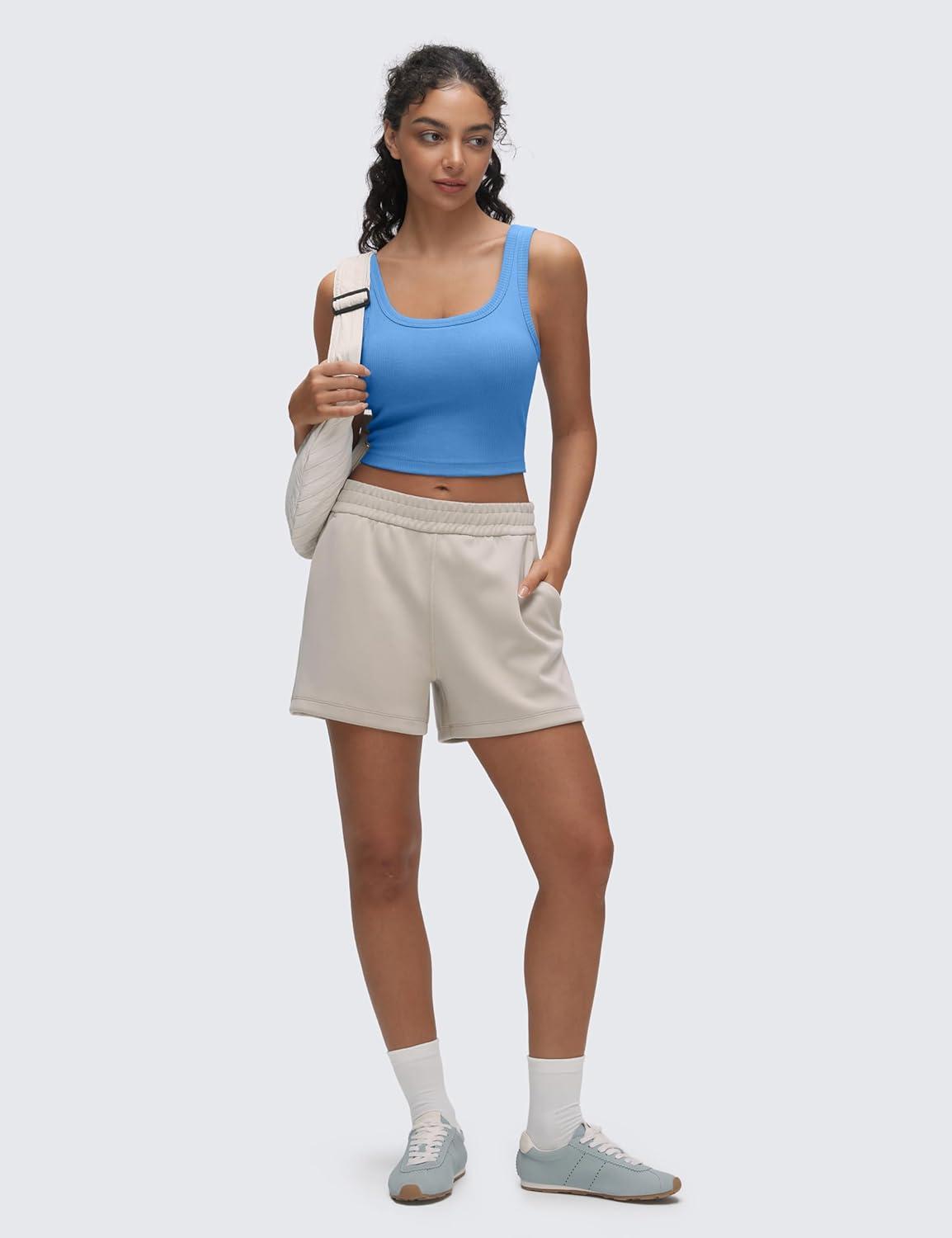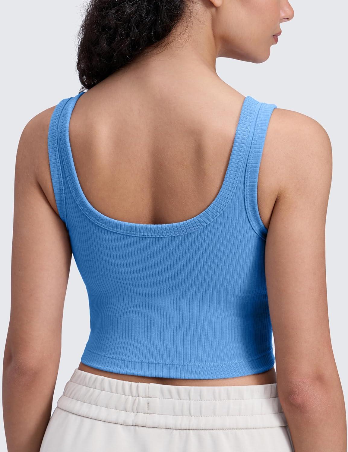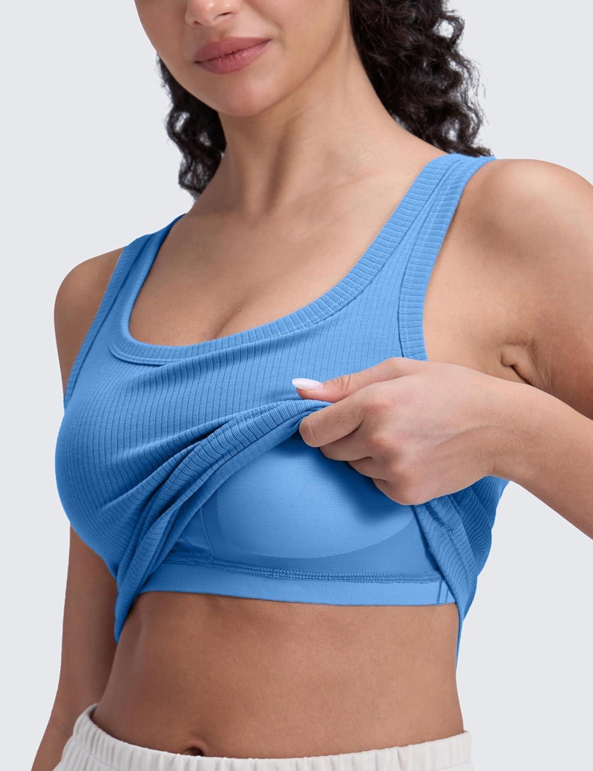 CRZ YOGA Ribbed Scoop Neck Crop Tank Tops for Women – Padded Longline Sports Bras Yoga Workout Cami(Party Blue)