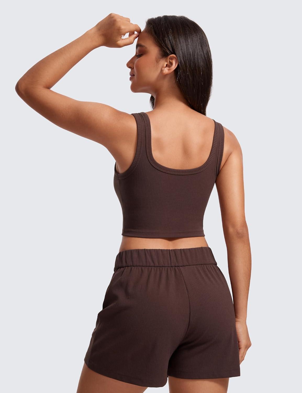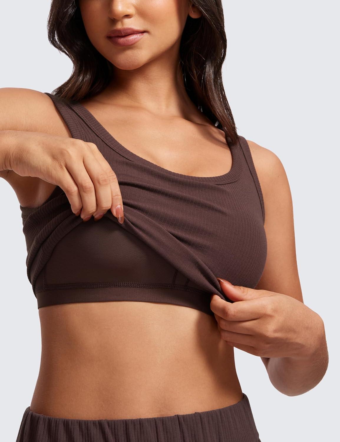 CRZ YOGA Ribbed Scoop Neck Crop Tank Tops for Women – Padded Longline Sports Bras Yoga Workout Cami(Taupe)