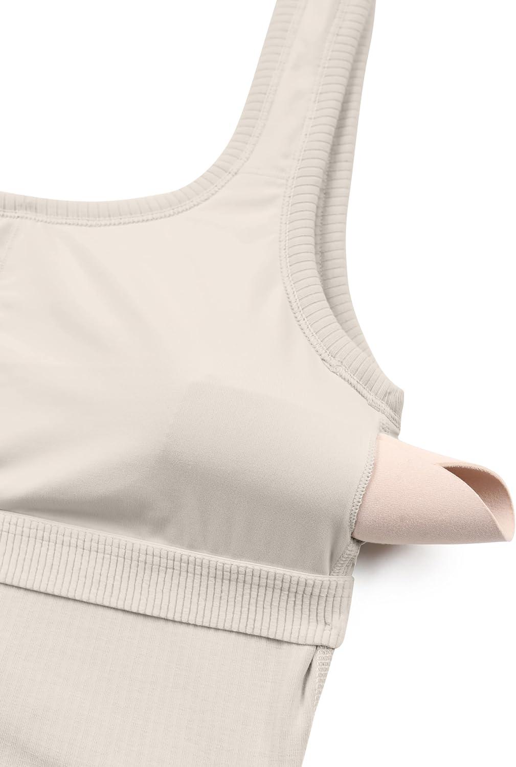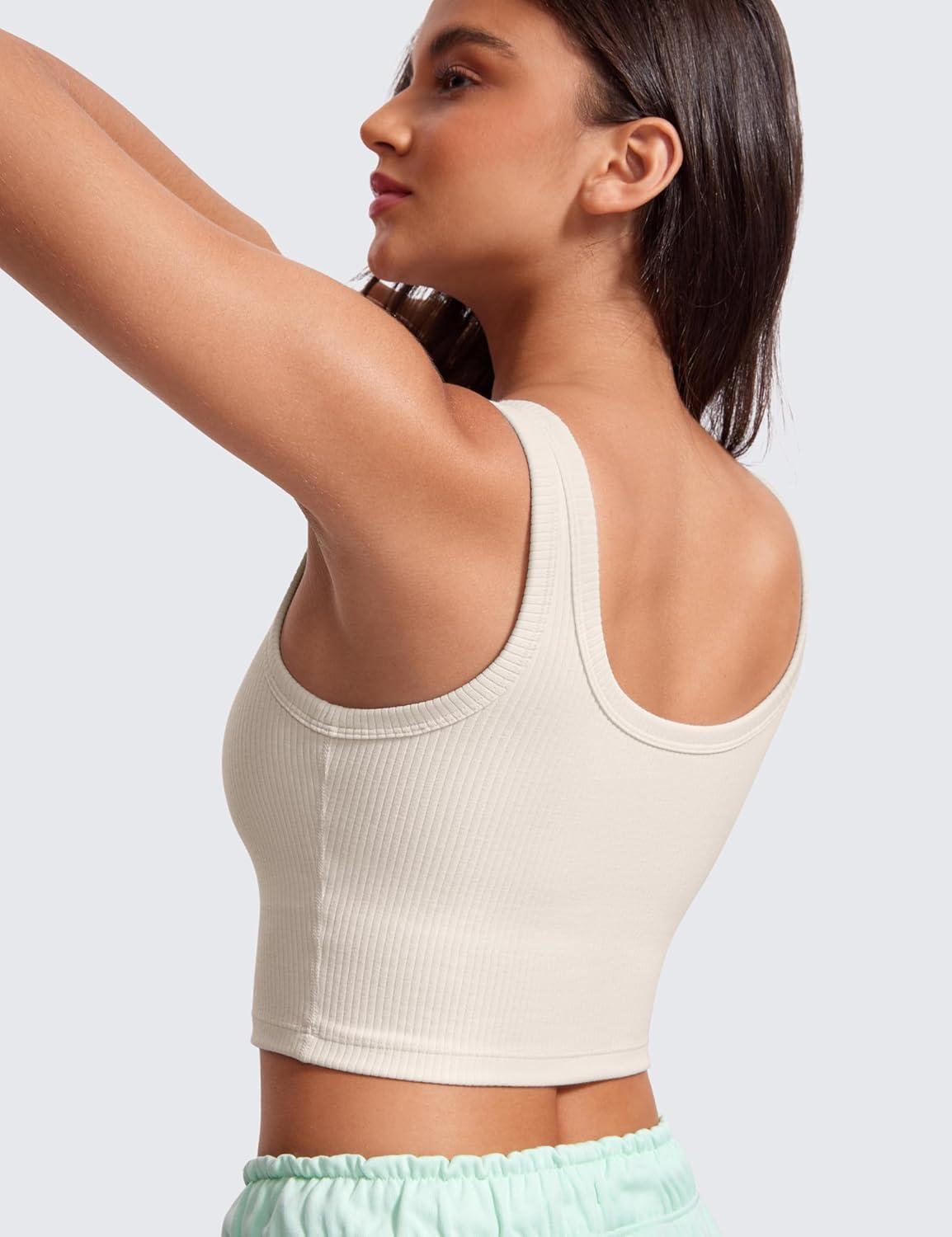 CRZ YOGA Ribbed Scoop Neck Crop Tank Tops for Women – Padded Longline Sports Bras Yoga Workout Cami(White Apricot)