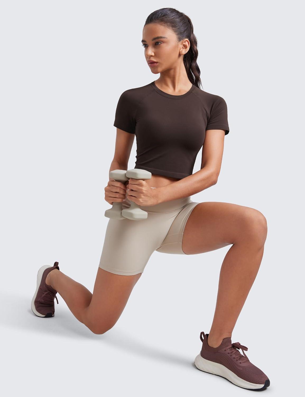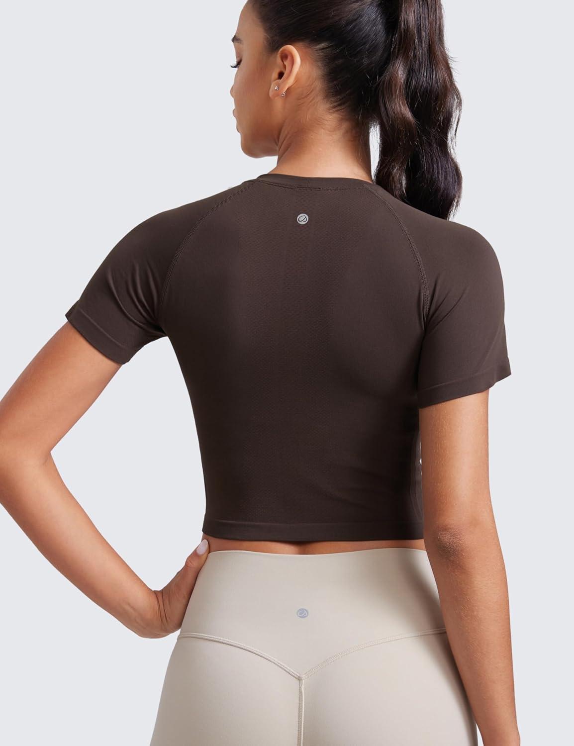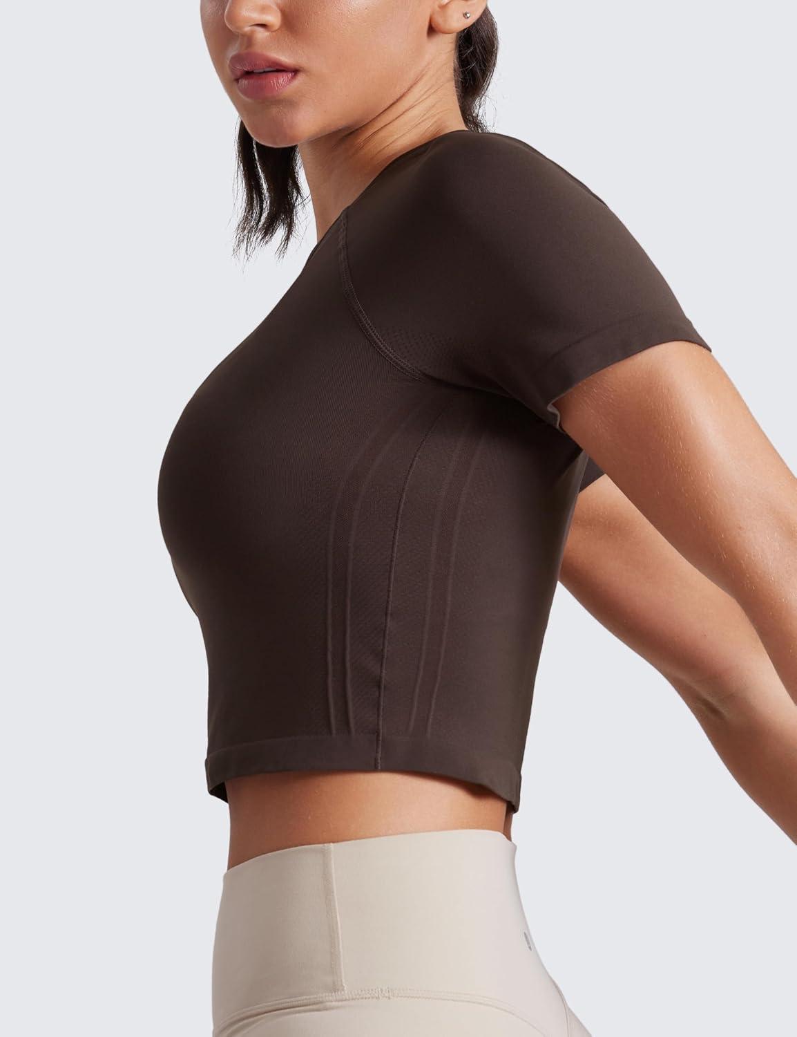 CRZ YOGA Seamless Crop Workout Tops for Women – Athletic Running Gym Yoga Short Sleeve Shirts Basic(Hot Fudge Brown)