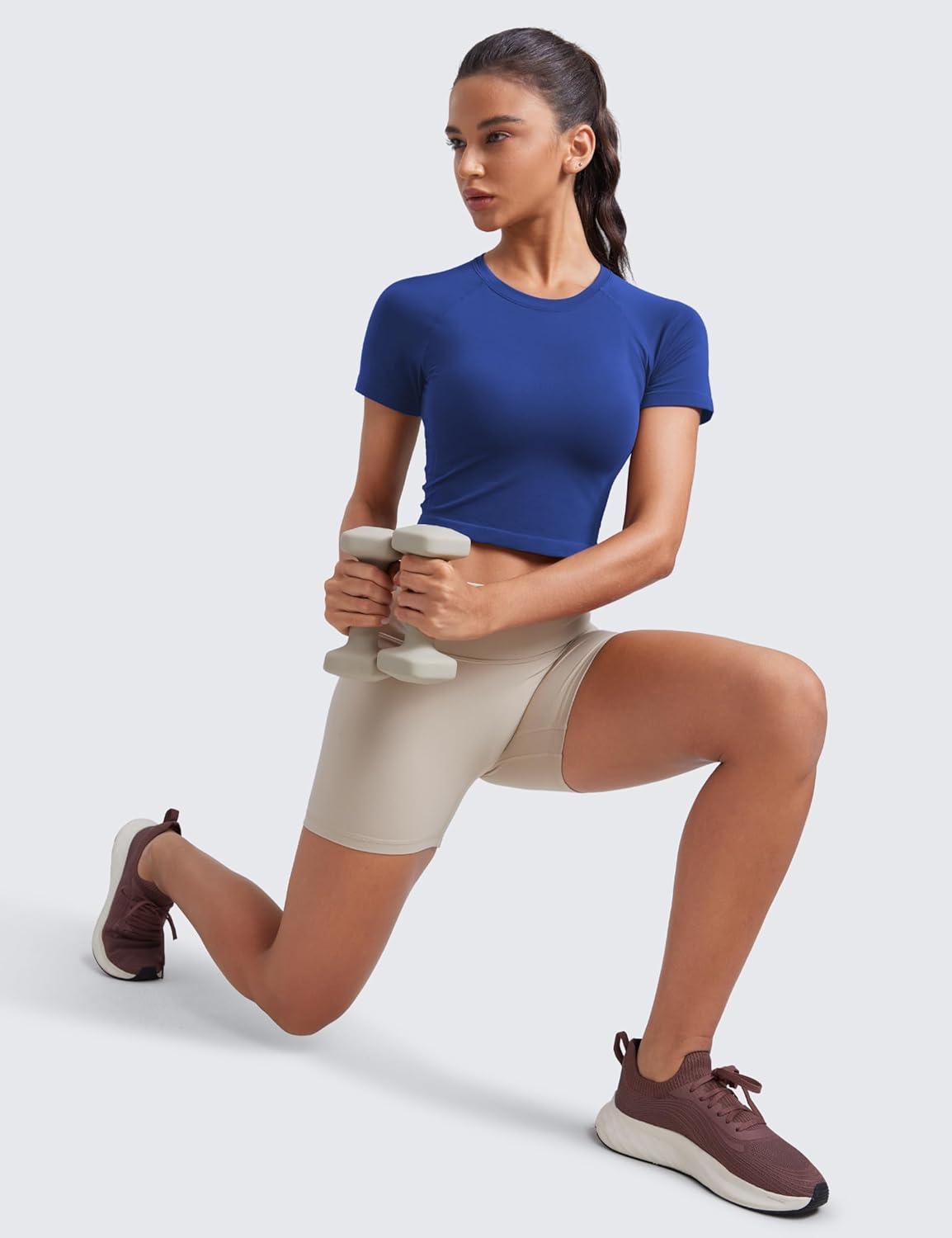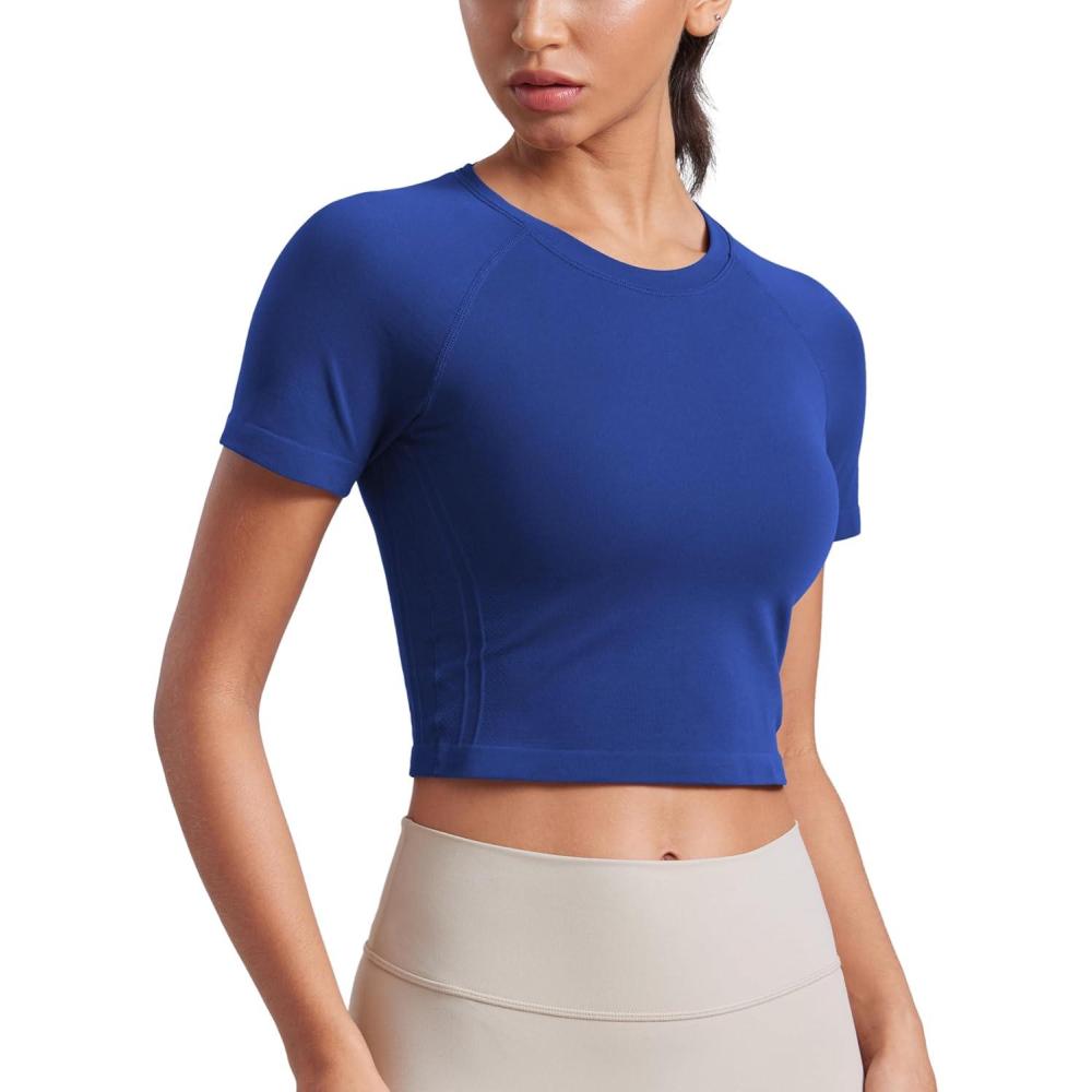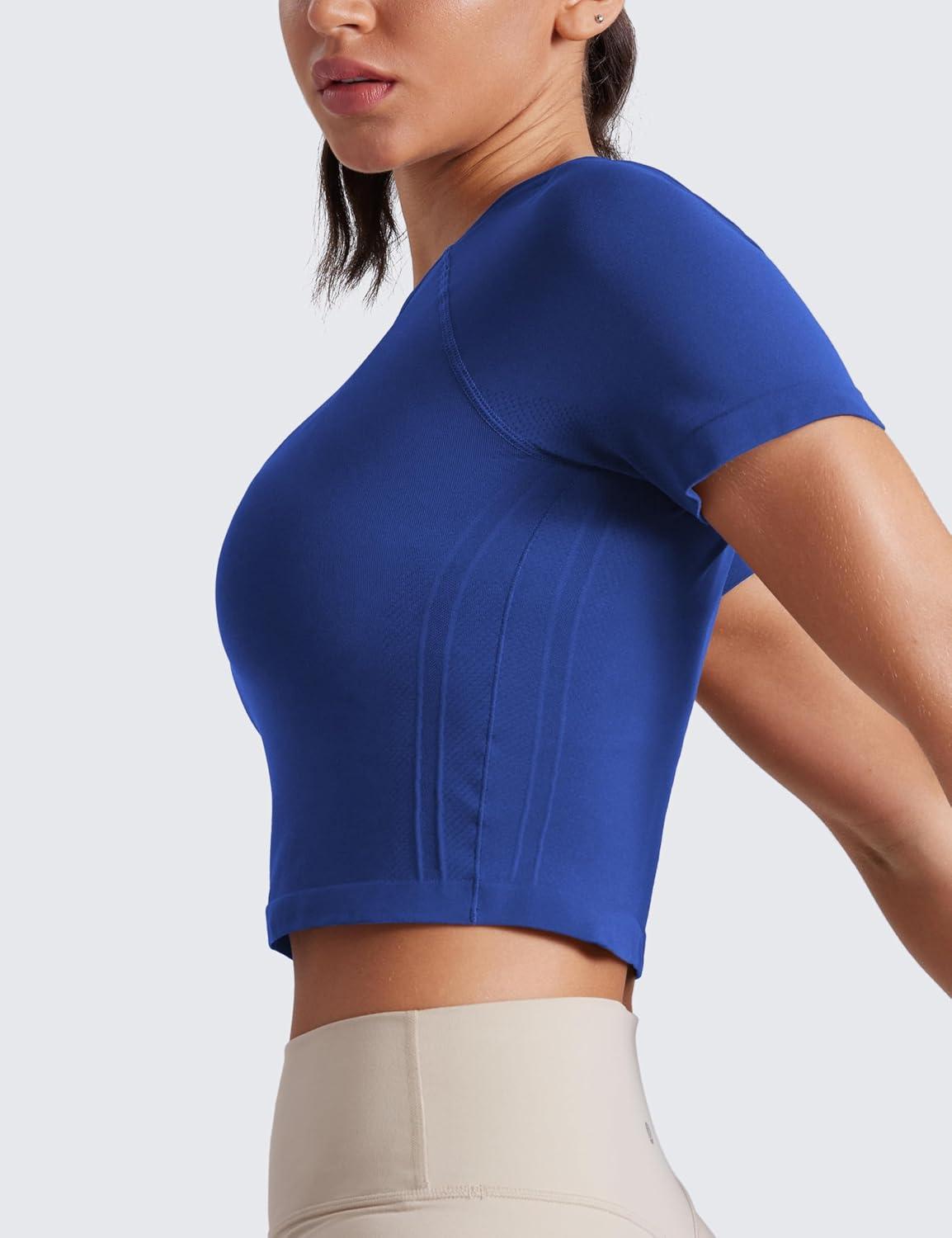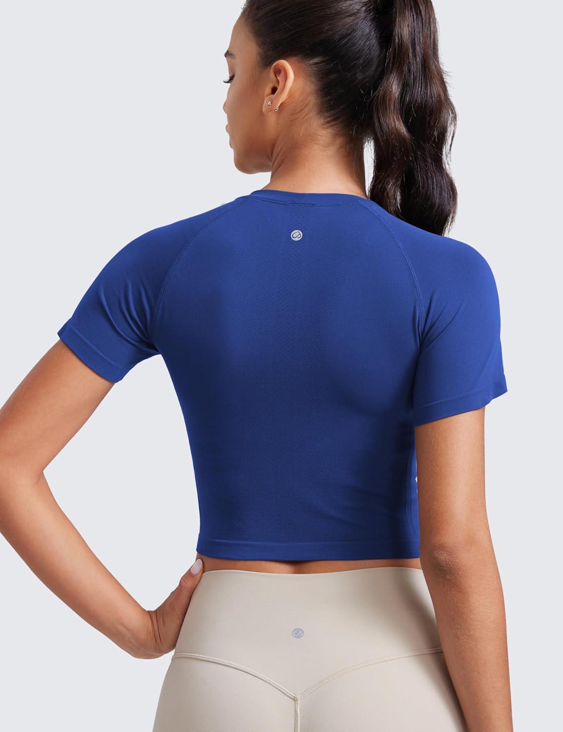 CRZ YOGA Seamless Crop Workout Tops for Women – Athletic Running Gym Yoga Short Sleeve Shirts Basic(Larkspur Blue)