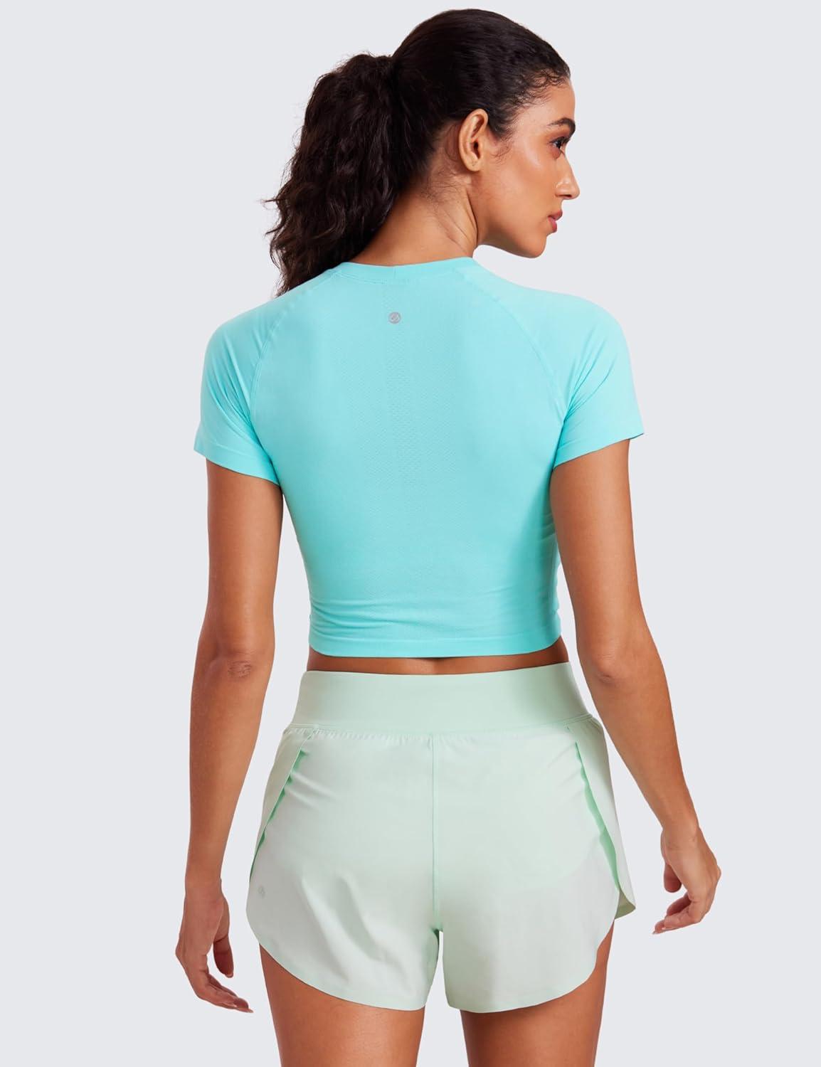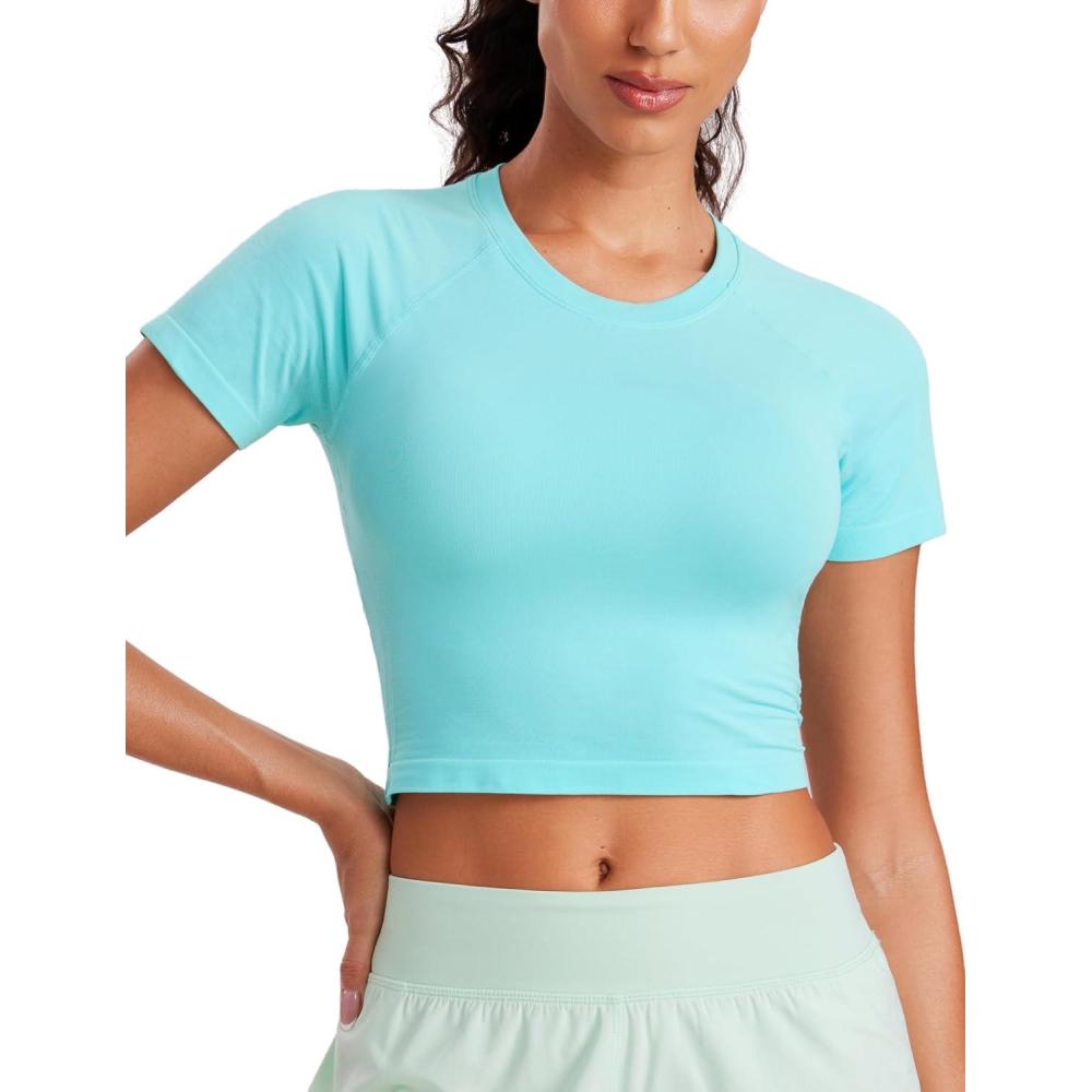 CRZ YOGA Seamless Crop Workout Tops for Women – Athletic Running Gym Yoga Short Sleeve Shirts Basic(Turquoise)
