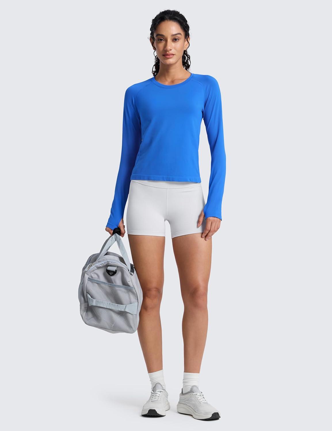 CRZ YOGA Seamless Long Sleeve Shirts for Women Waist Length – Workout Athletic Running Gym Yoga Tops Crewneck Breathable(Sparkle Blue)