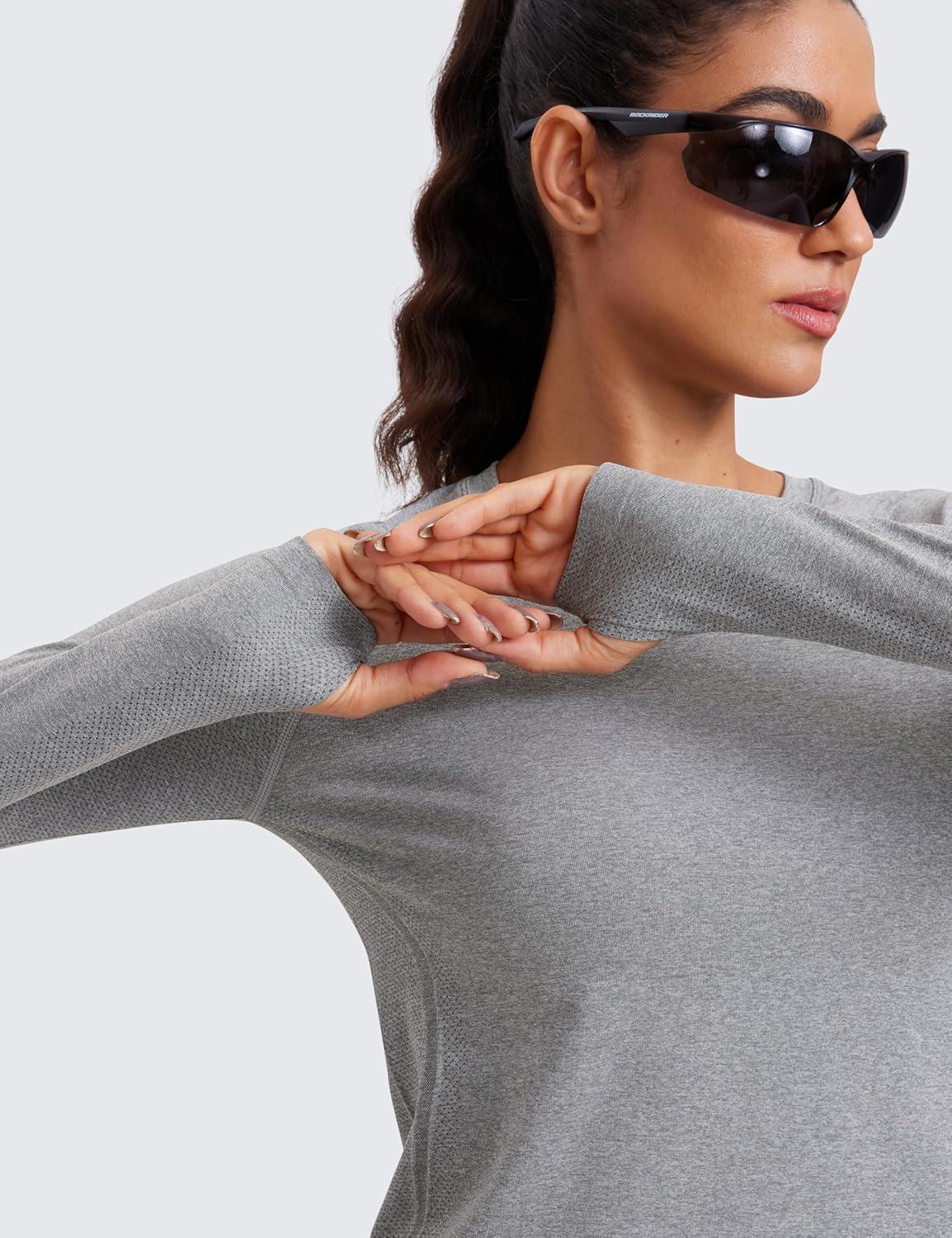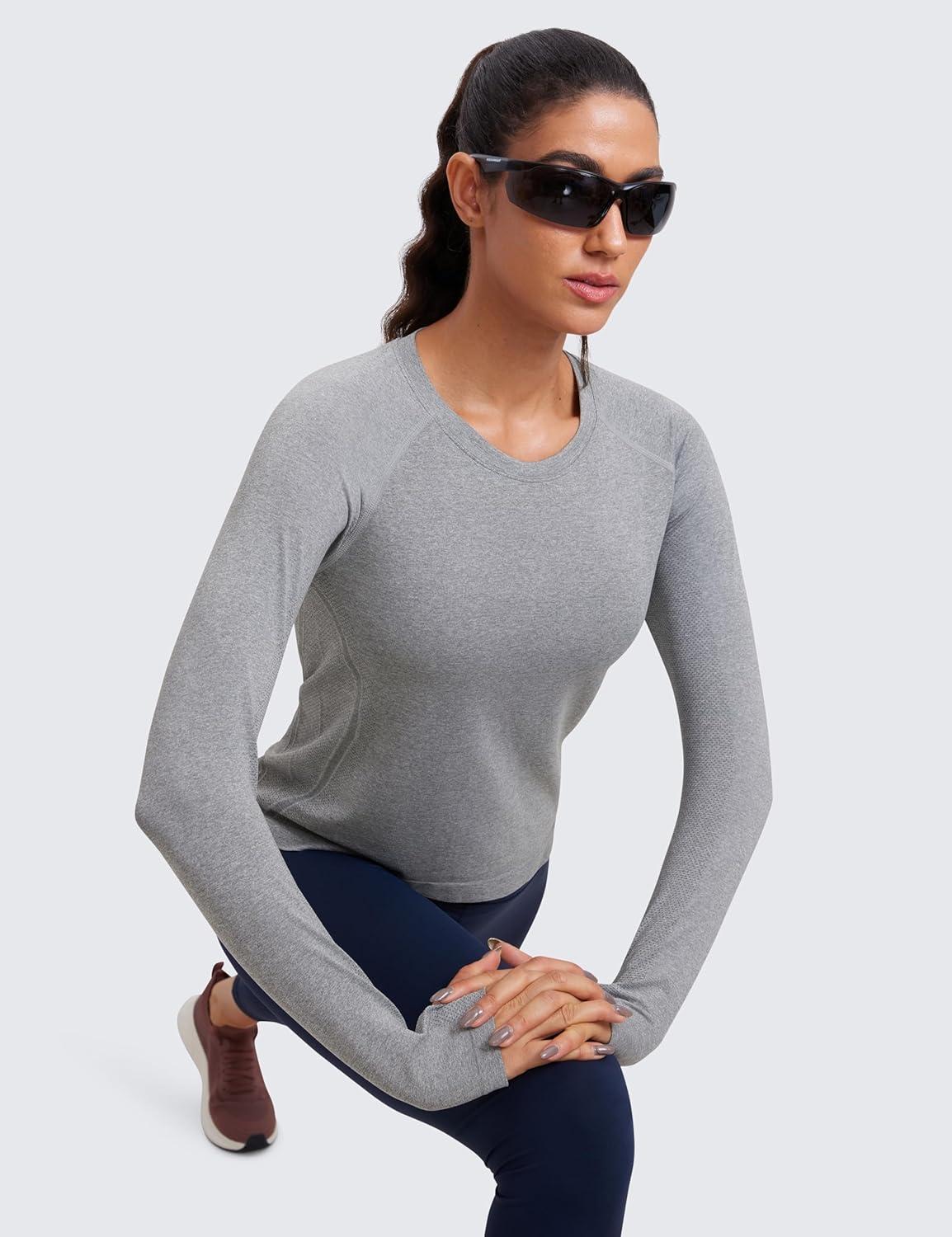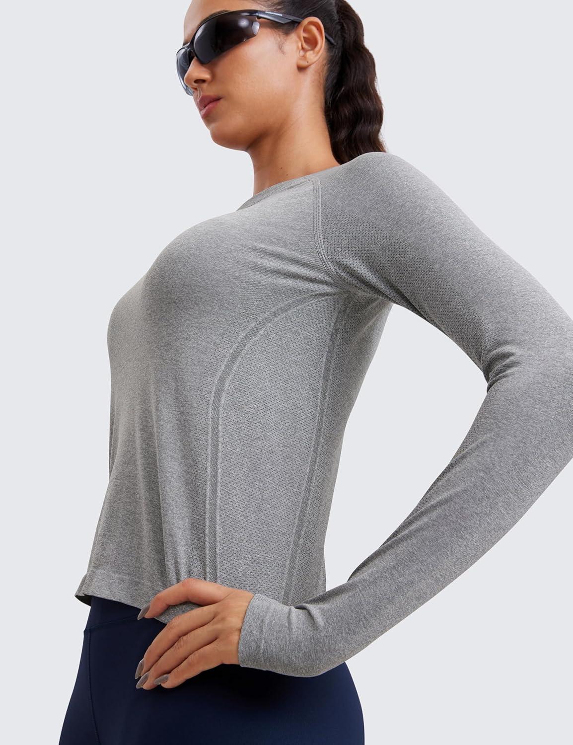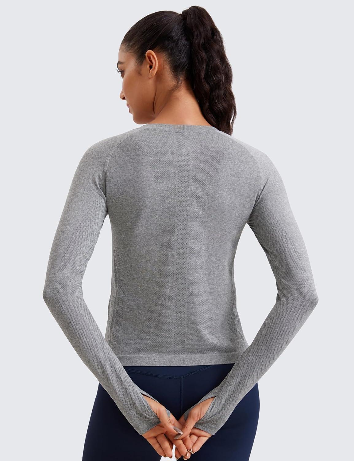 CRZ YOGA Seamless Long Sleeve Shirts for Women Waist – Workout Athletic Running Gym Yoga Tops Crewneck Breathable Quick Dry(Slate Grey Marl)