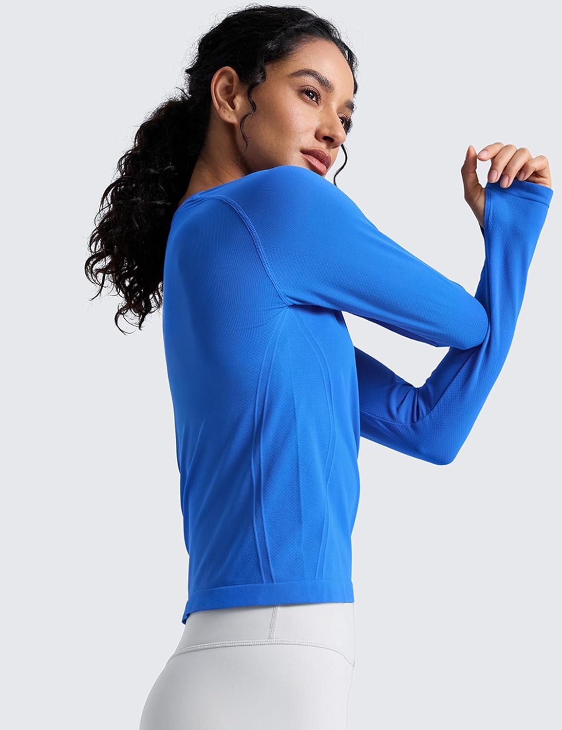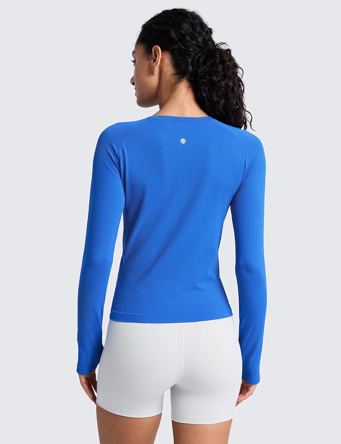 CRZ YOGA Seamless Long Sleeve Shirts for Women Waist – Workout Athletic Running Gym Yoga Tops Crewneck Breathable Quick Dry(Sparkle Blue)