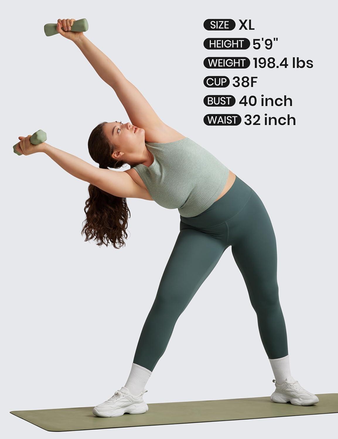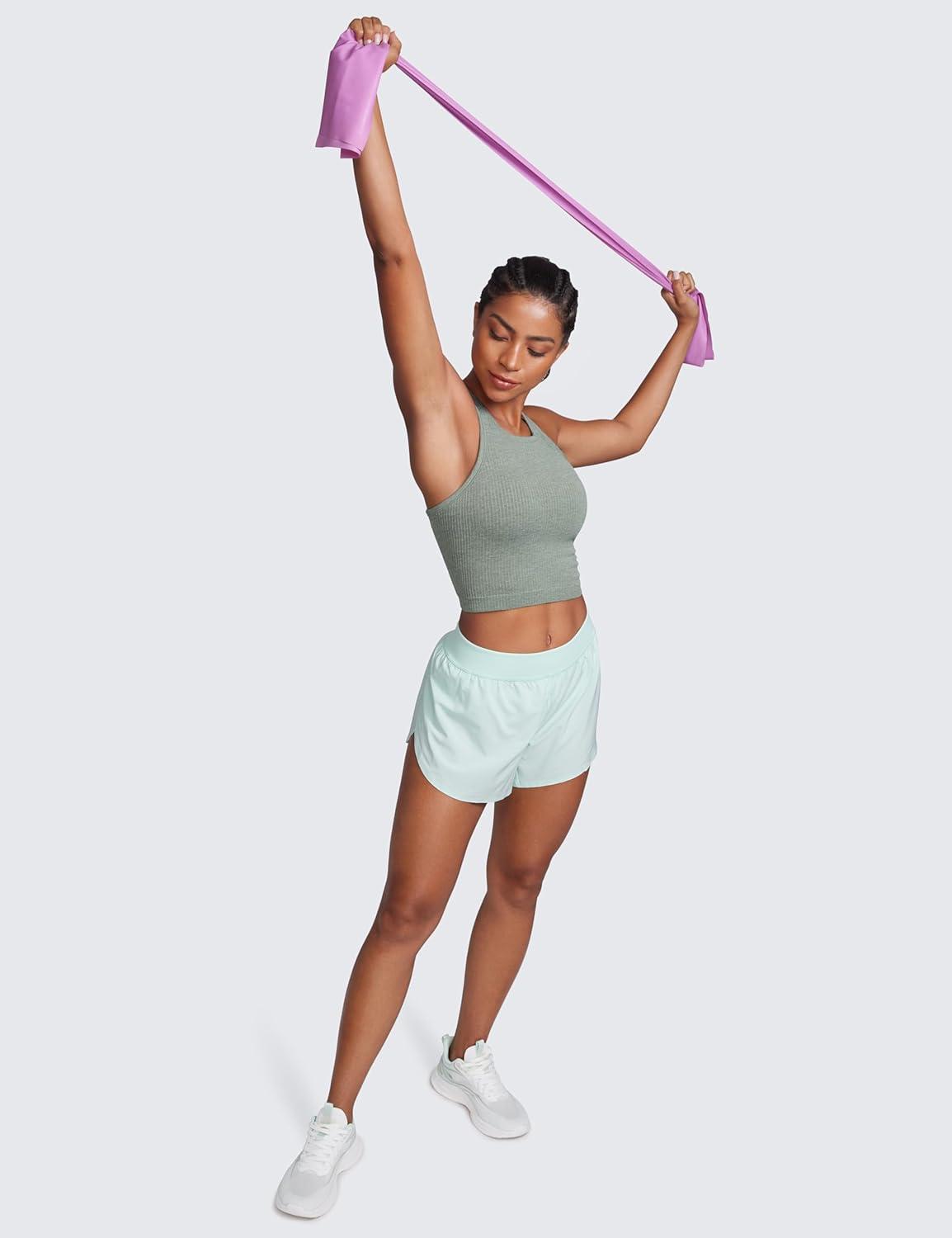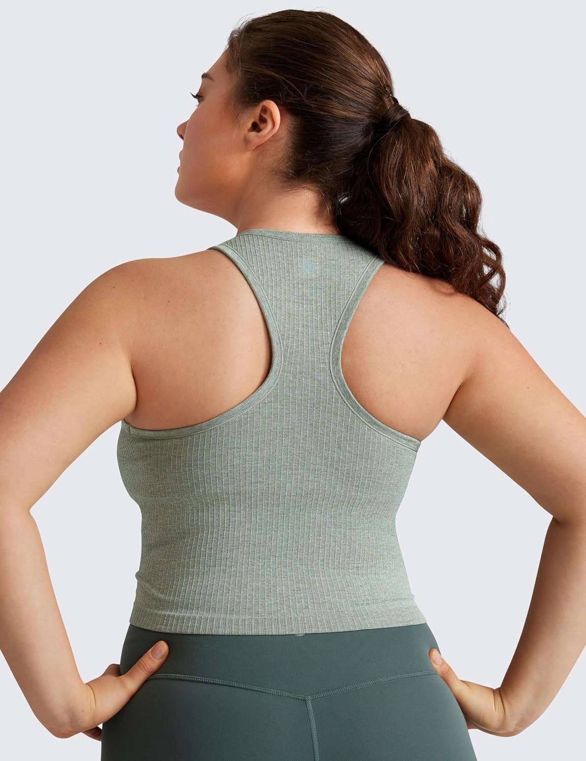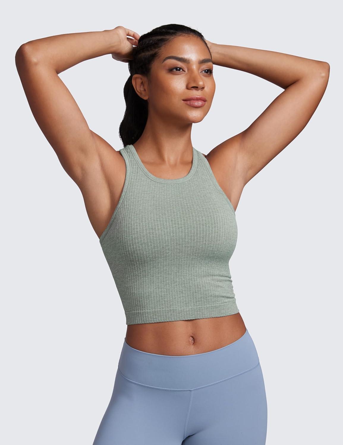 CRZ YOGA Seamless Ribbed High Neck Crop Tank Tops for Women – Longline Racerback Padded Sports Bras(Dark Green Heather)