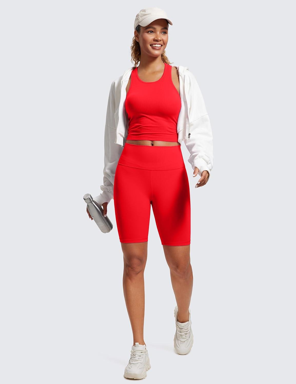 CRZ YOGA Seamless Ribbed High Neck Crop Tank Tops for Women – Longline Racerback Padded Sports Bras(Deep Red)