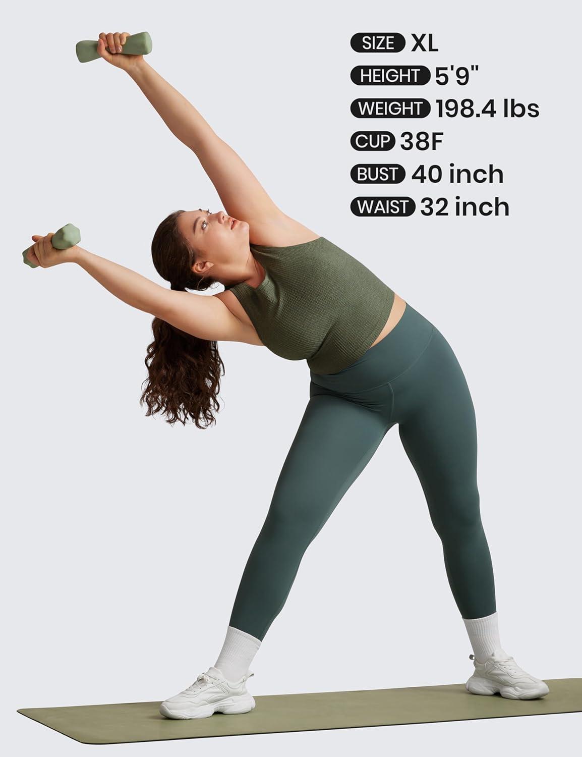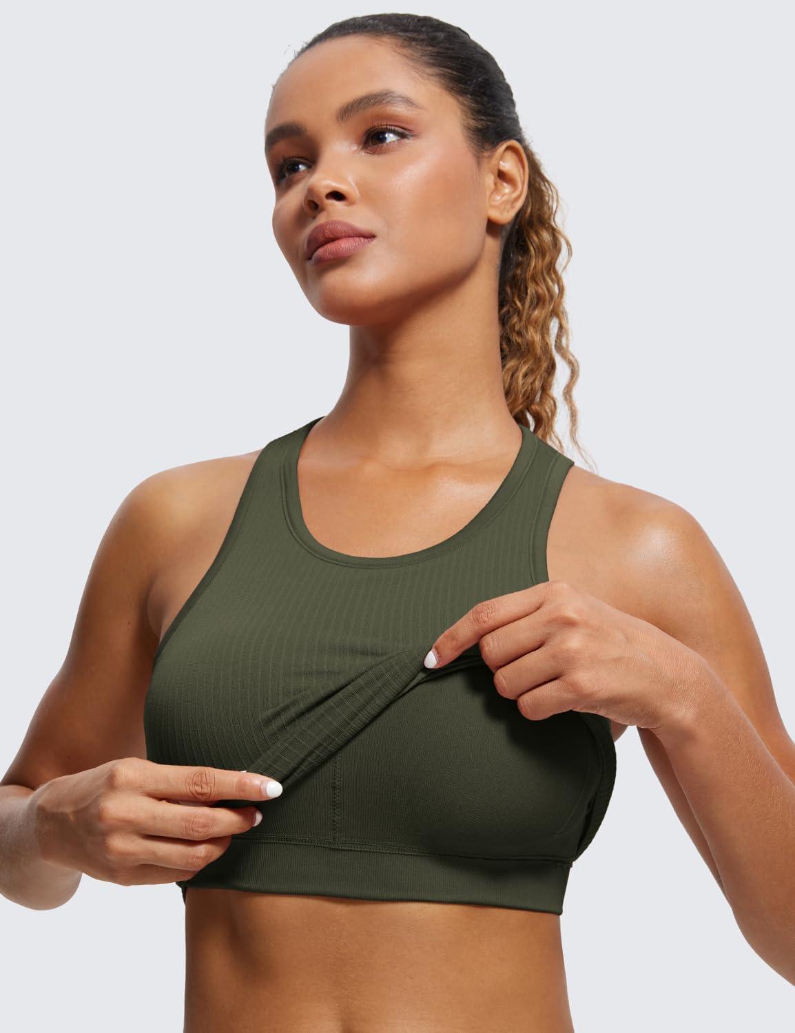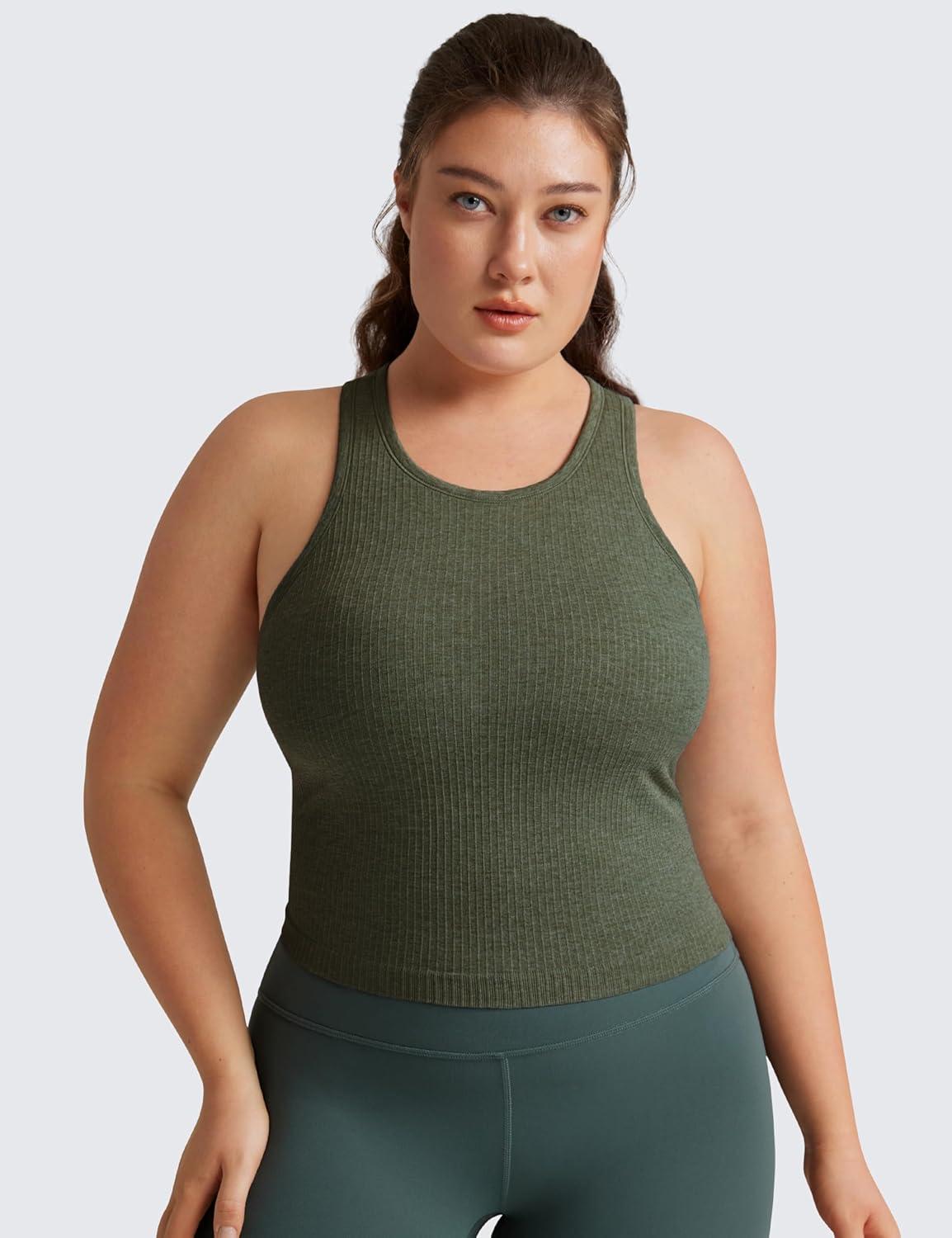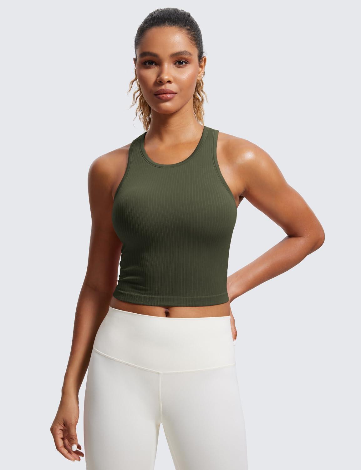 CRZ YOGA Seamless Ribbed High Neck Crop Tank Tops for Women – Longline Racerback Padded Sports Bras(Olive Green)