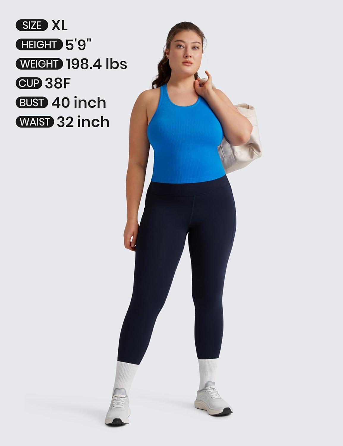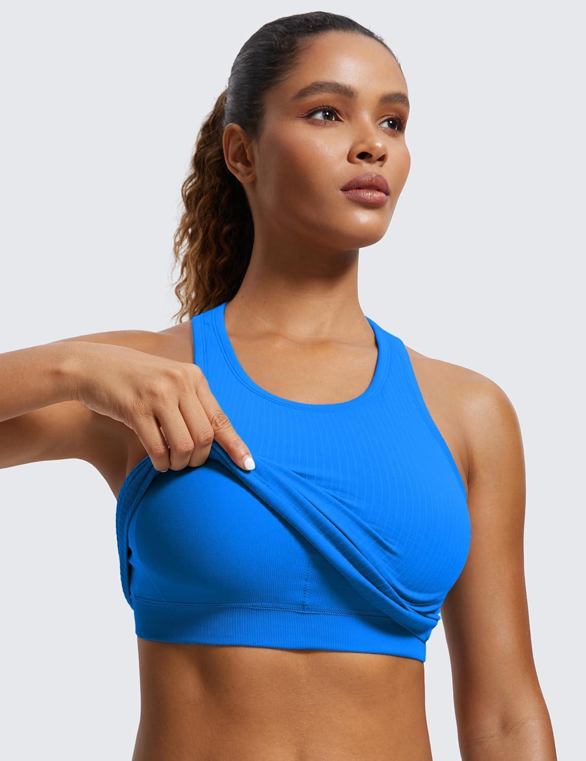 CRZ YOGA Seamless Ribbed High Neck Crop Tank Tops for Women – Longline Racerback Padded Sports Bras(Sparkle Blue)