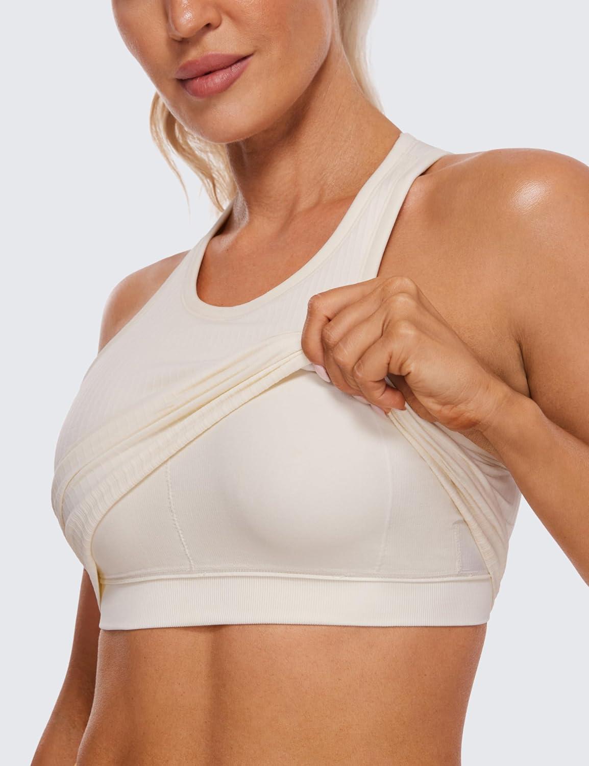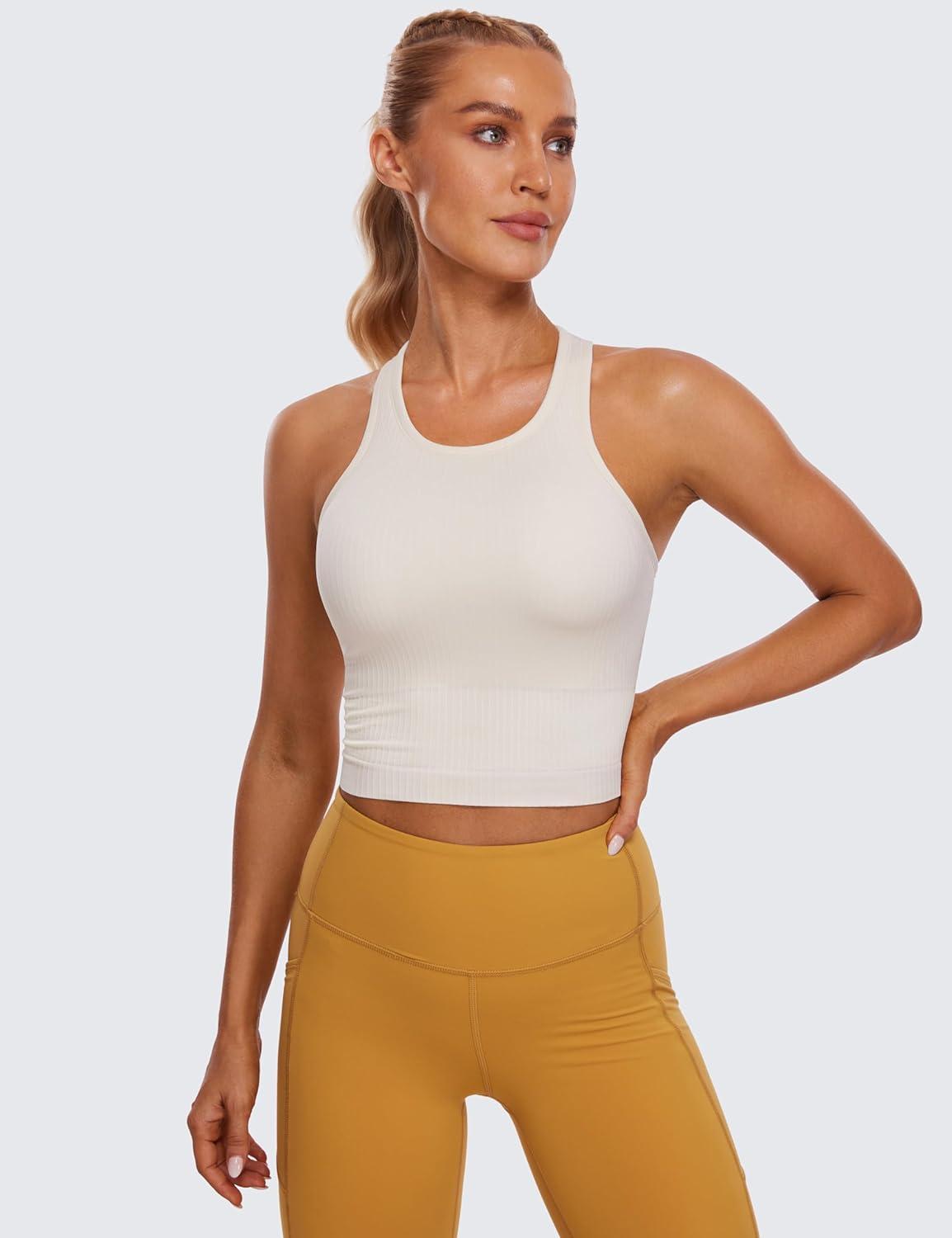 CRZ YOGA Seamless Ribbed High Neck Crop Tank Tops for Women – Longline Racerback Padded Sports Bras(White Apricot)