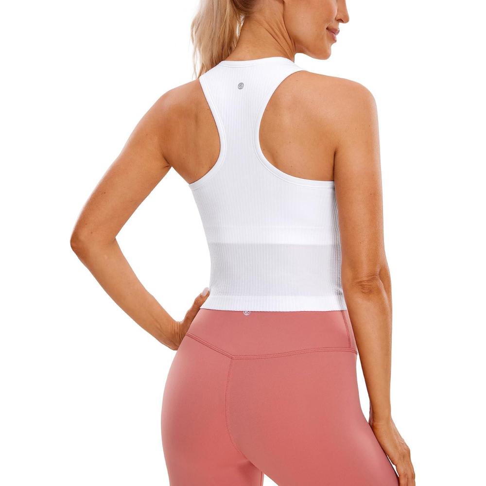 CRZ YOGA Seamless Ribbed High Neck Crop Tank Tops for Women – Longline Racerback Padded Sports Bras(White)