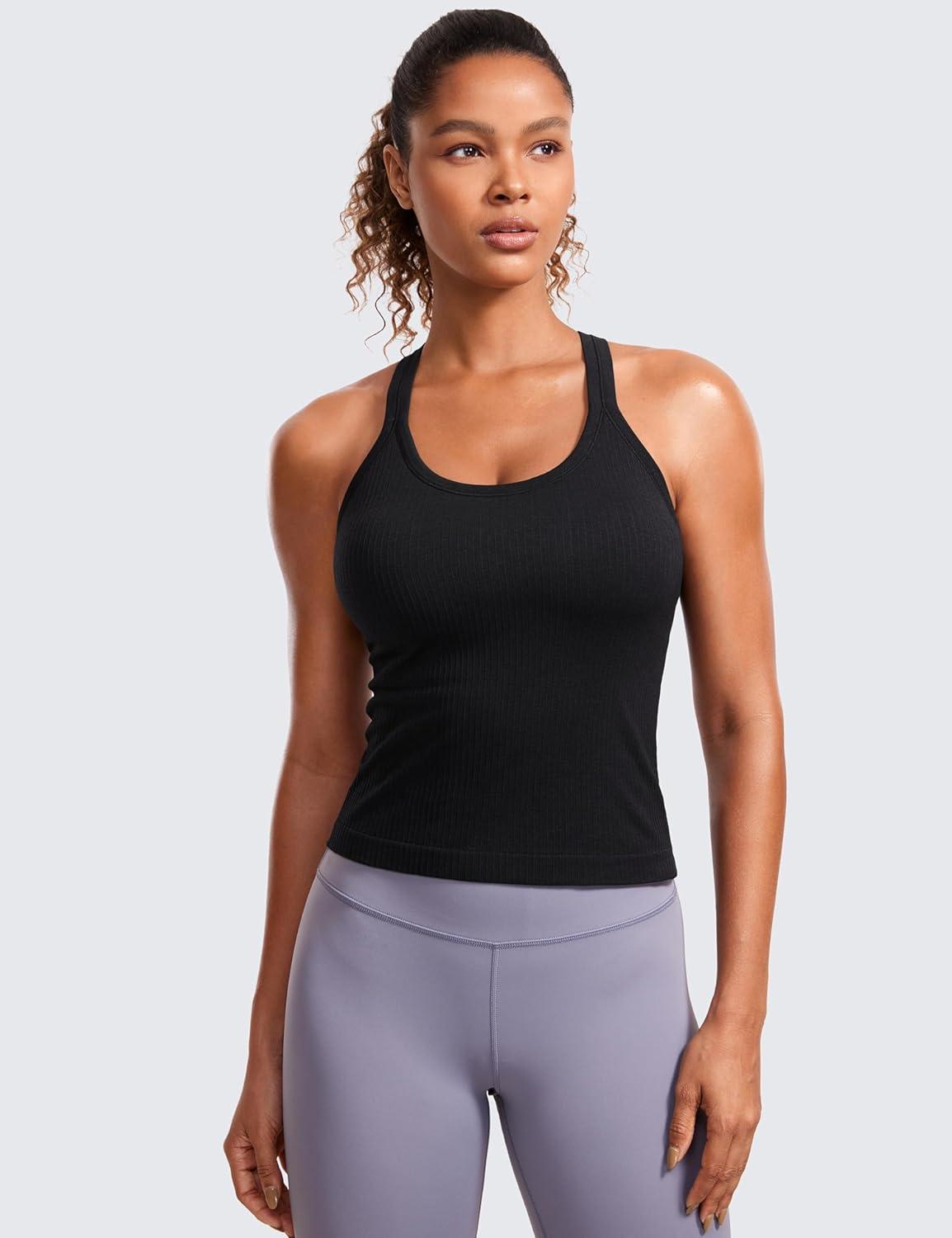 CRZ YOGA Seamless Ribbed Scoop Neck Tank Top for Women – Workout Racerback Padded Athletic Camisole with Built in Bra(Black)