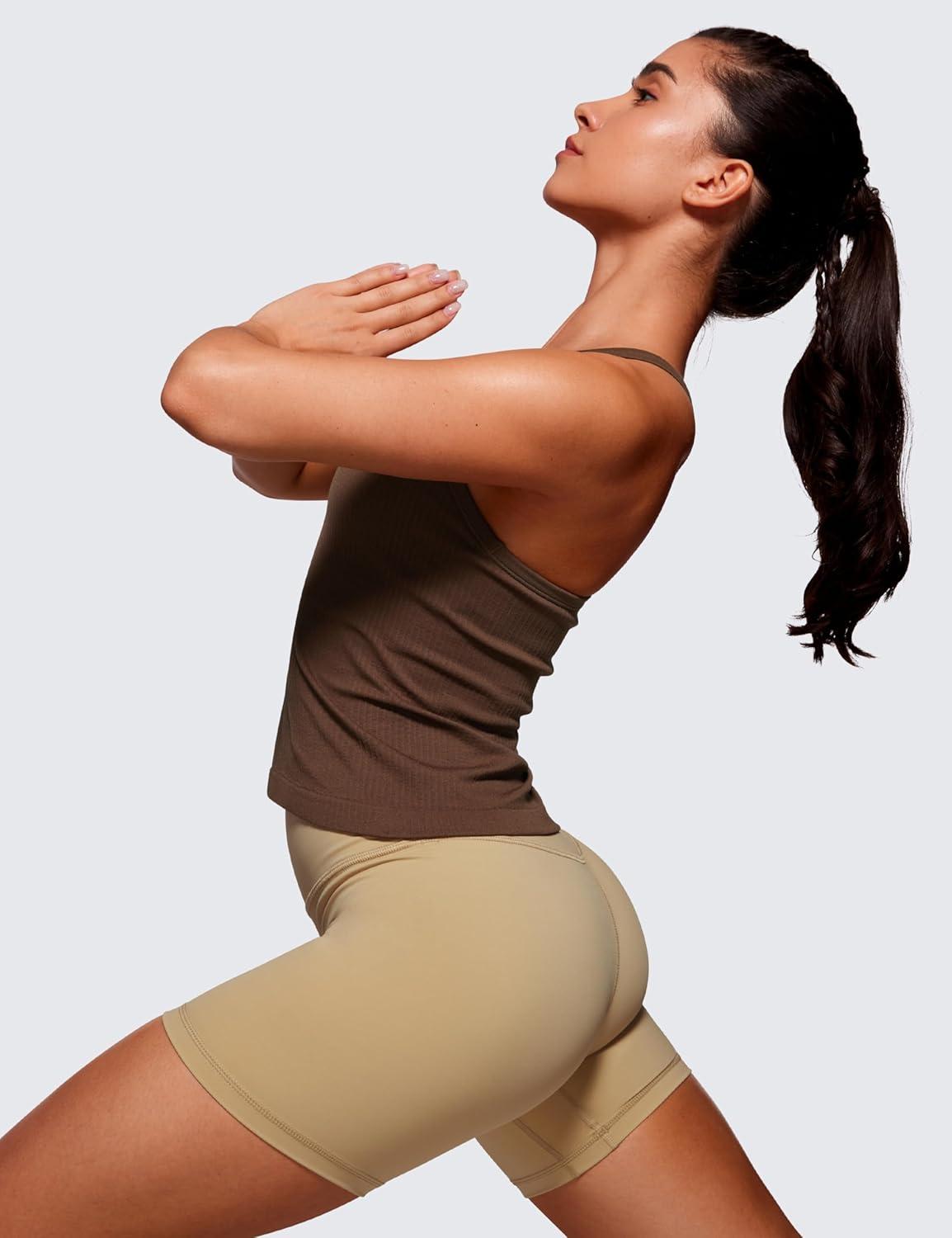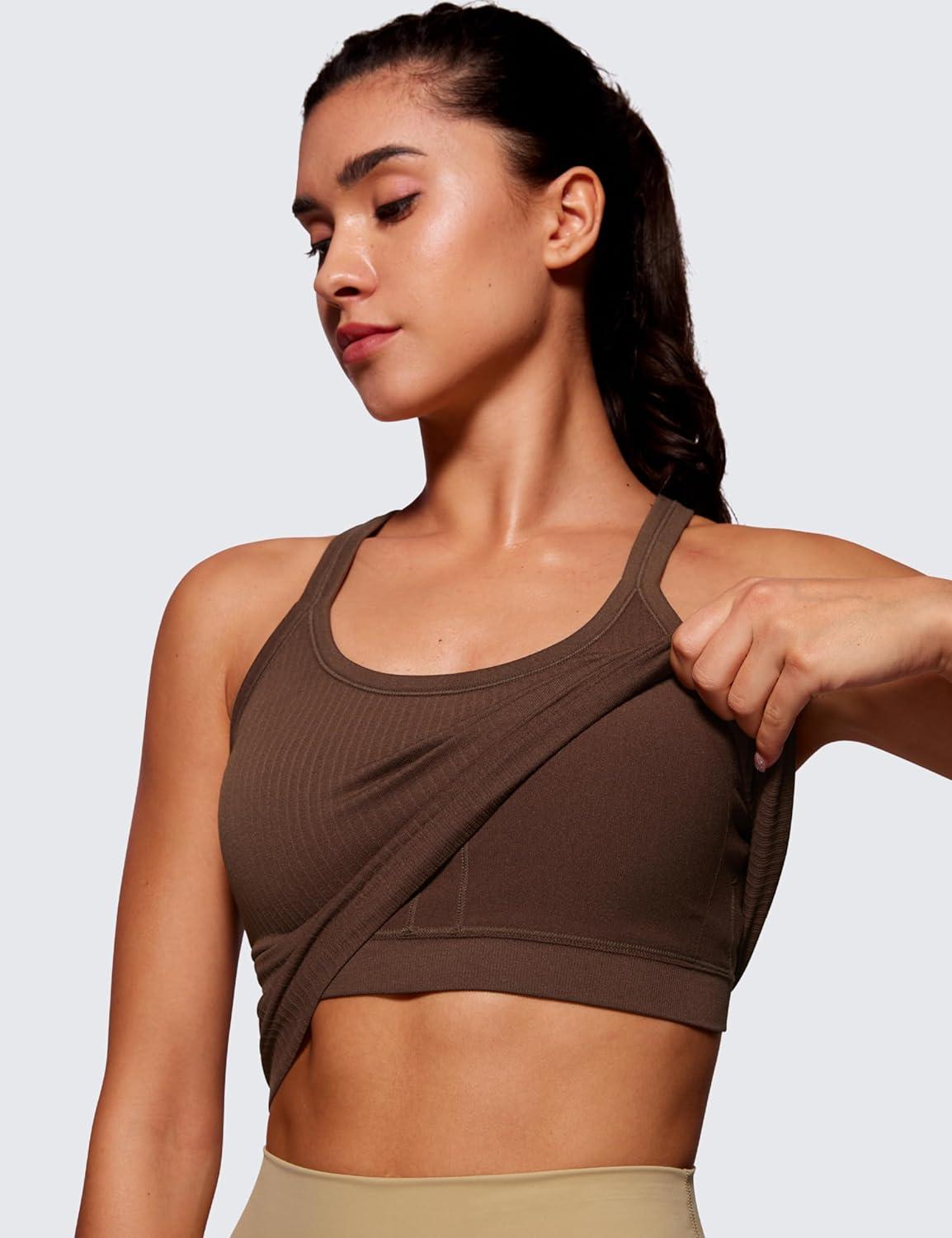 CRZ YOGA Seamless Ribbed Scoop Neck Tank Top for Women – Workout Racerback Padded Athletic Camisole with Built in Bra(Coffee Brown)