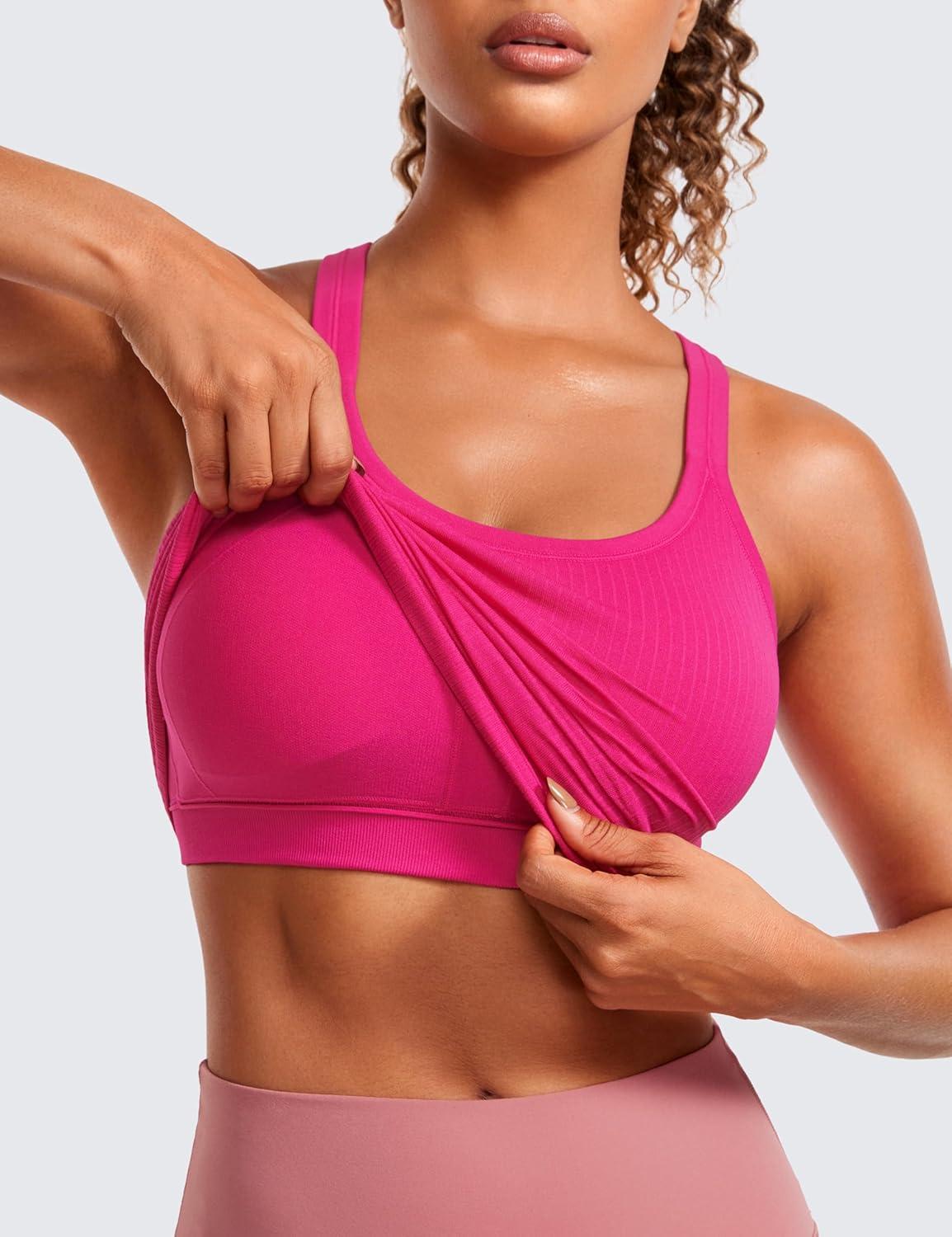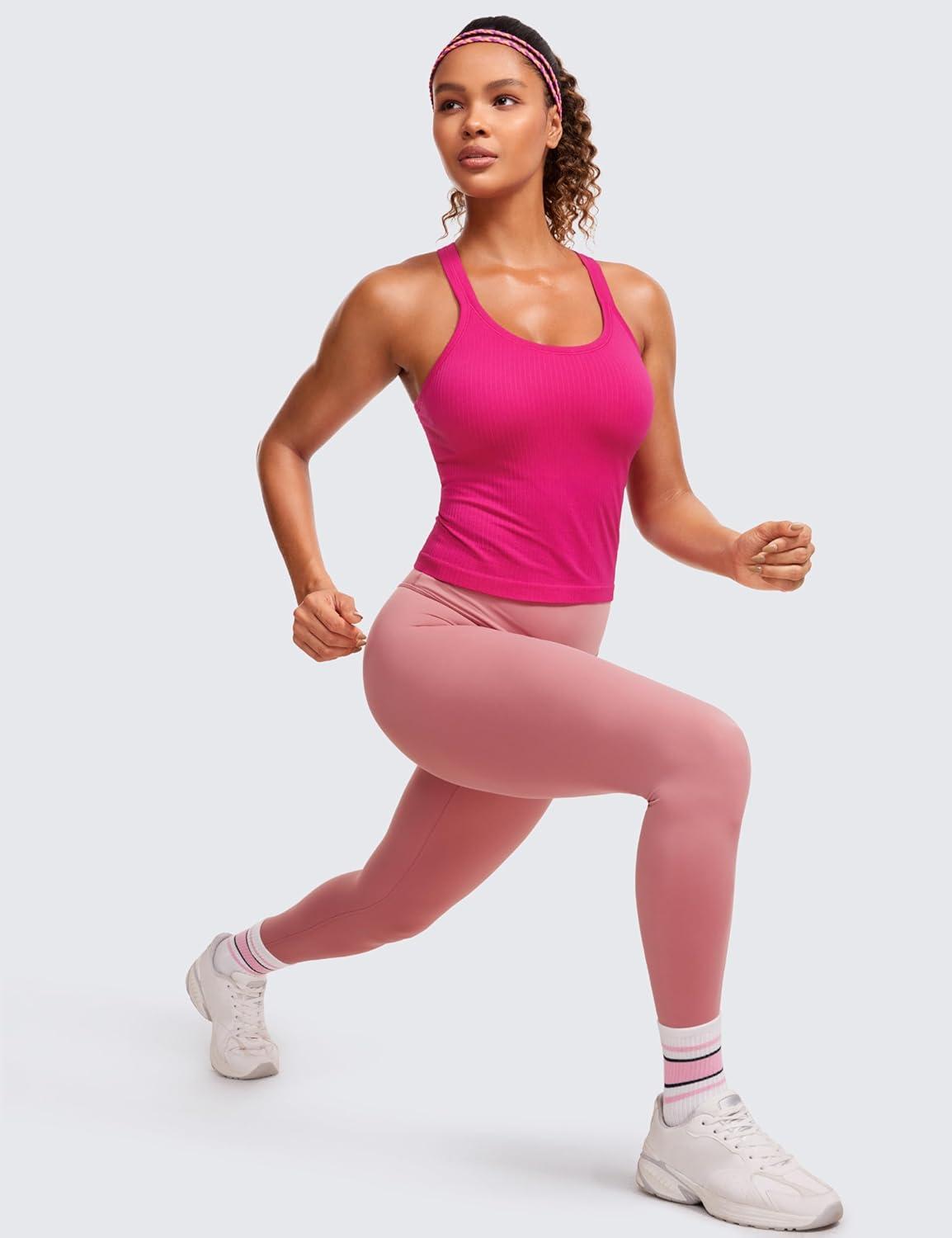 CRZ YOGA Seamless Ribbed Scoop Neck Tank Top for Women – Workout Racerback Padded Athletic Camisole with Built in Bra(Granita Pink)