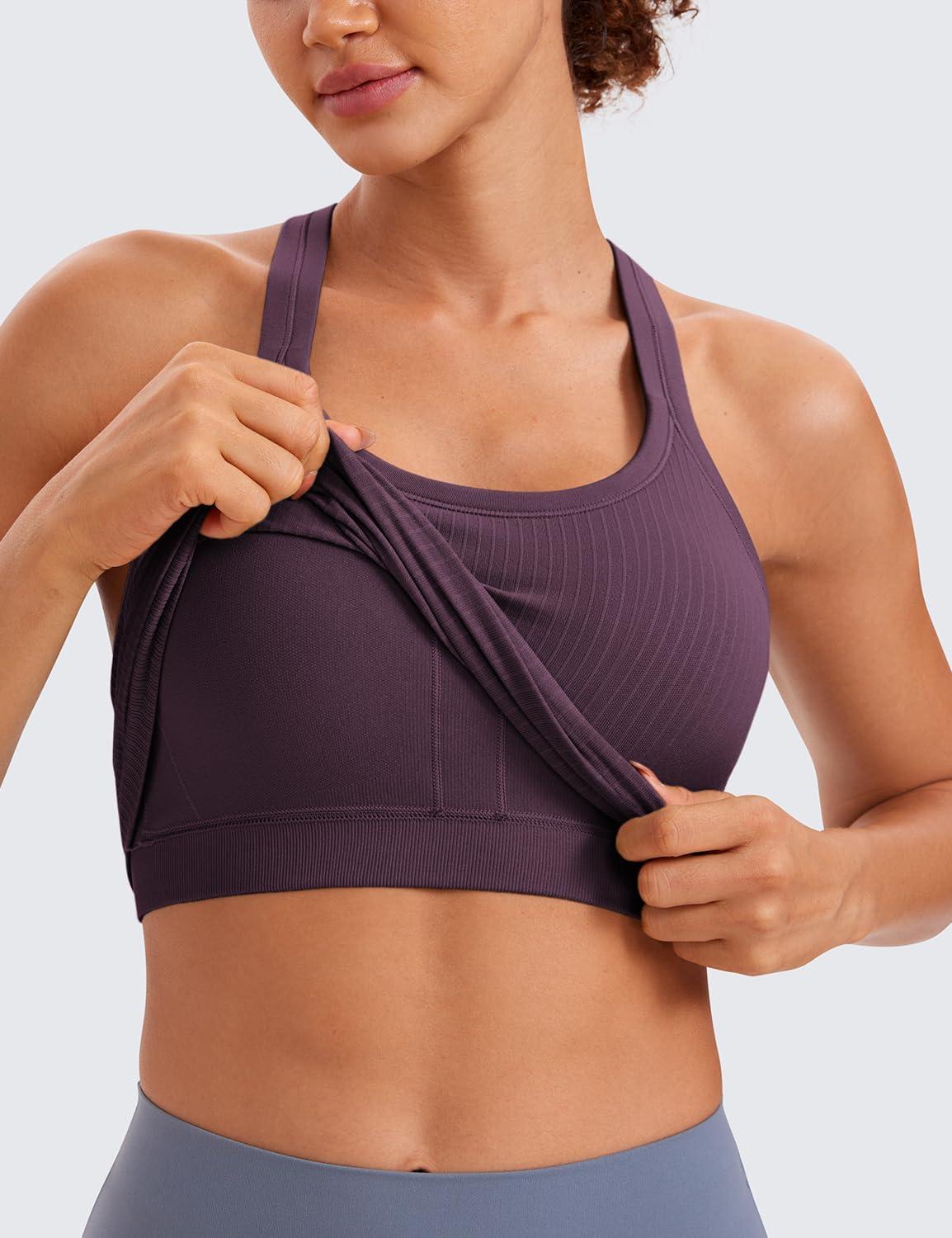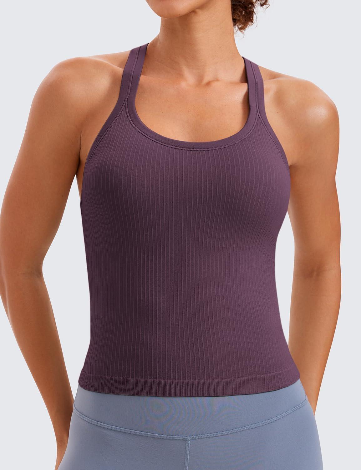 CRZ YOGA Seamless Ribbed Scoop Neck Tank Top for Women – Workout Racerback Padded Athletic Camisole with Built in Bra(Grape Thistle Purple)