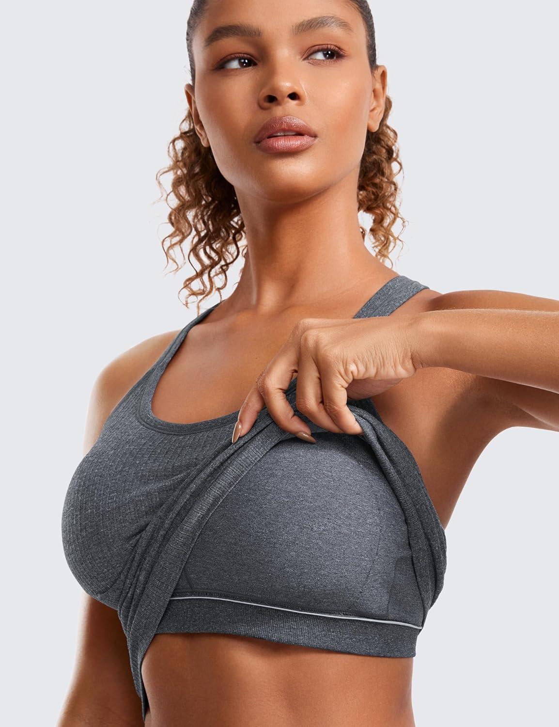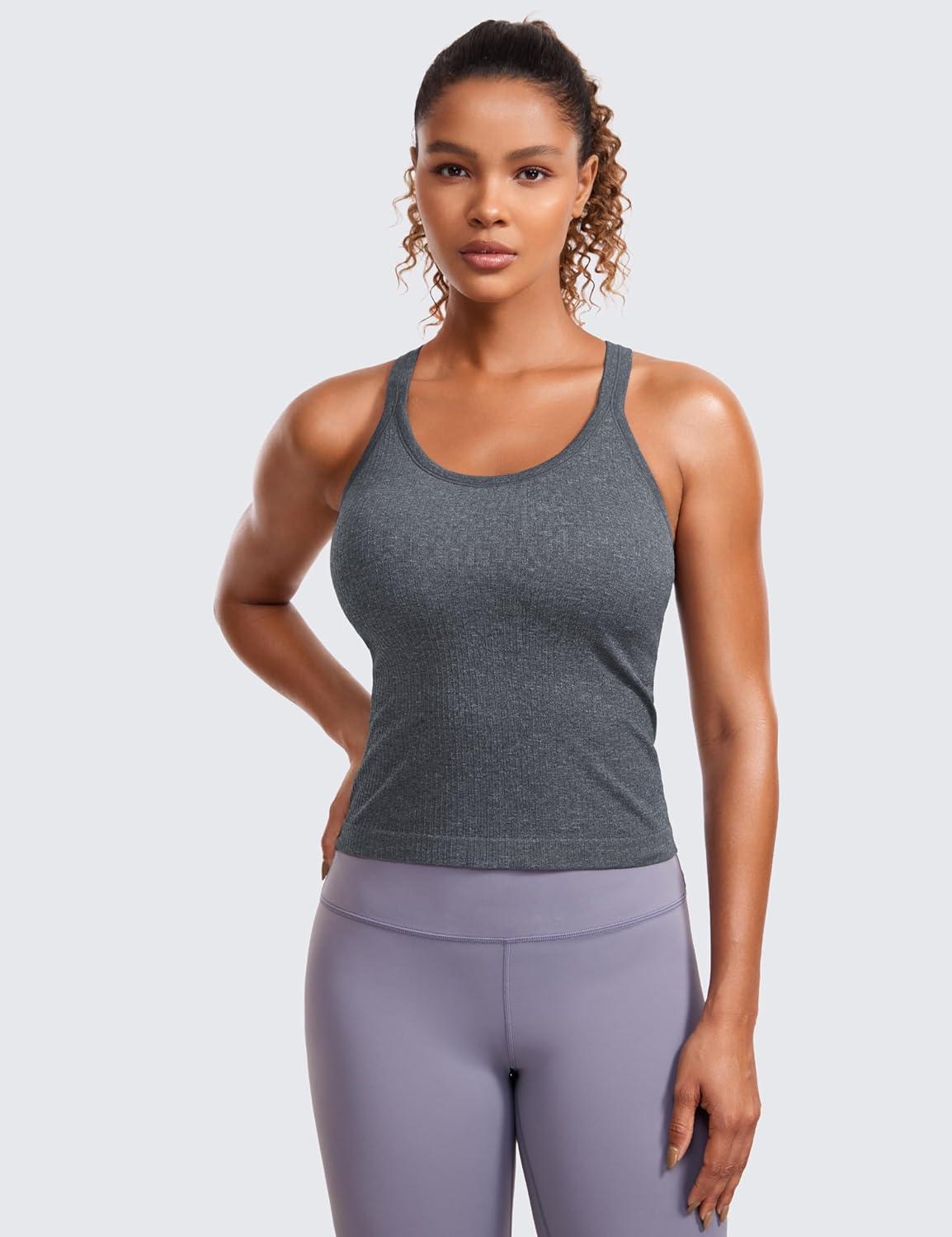 CRZ YOGA Seamless Ribbed Scoop Neck Tank Top for Women – Workout Racerback Padded Athletic Camisole with Built in Bra(Light Gray 7)
