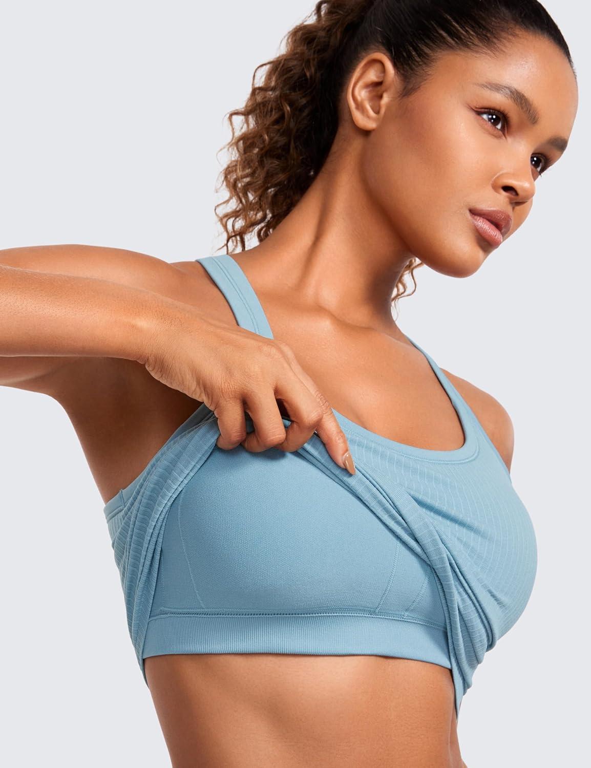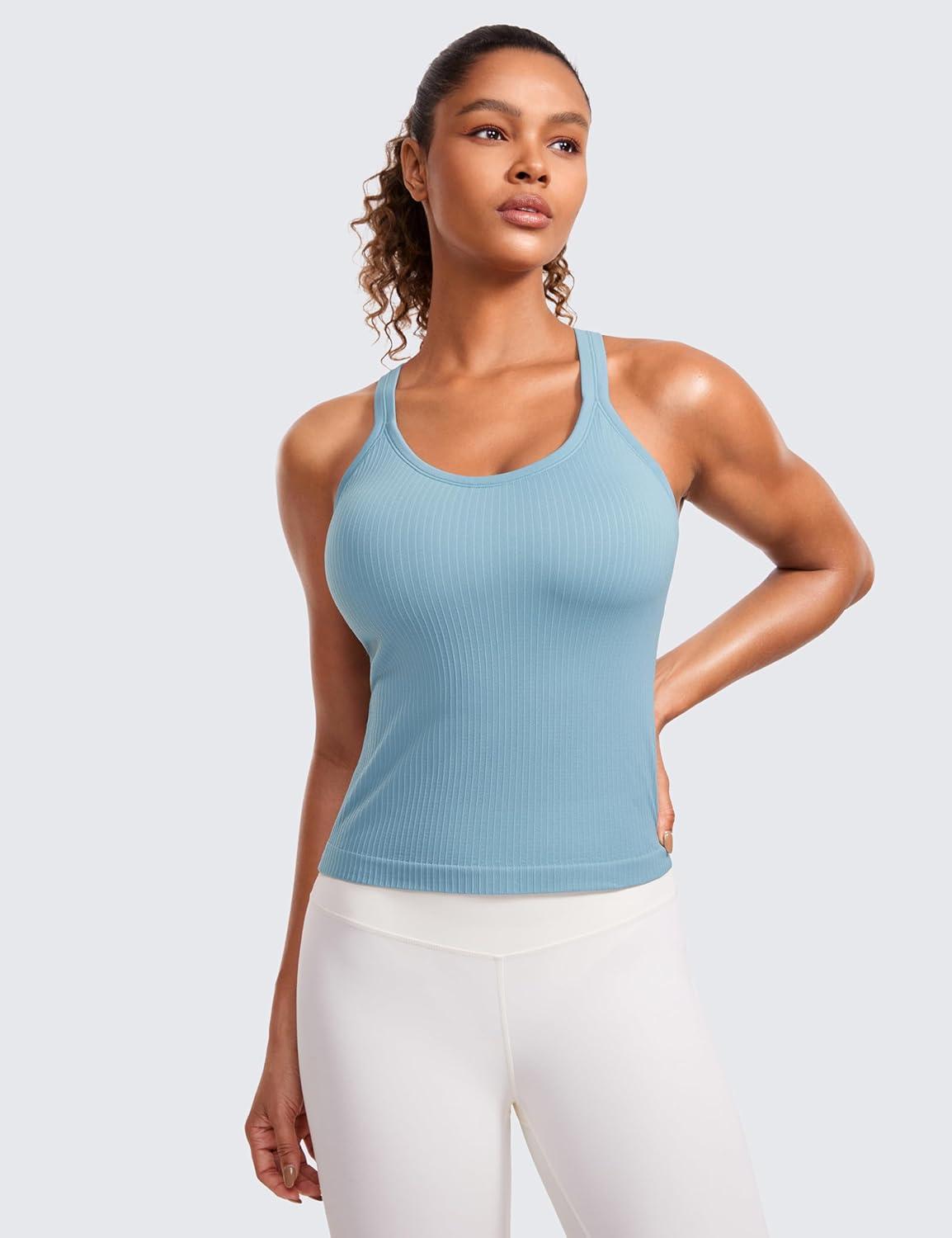 CRZ YOGA Seamless Ribbed Scoop Neck Tank Top for Women – Workout Racerback Padded Athletic Camisole with Built in Bra(Pure Blue)