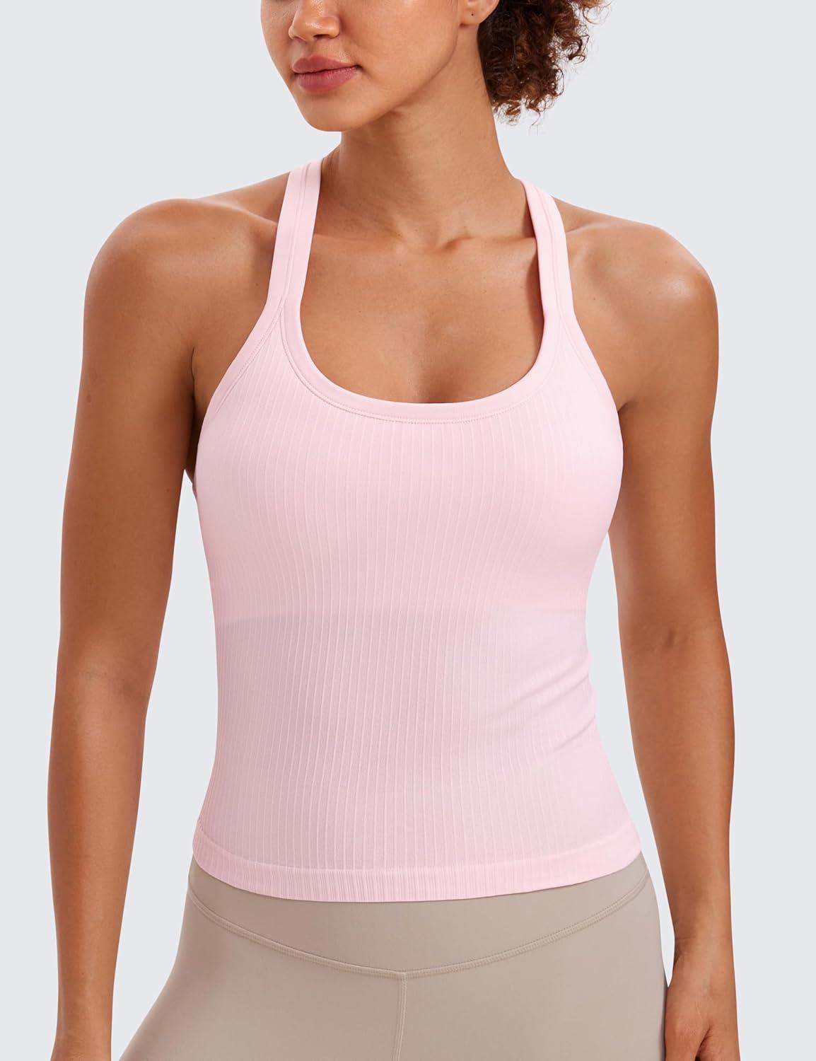 CRZ YOGA Seamless Ribbed Scoop Neck Tank Top for Women – Workout Racerback Padded Athletic Camisole with Built in Bra(Strawberry Pink)