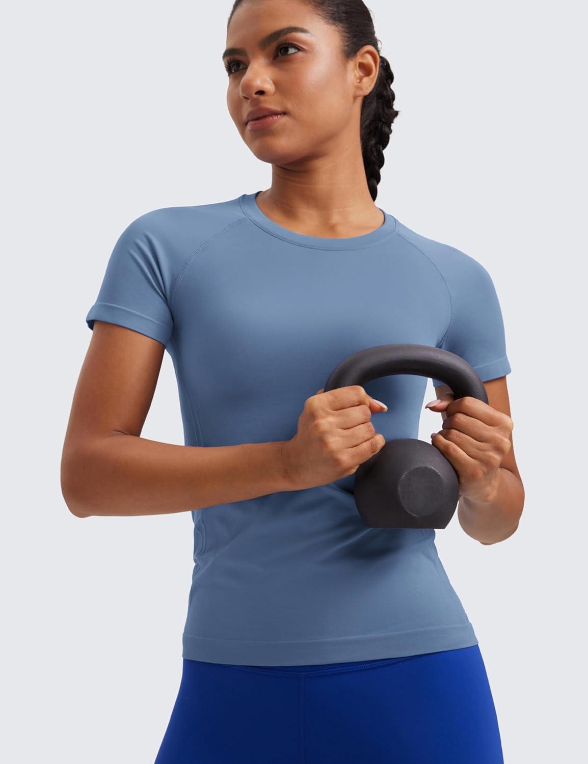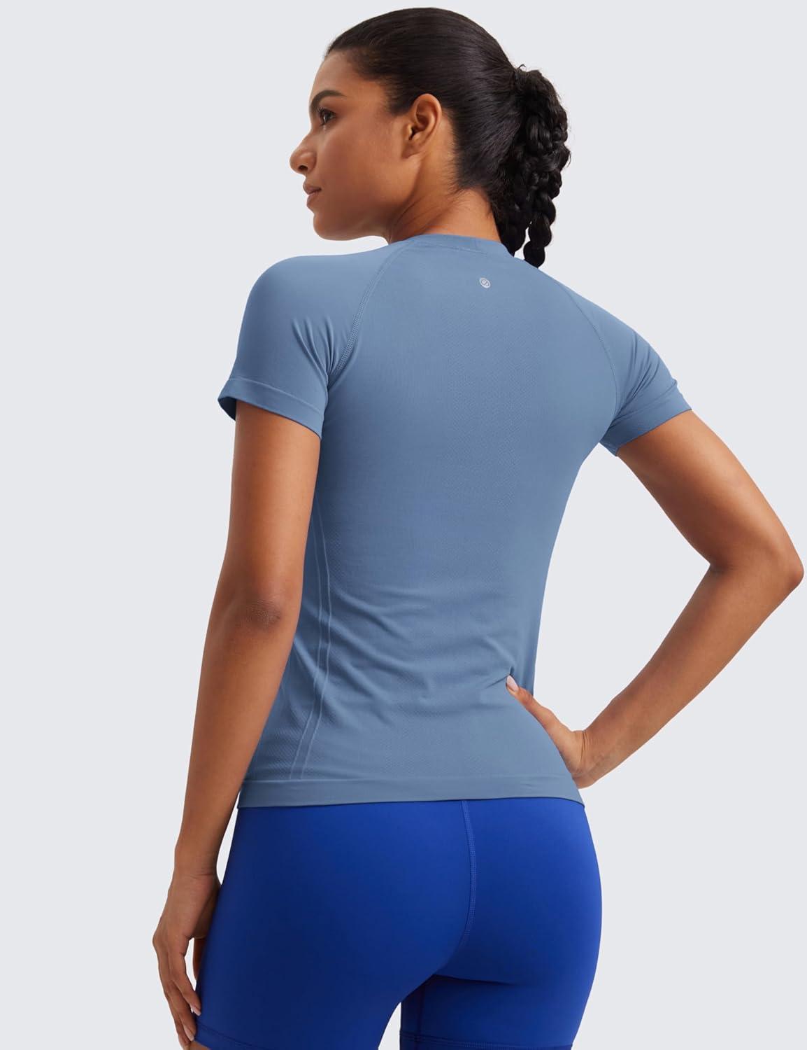 CRZ YOGA Seamless Workout Tops for Women Hip Length – Athletic Running Gym Yoga Short Sleeve Shirts Breathable Crewneck Tees(Oasis Blue)